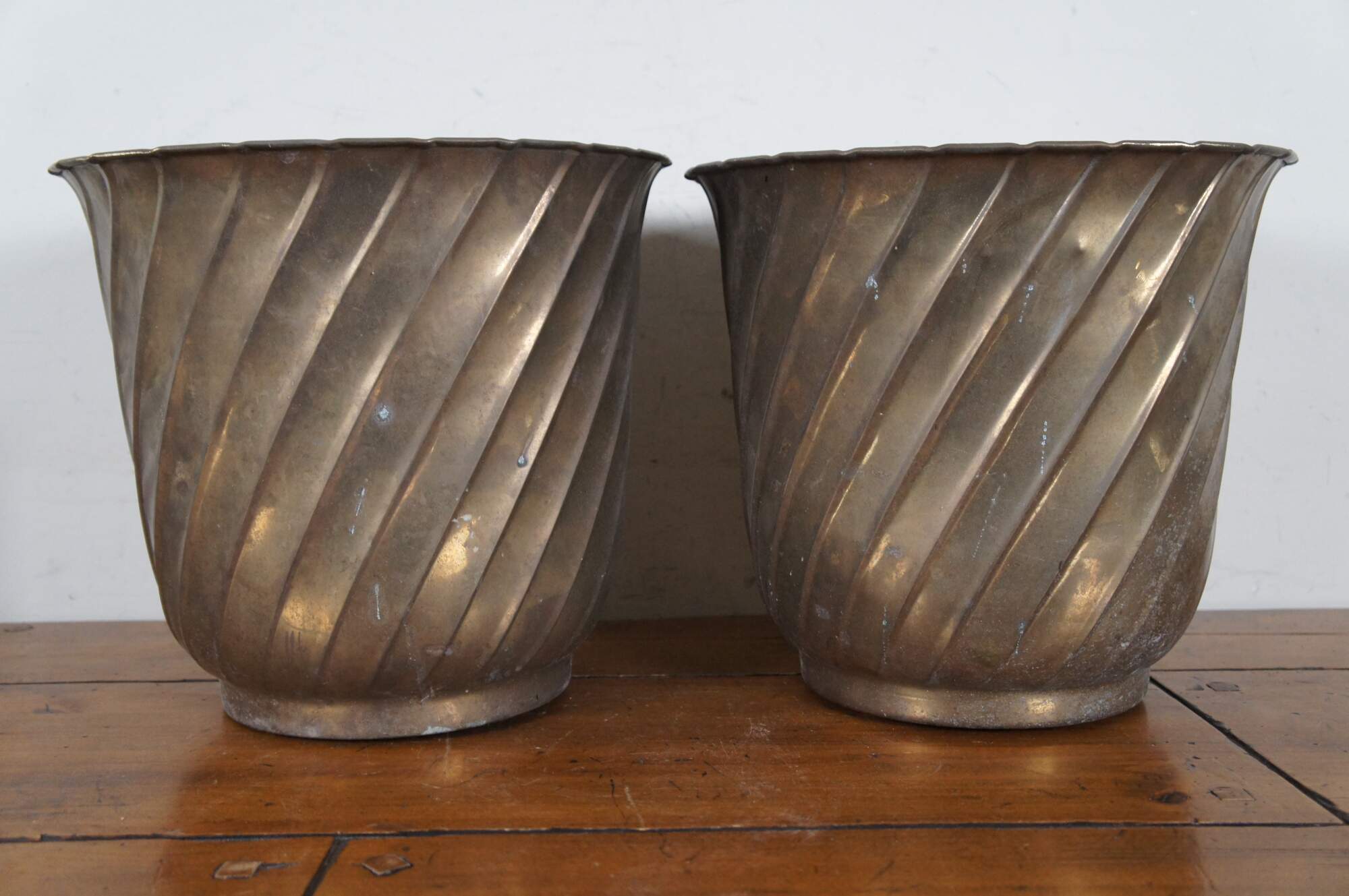 Two vintage brass planters / cachepots or garbage / trash cans featuring sprial design with flared rim. Made in India.