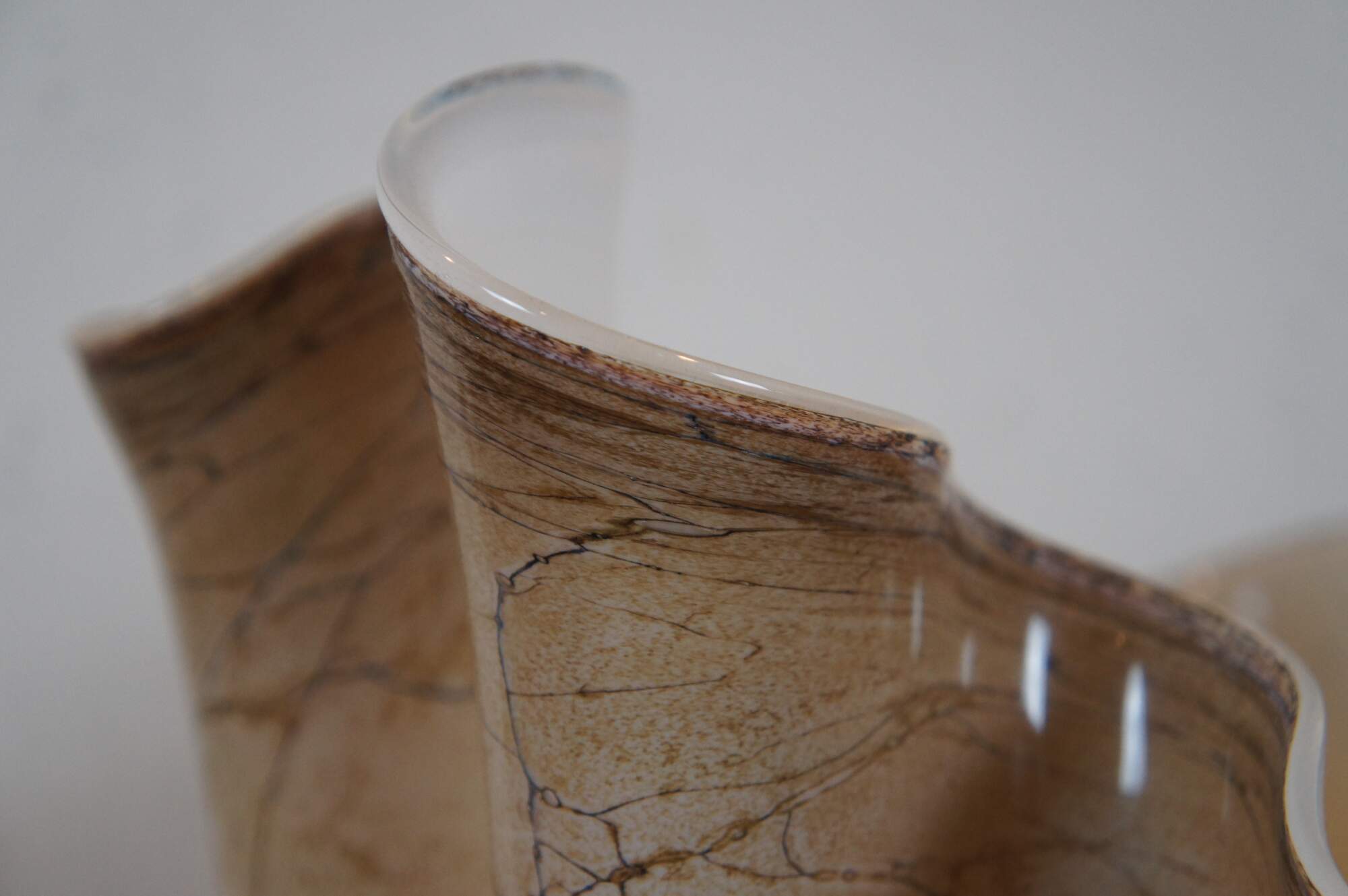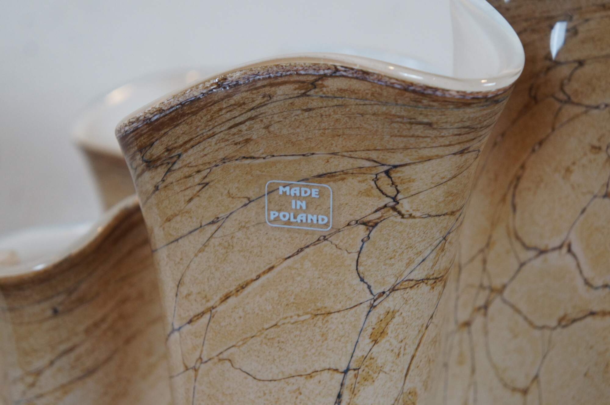 Large vintage Polish hand blown art glass centerpiece flower vase featuring a brown marble ruffled handkerchief design. Made in Poland by Zorza.