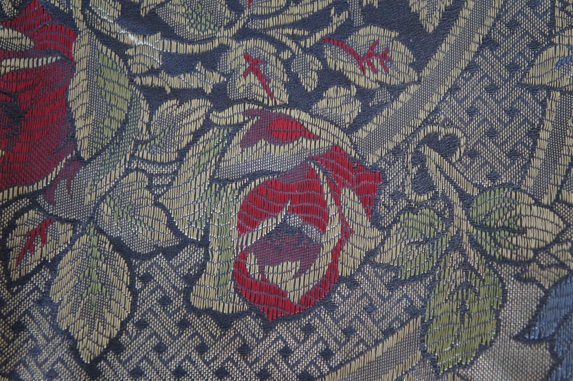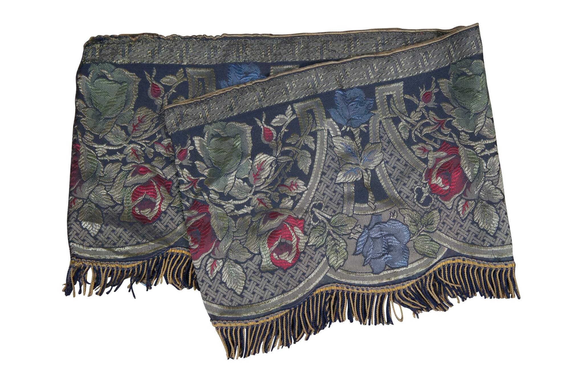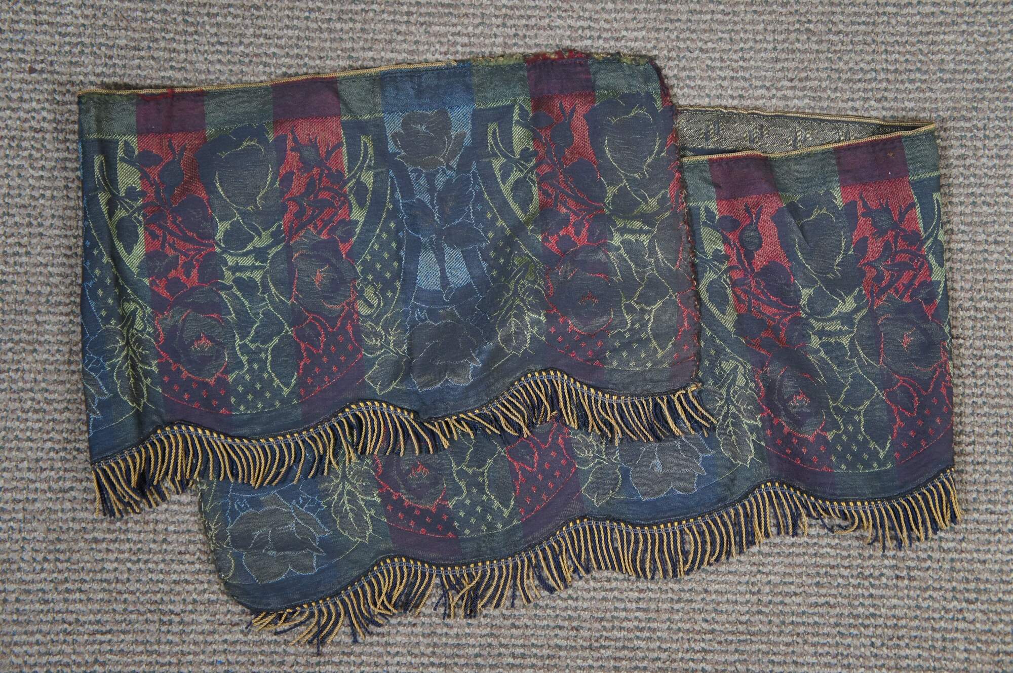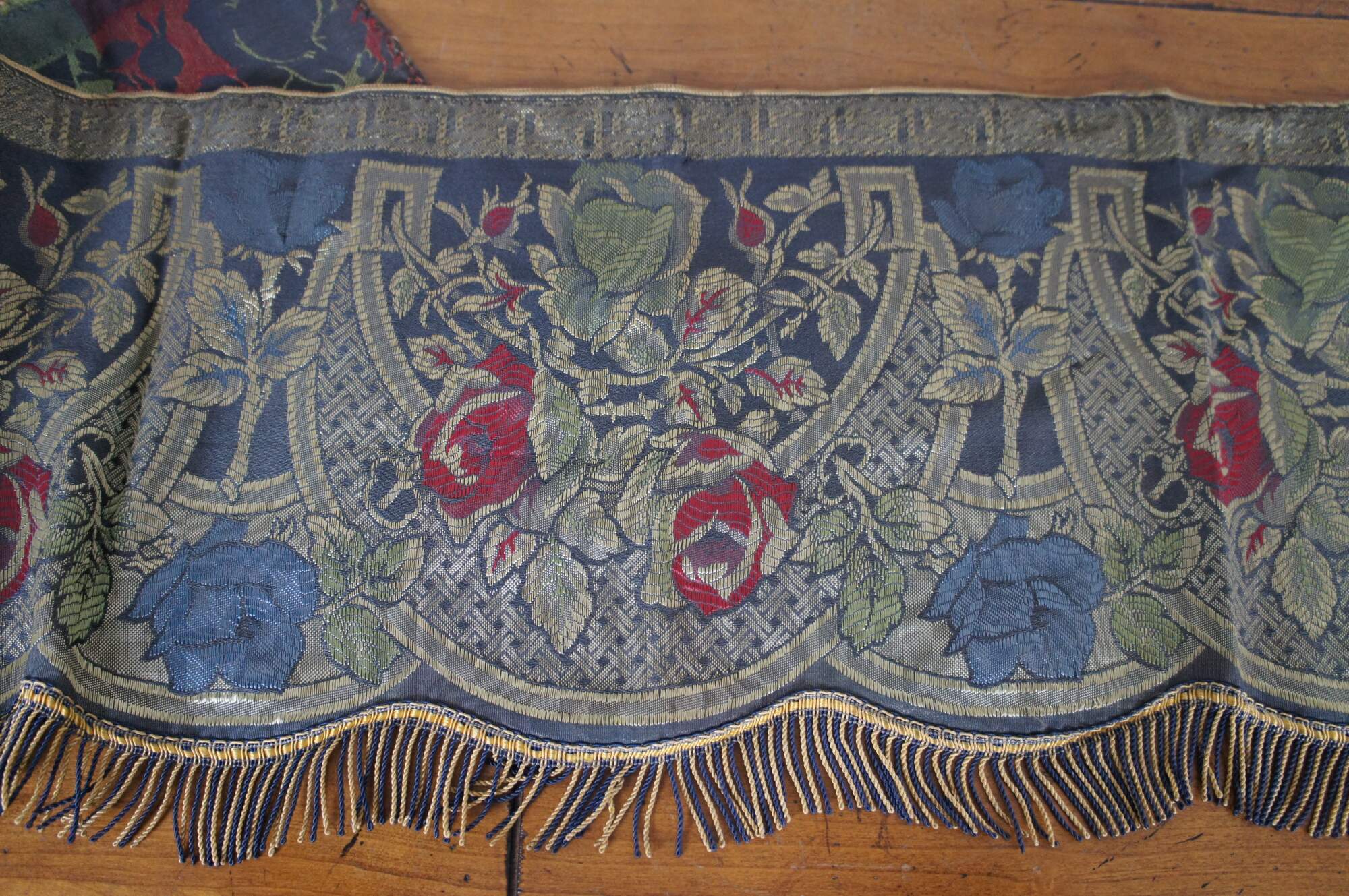 Vintage floral swag of roses stitched valence or tapestry with serpentine fringe.