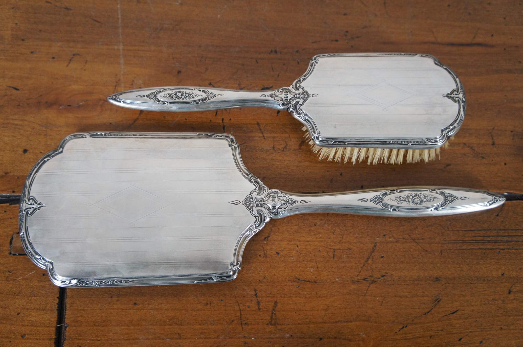 Impressive antique eight piece vanity grooming set by Robert Wallace & Sons featuring Art Deco styling with floral motif. Includes mirror, brush, comb, scissors, file, button hook loop, buffing pad, shoe horn and purple velvet lined box case.