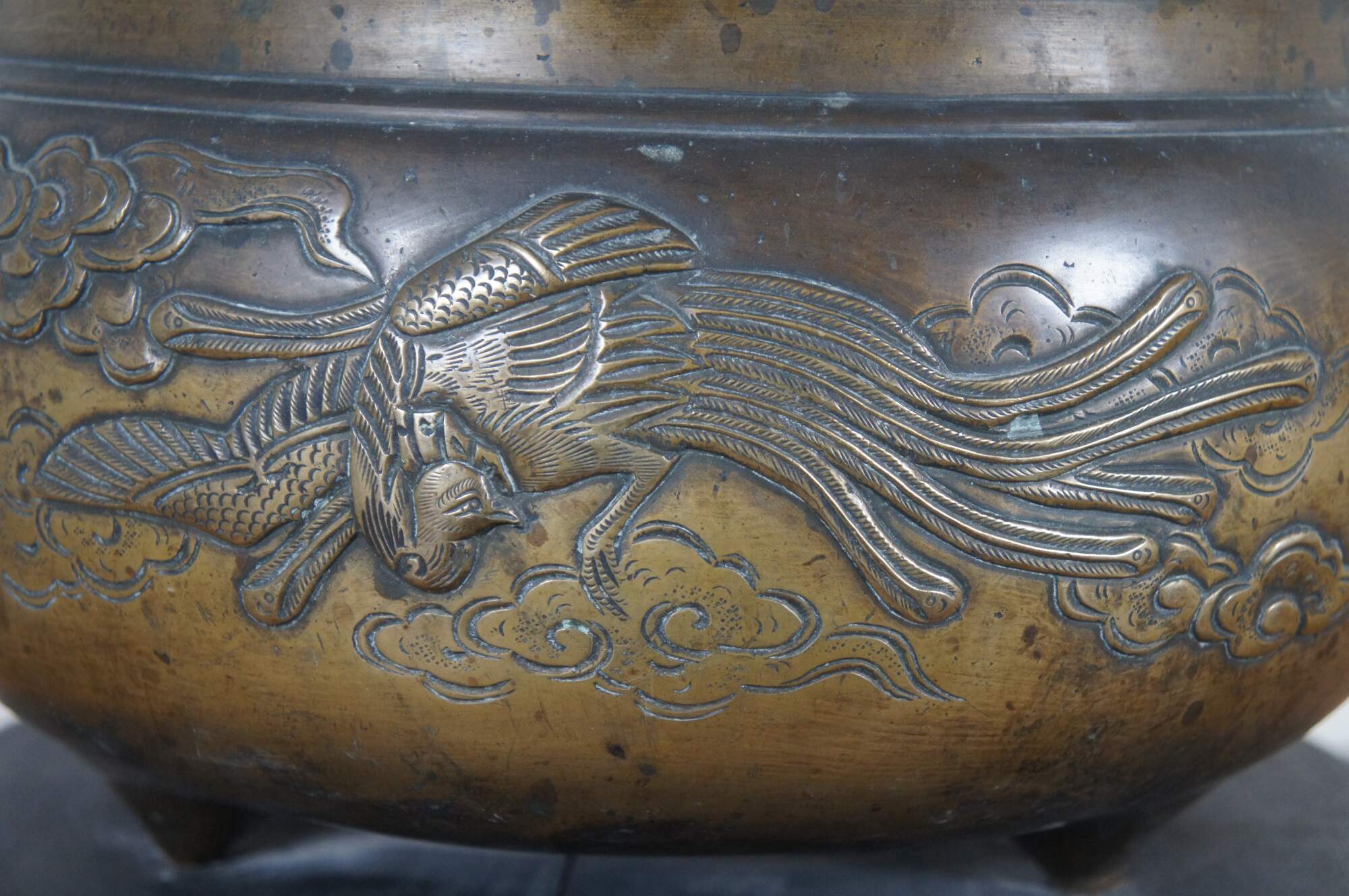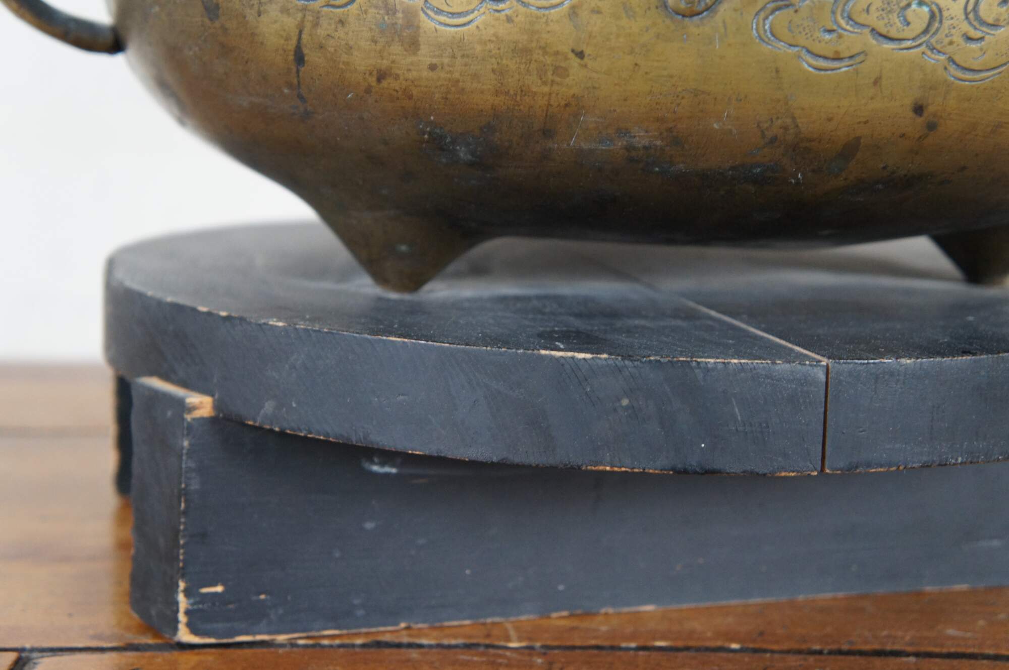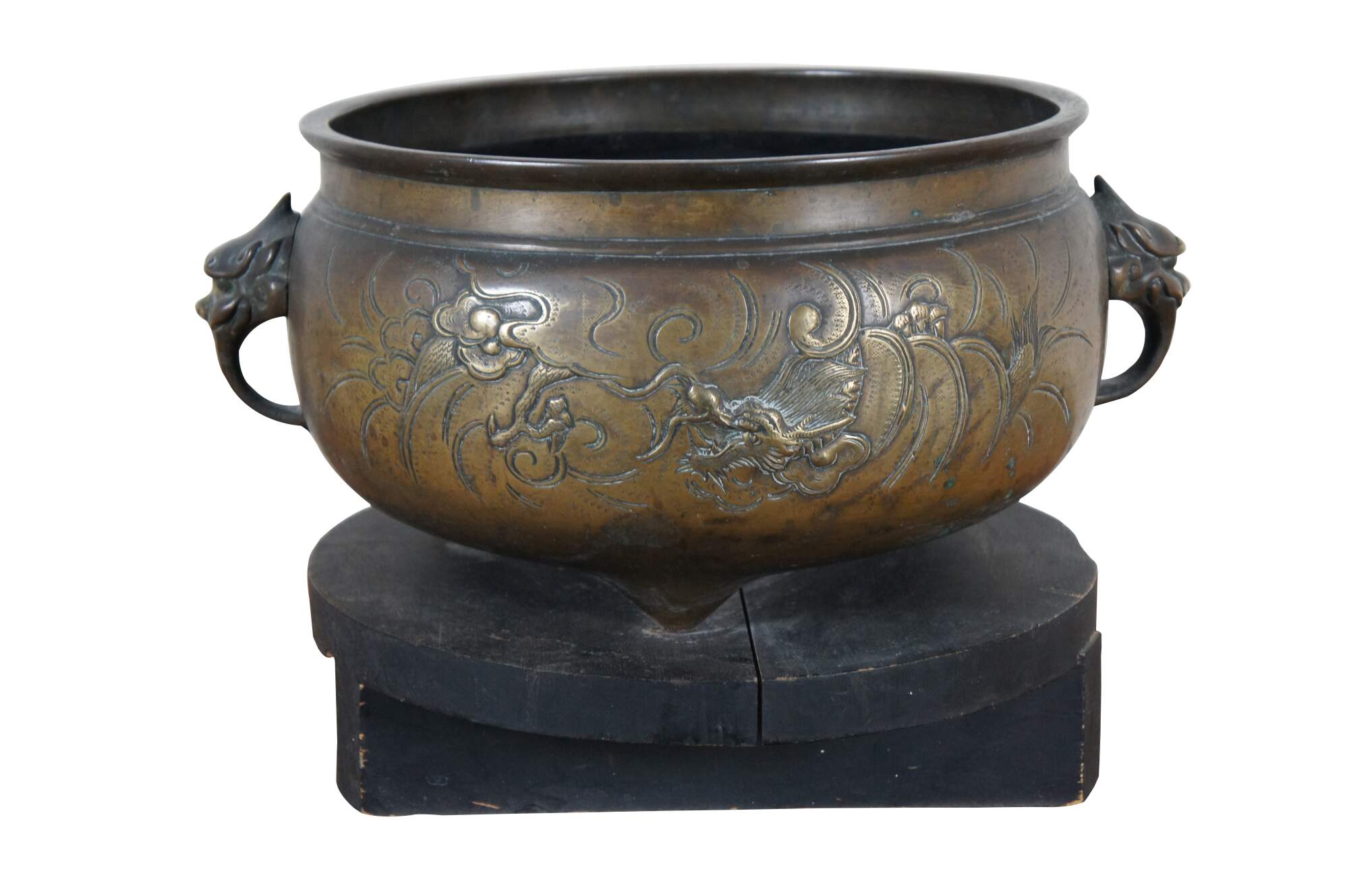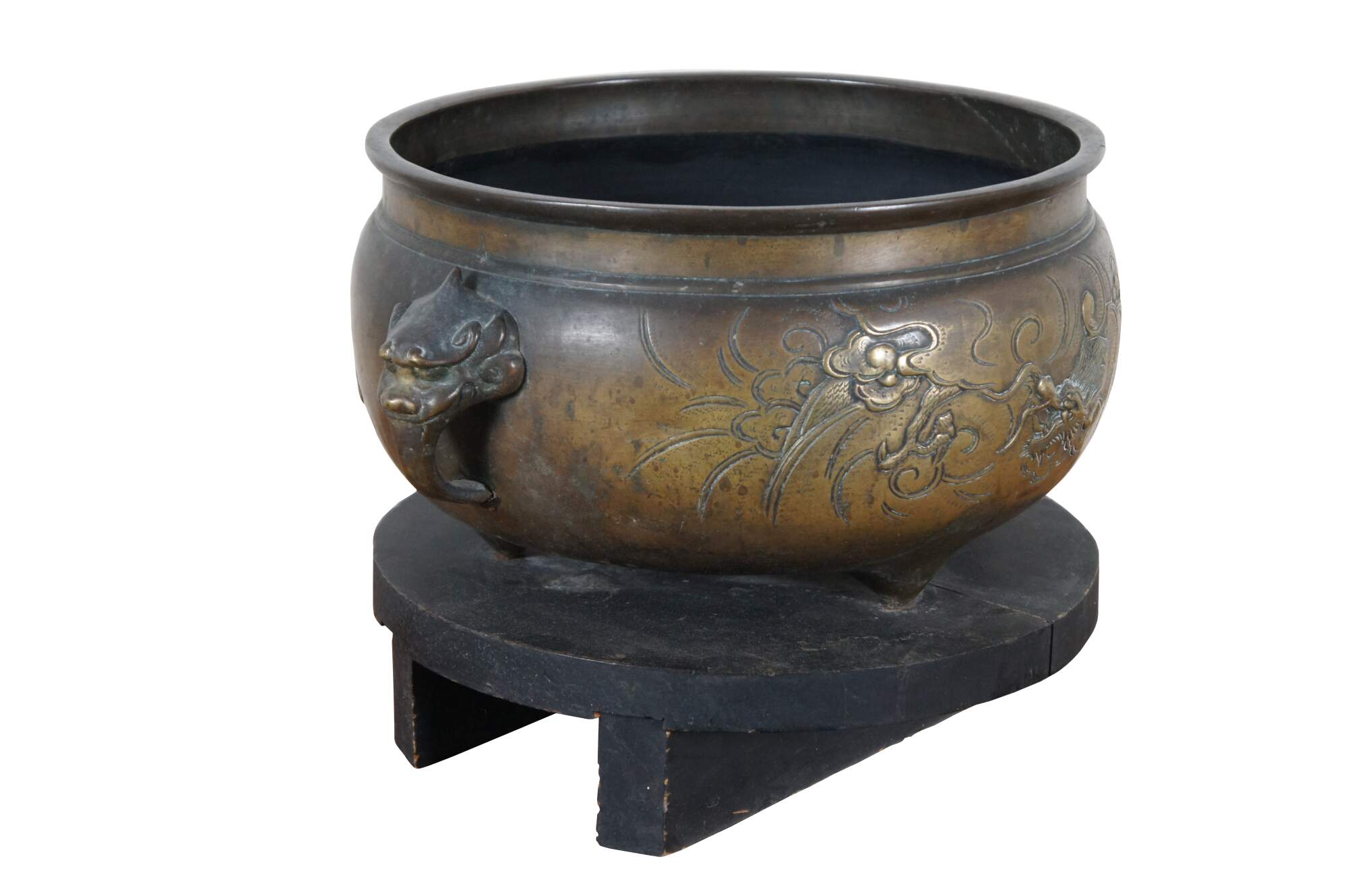 A large and impressive antique Chinese bronze Temple censer bowl on stand featuring a Phoenix on one side and Dragon on the other, with Feng Shui beast head handles and wood stand.