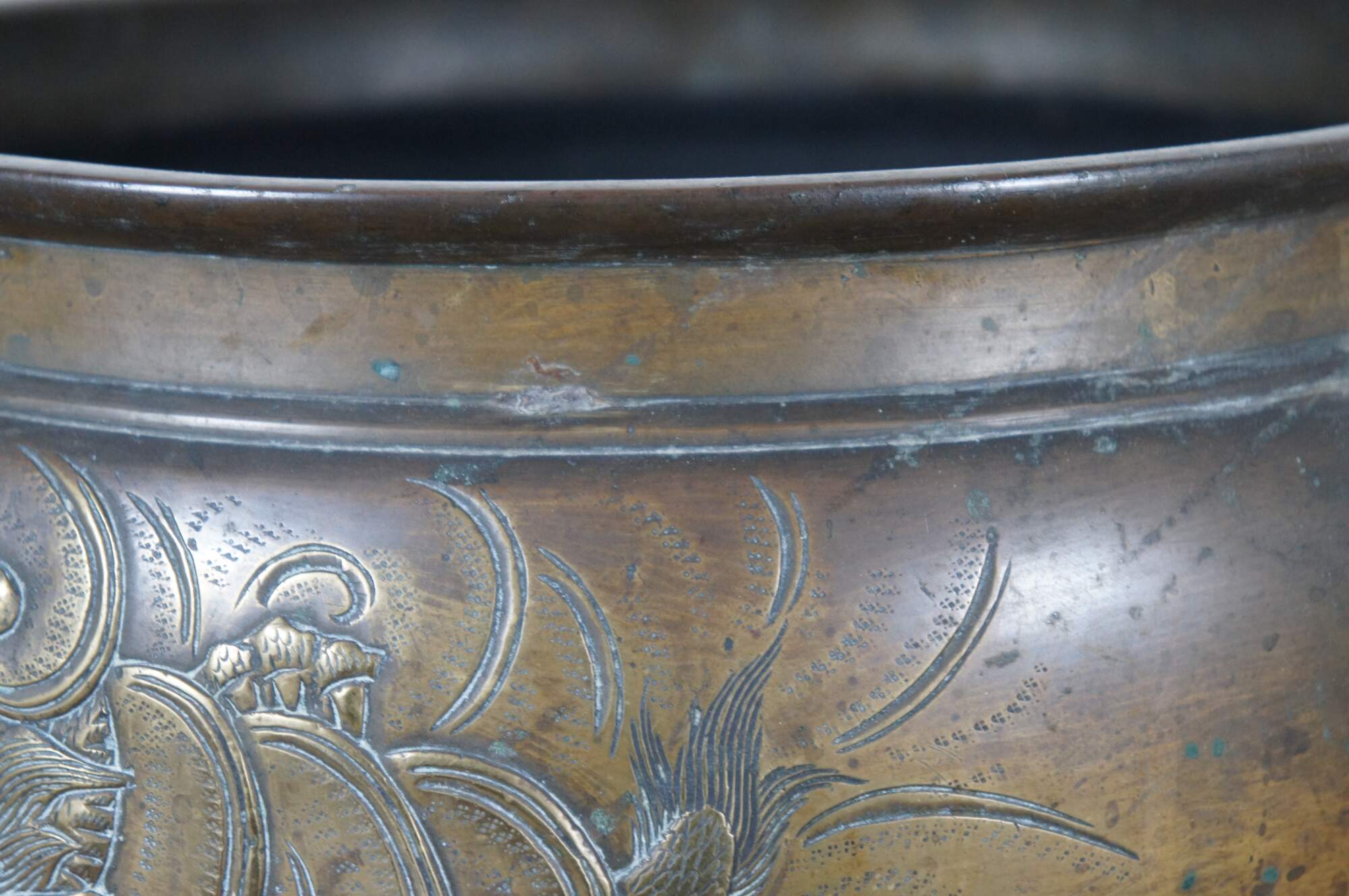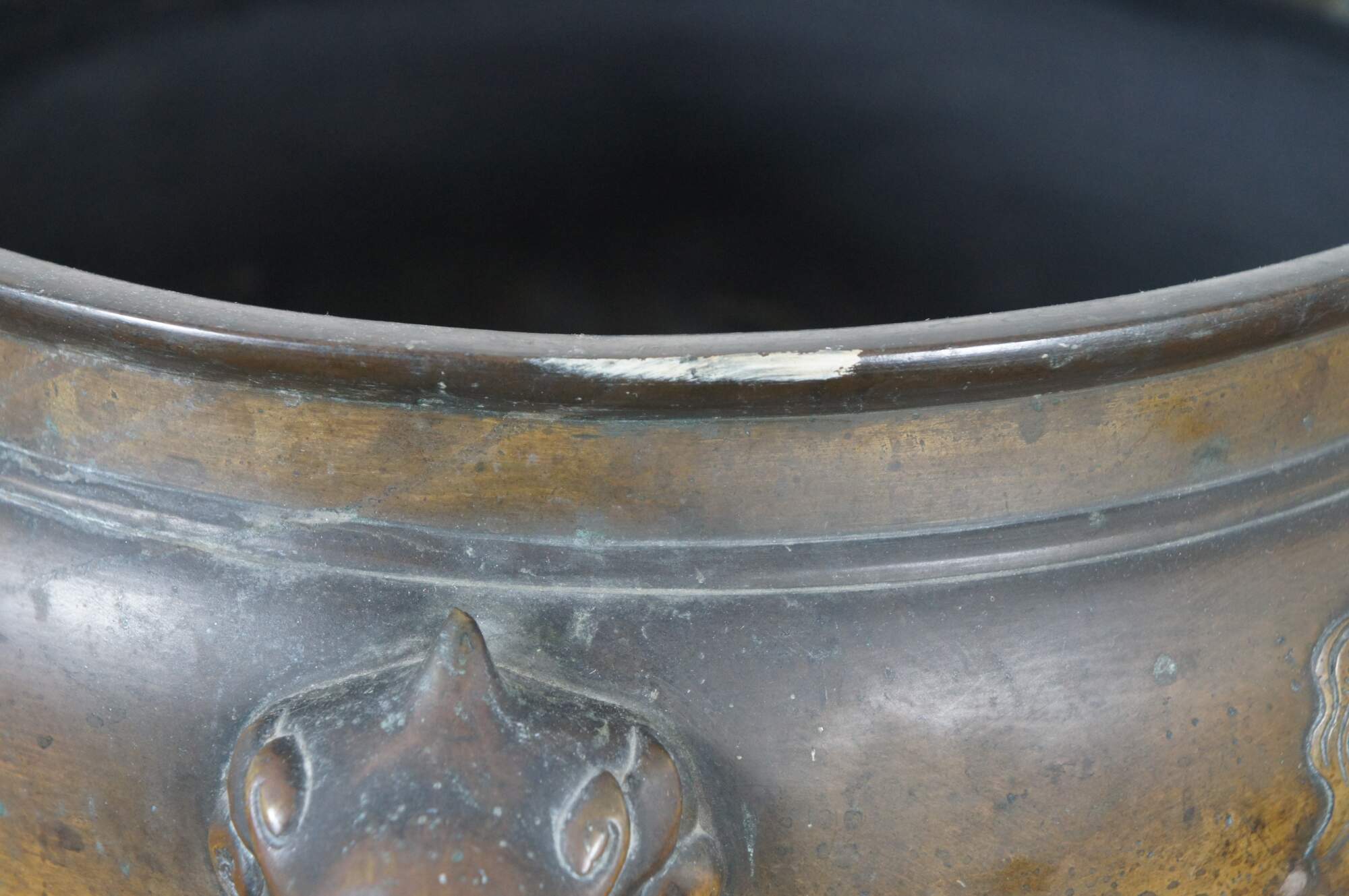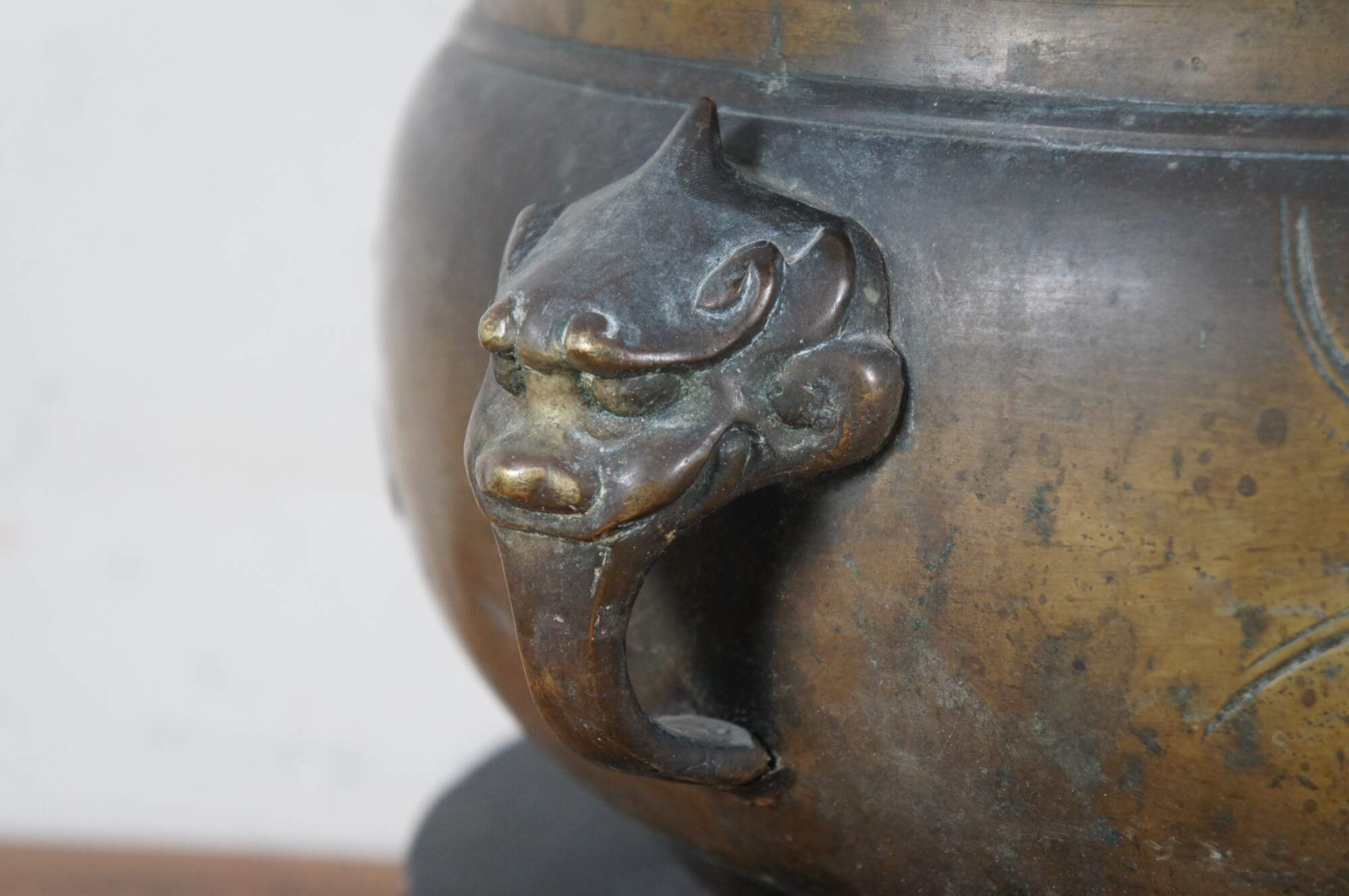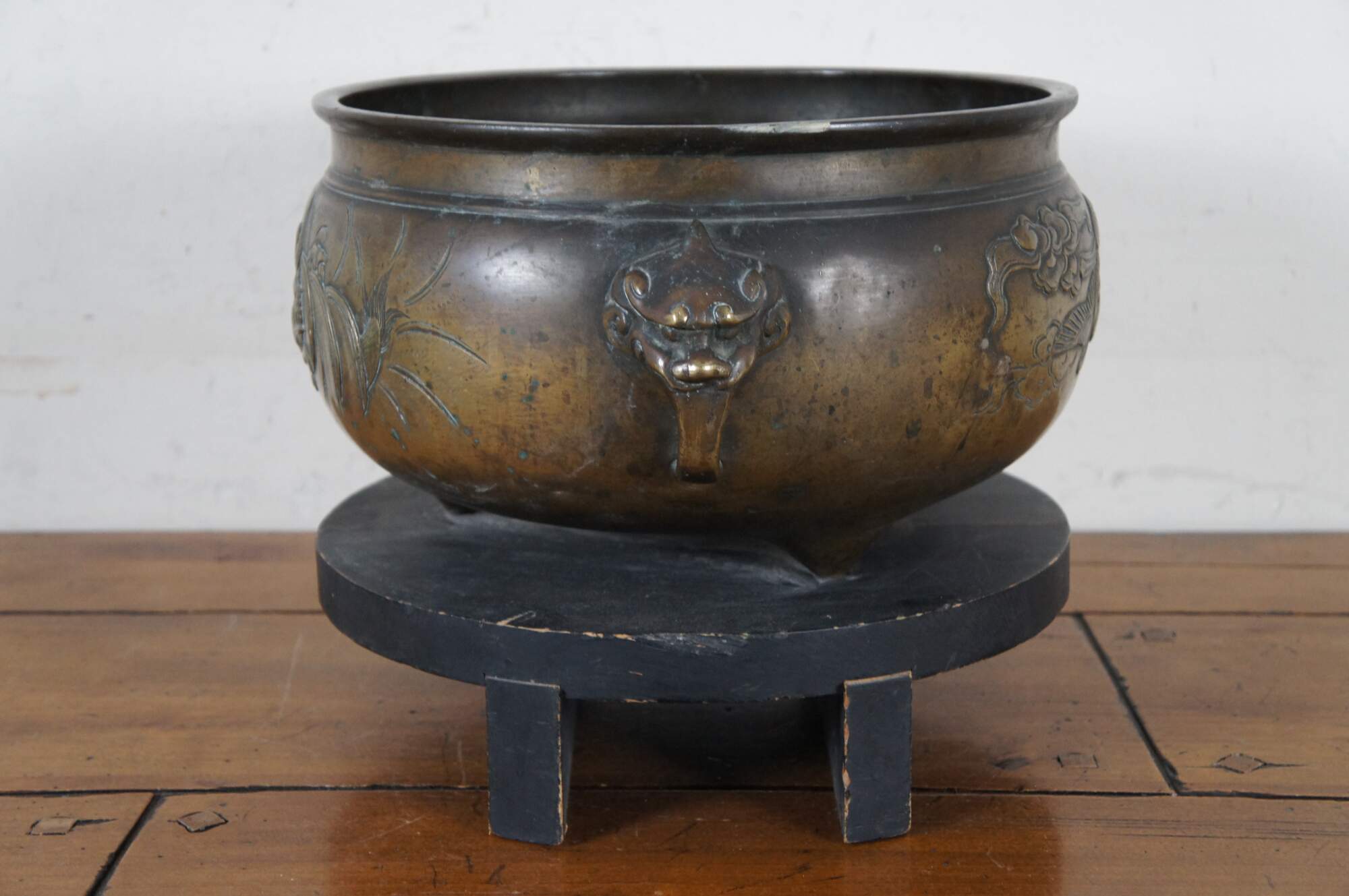 A large and impressive antique Chinese bronze Temple censer bowl on stand featuring a Phoenix on one side and Dragon on the other, with Feng Shui beast head handles and wood stand.