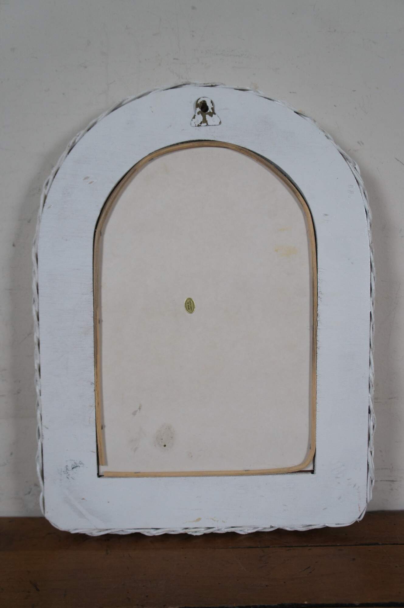 Vintage arched white wicker vanity mirror.
