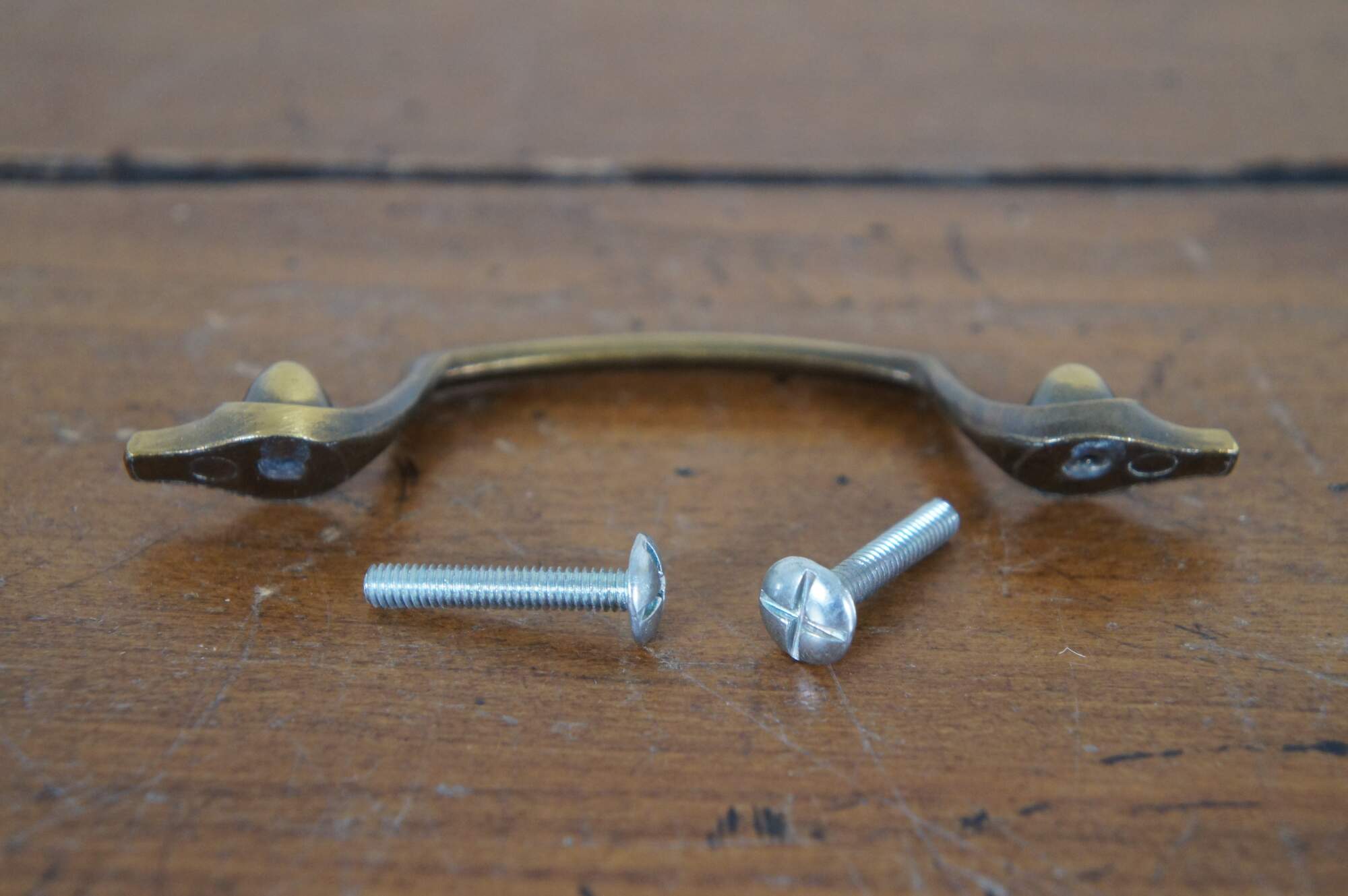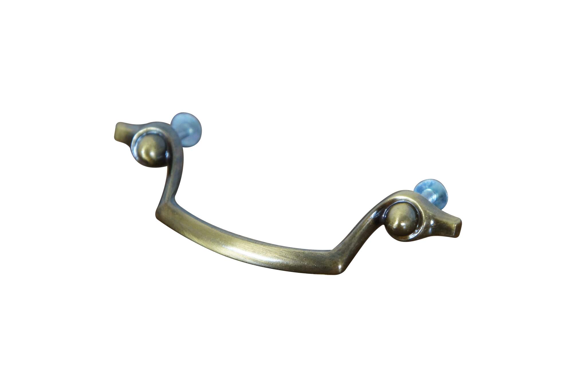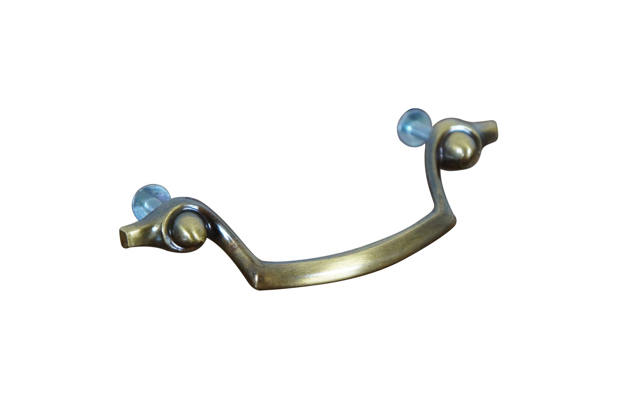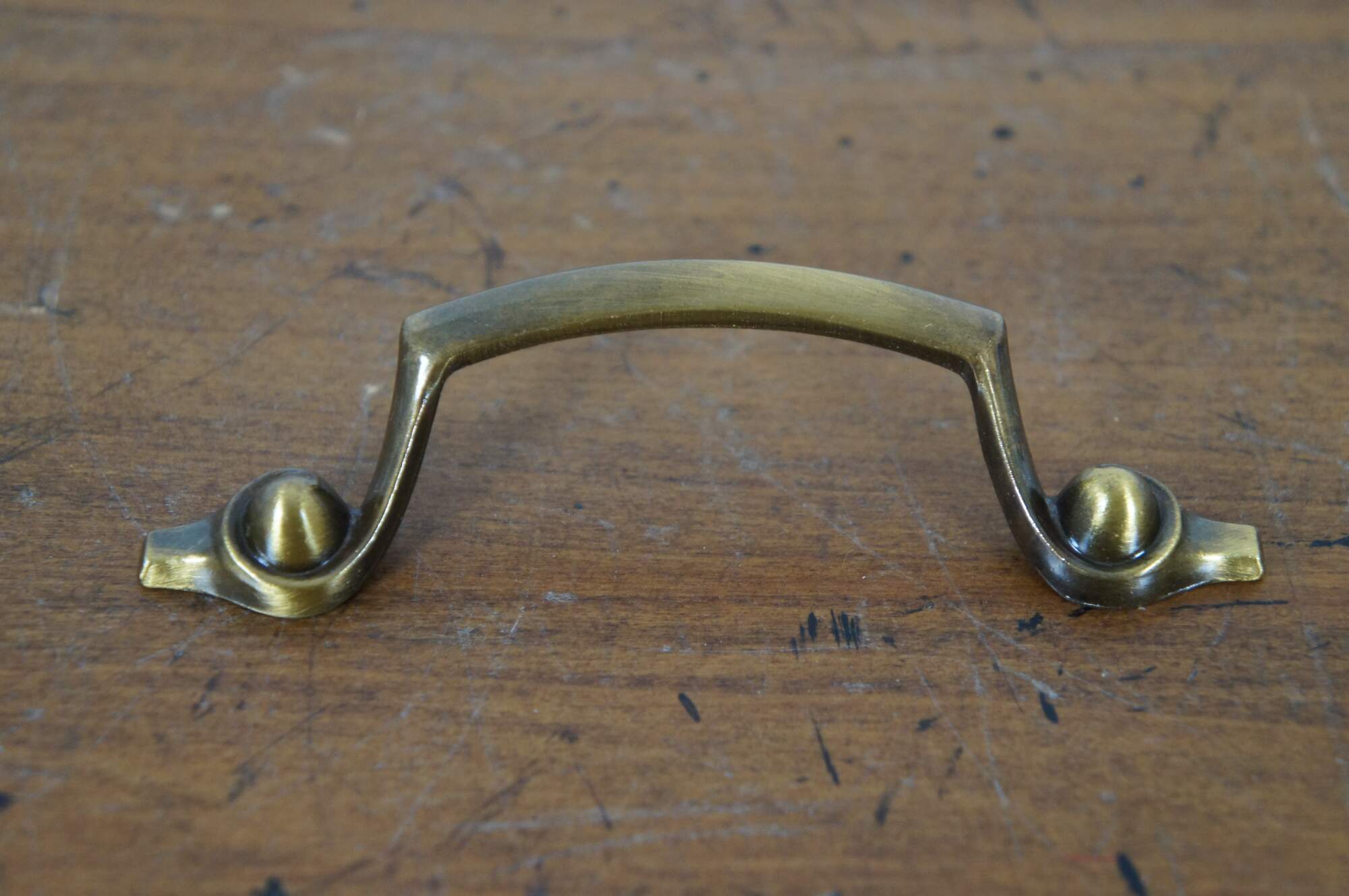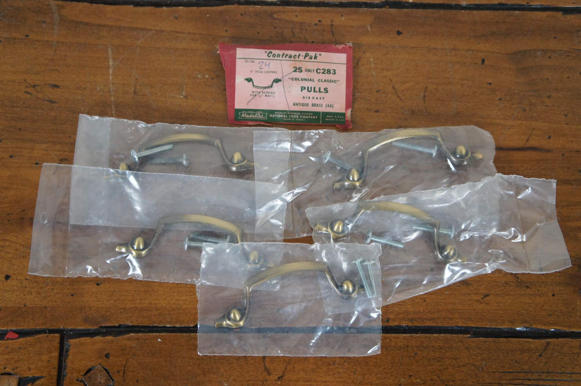 5 Available – Vintage National Lock Co Medalst “Contract-Pak,” hardware item number C283 “Colonial Classic” drawer pulls, die cast in a slightly bowed rectangular shape with studded corners, in an Antique Brass finish (no. 4A). 61-762, 3" center hole, 4.1" length.