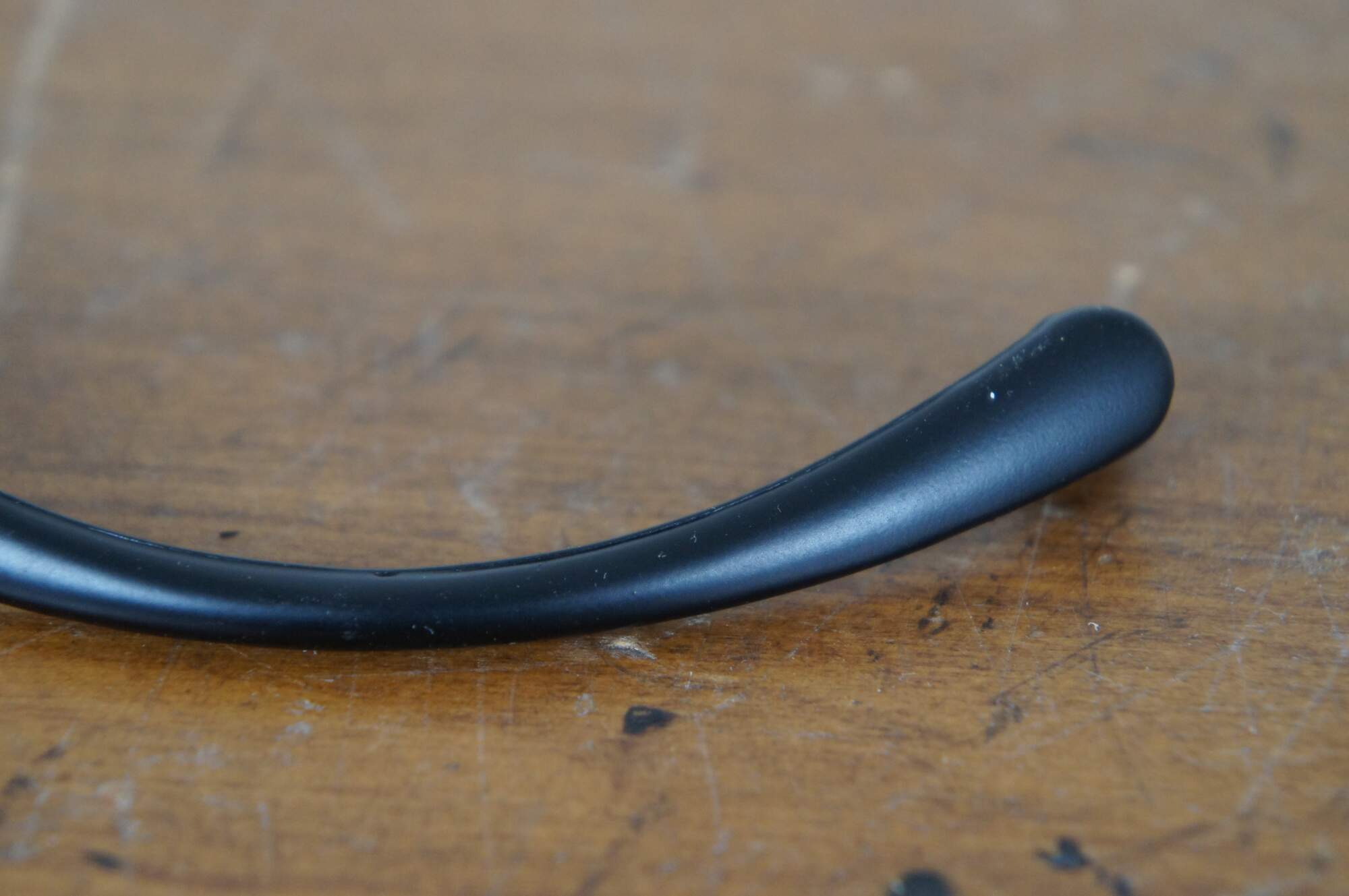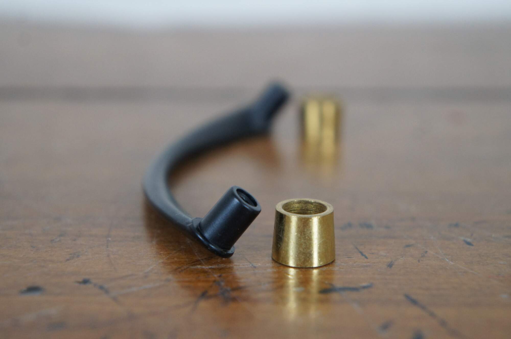32 Available – mid century modern National Lock Co Medalist “Contract-Pak,” hardware item number C294 drawer pulls, die cast in a gentle curve with bright brass caps at the corners, in a Satin Black finish (no. 1D). 3" center holes, 3.875" length, screws included.