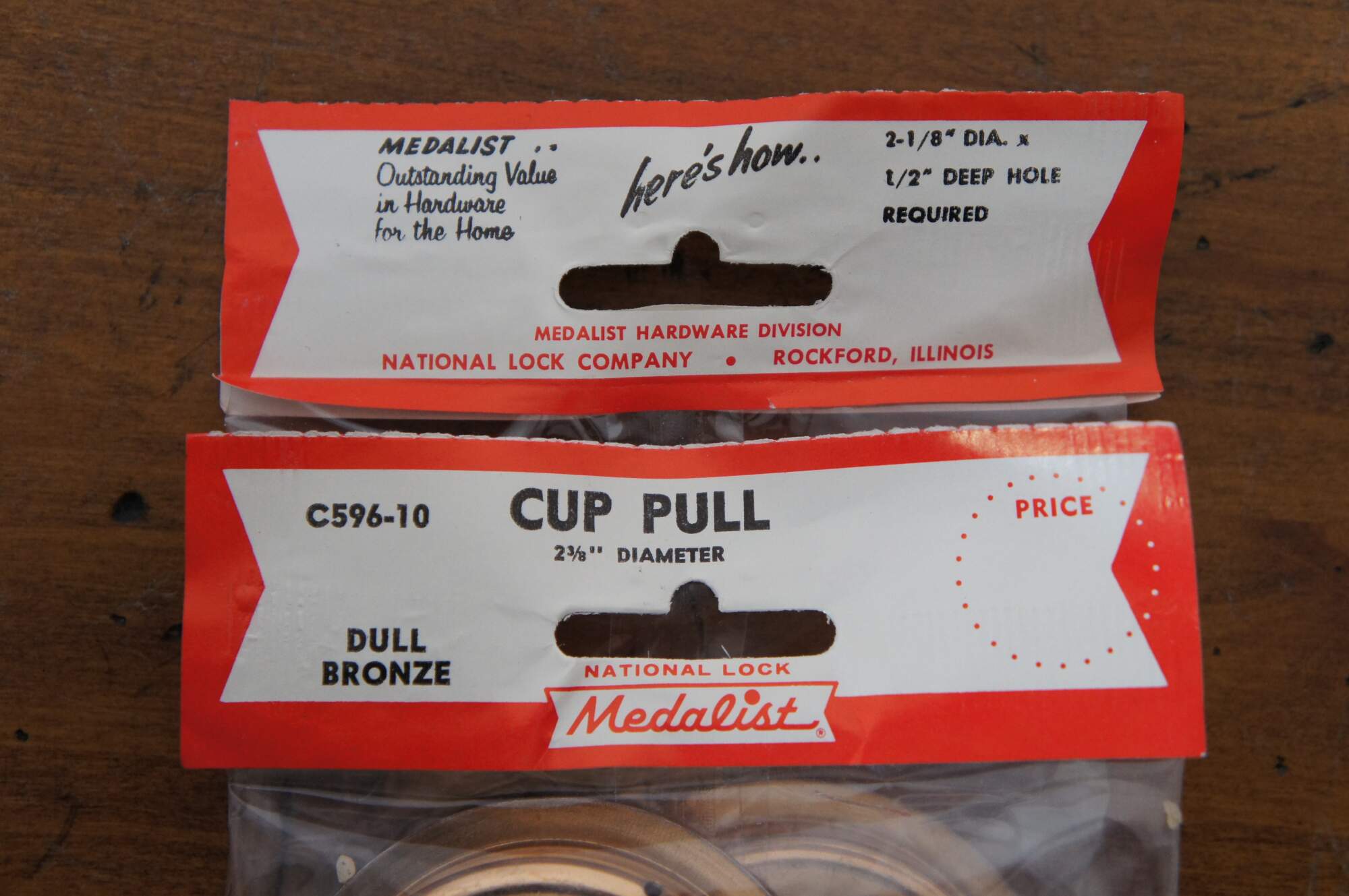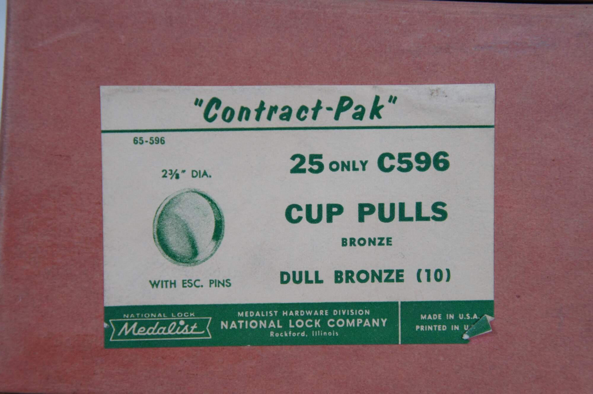 24 Available – Vintage National Lock Co Medalist “Contract-Pak,” item number C596 Cup shaped drawer pulls, crafted in bronze in a circular shape with circular divot and a Dull Bronze finish hardware (no. 10). 65-596. 2 3/8" diameter, includes esc pins.