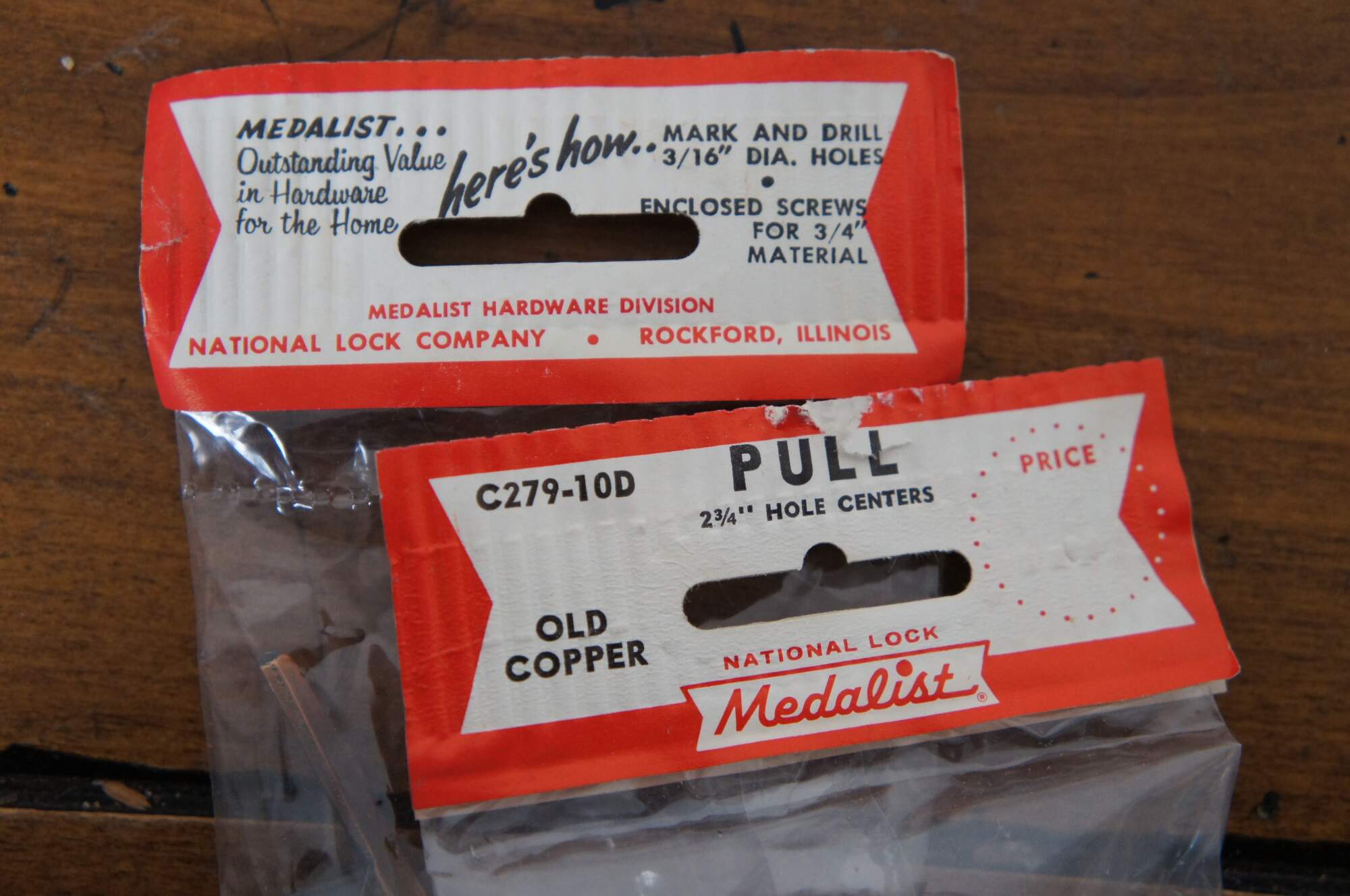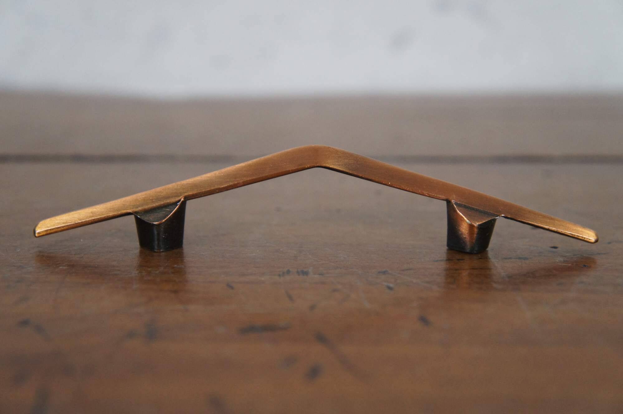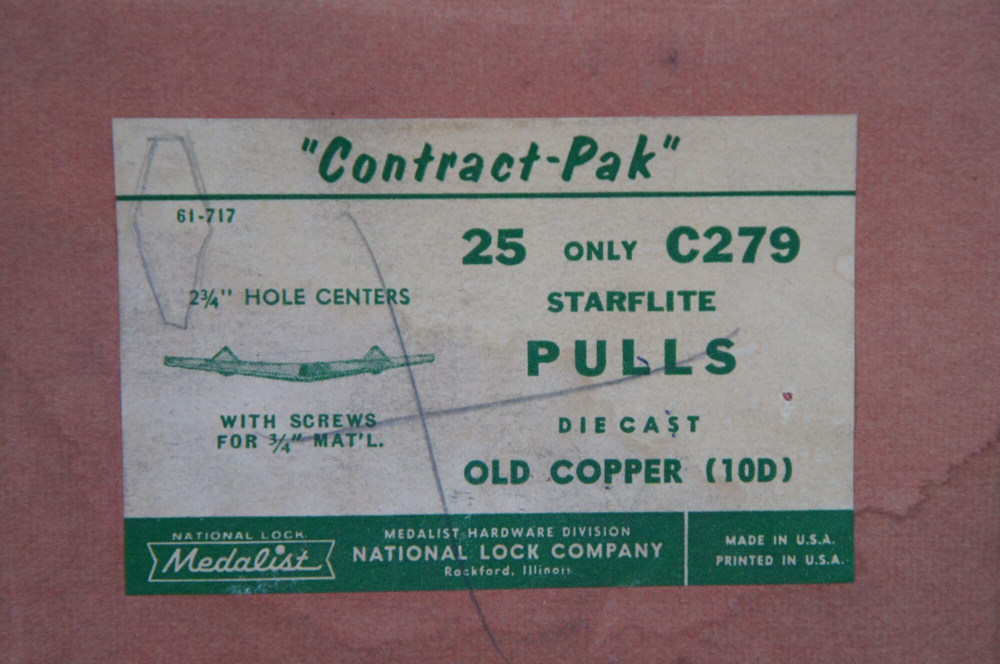 12 Available – mid century modern National Lock Co Medalist “Contract-Pak,” item number C279 Starflite MCM drawer pulls, die cast in a slender arrow shape in an Old Copper finish (no. 10D). 189-870. 61-717