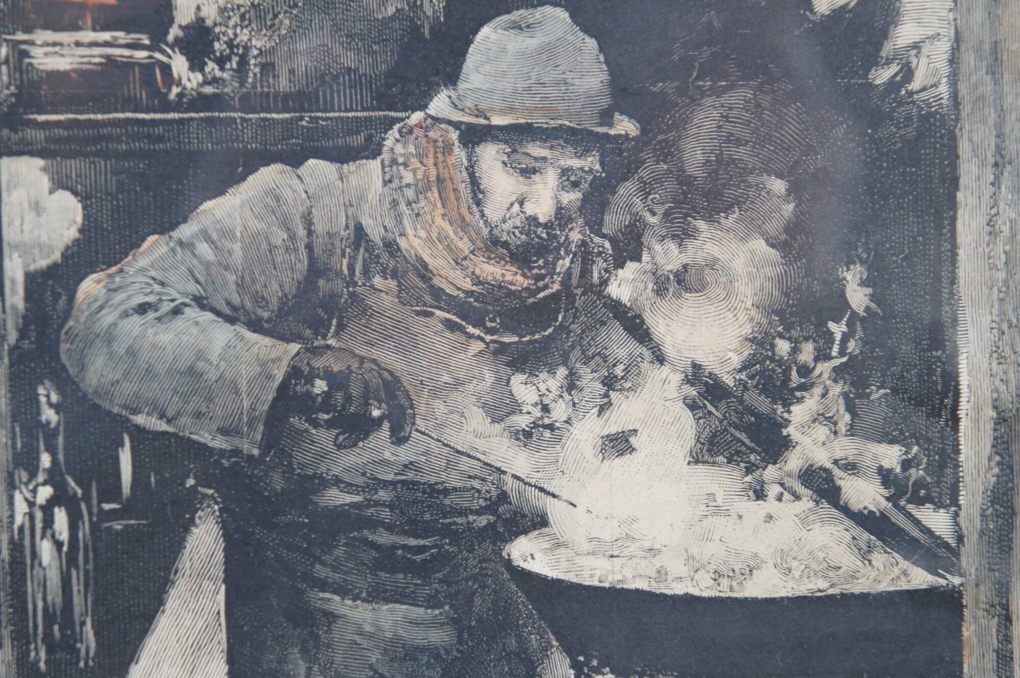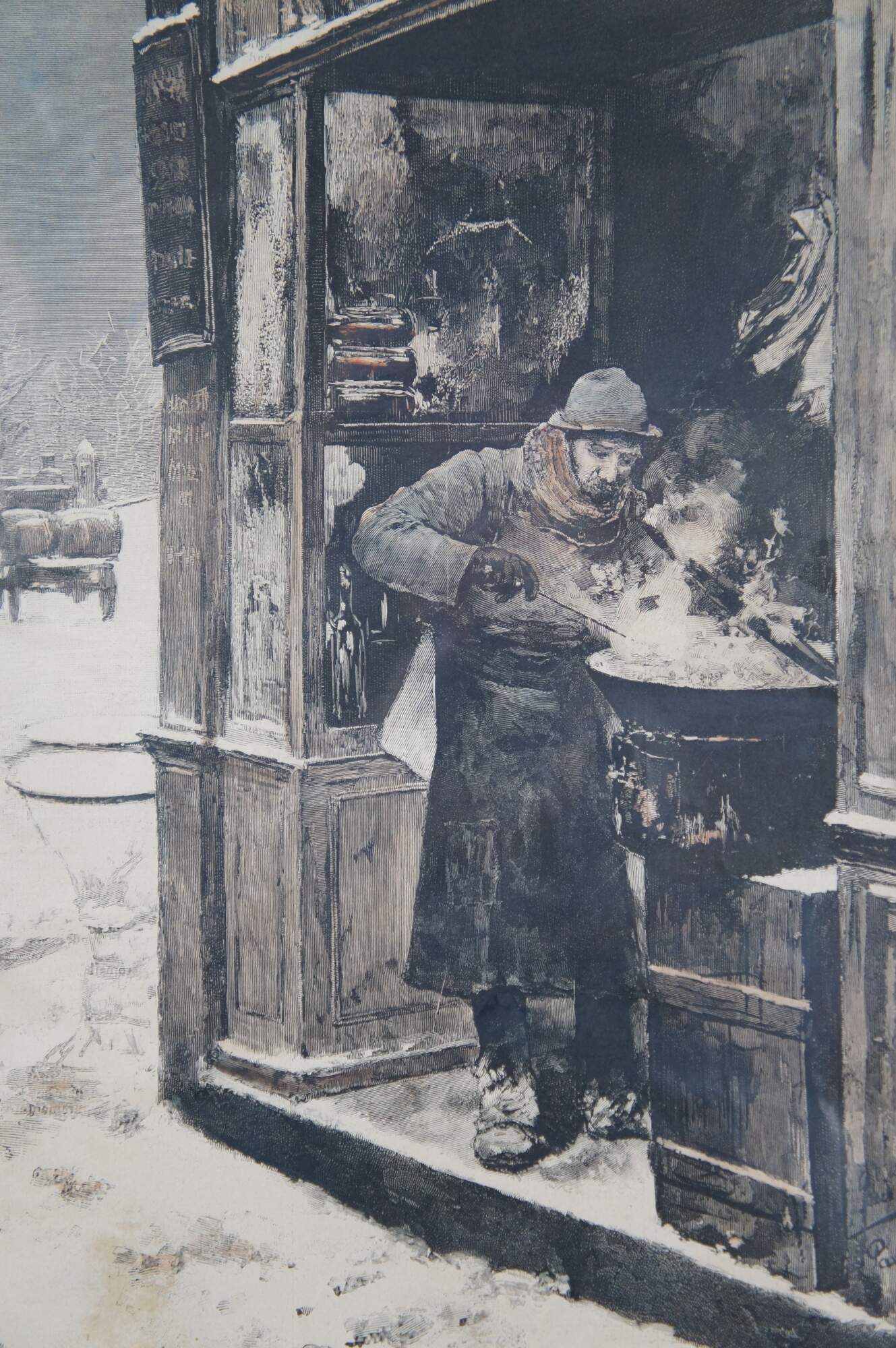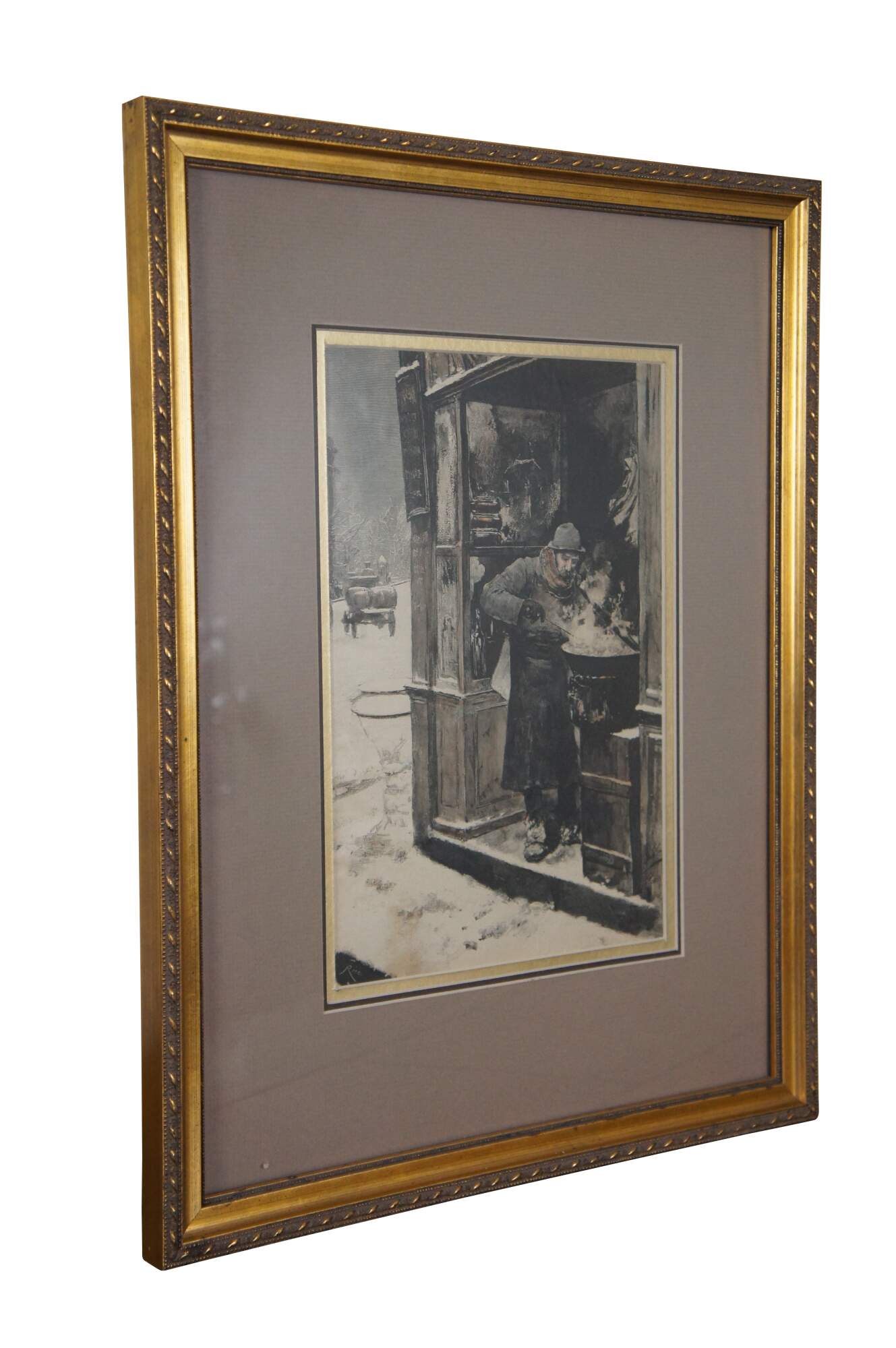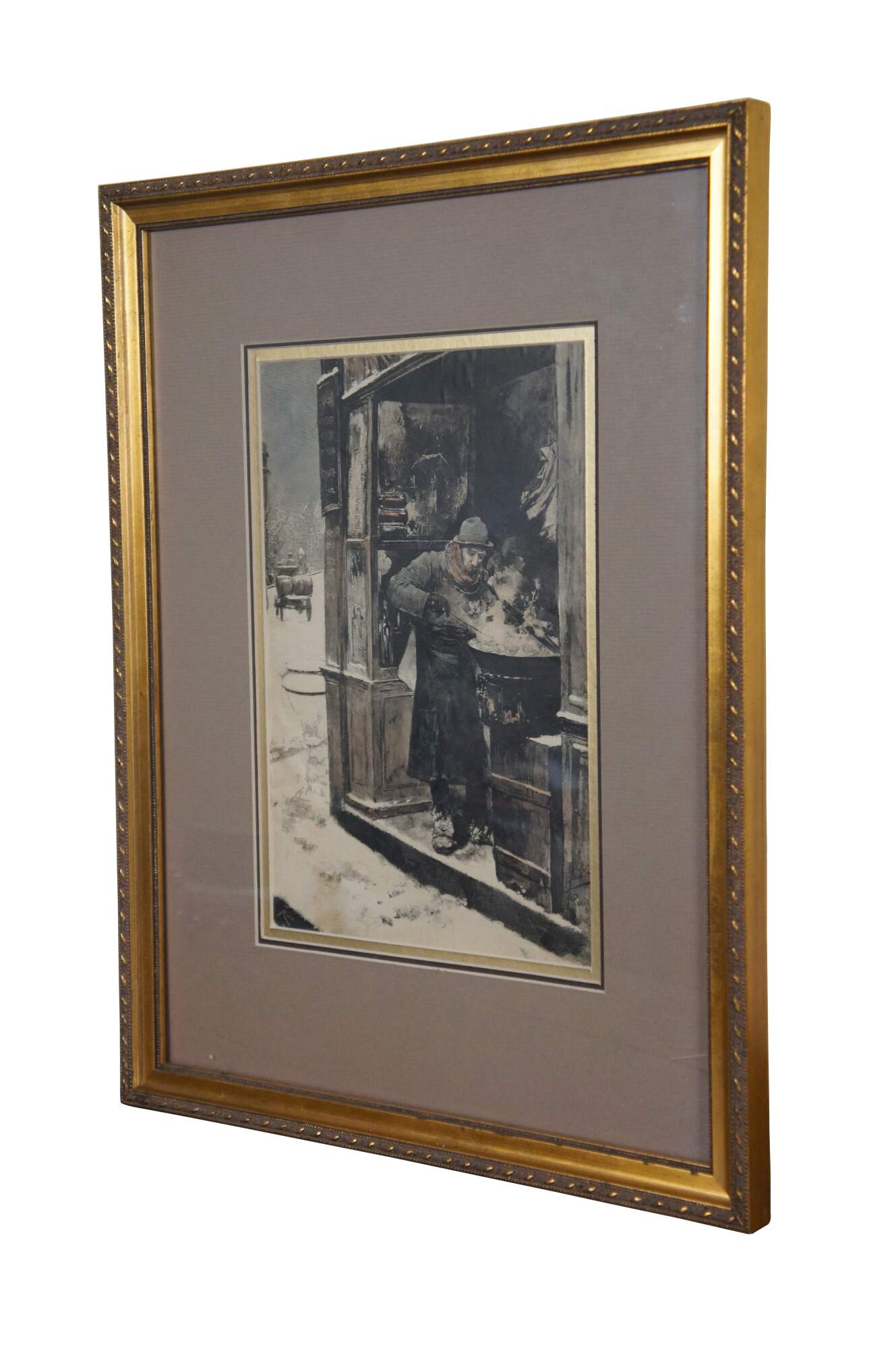 Antique framed engraving of Le Vendeur de Marrons (The Chestnut Seller) originally painted in 1886 by Luis Jimenez y Aranda.