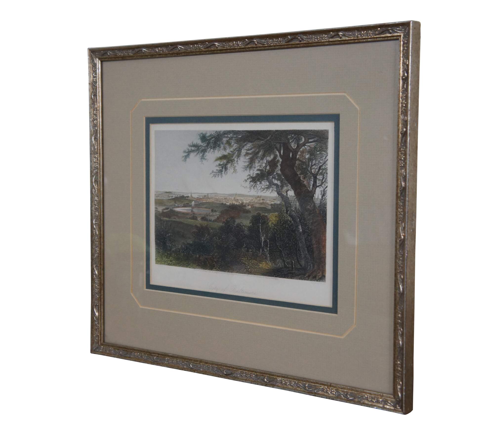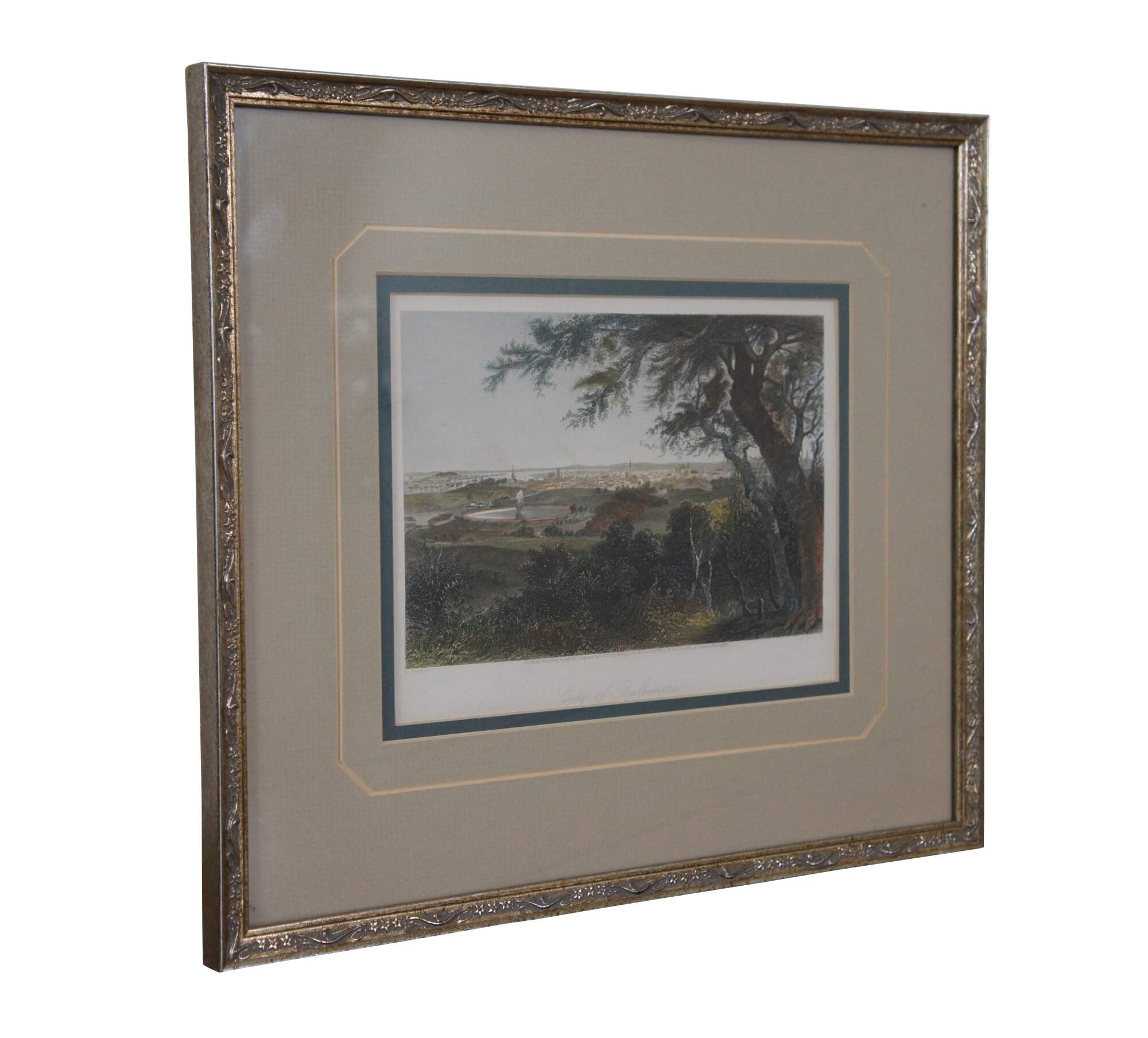 Antique framed 19th century hand colored engraving of the City of Baltimore (a view from Druid Hill Park) – G. Perkins / R. Hinshelwood / Entered according to Act of Congress A.D.1873 by D. Appleton & Co in the Office of the Librarian of Congress Washington.