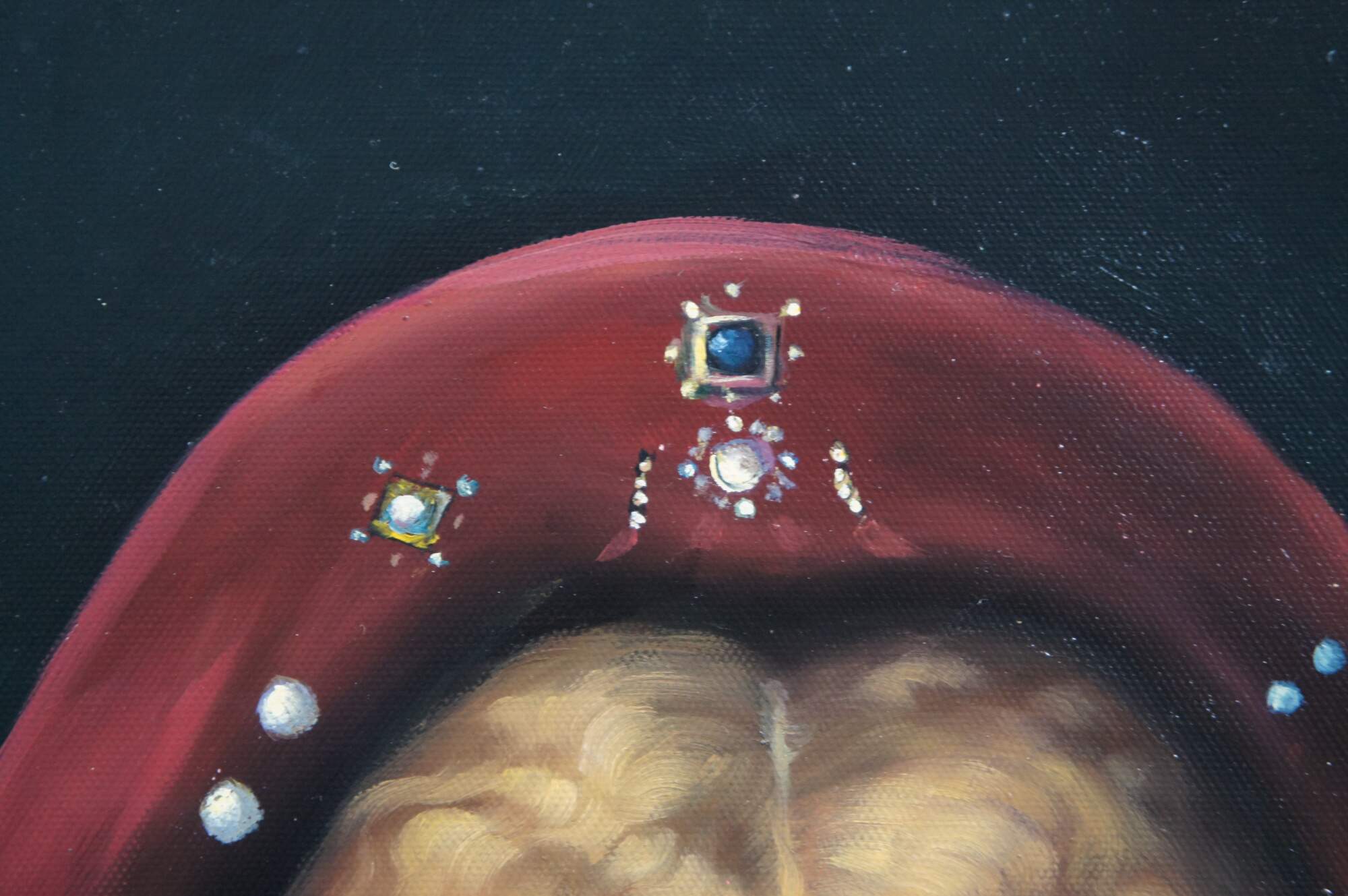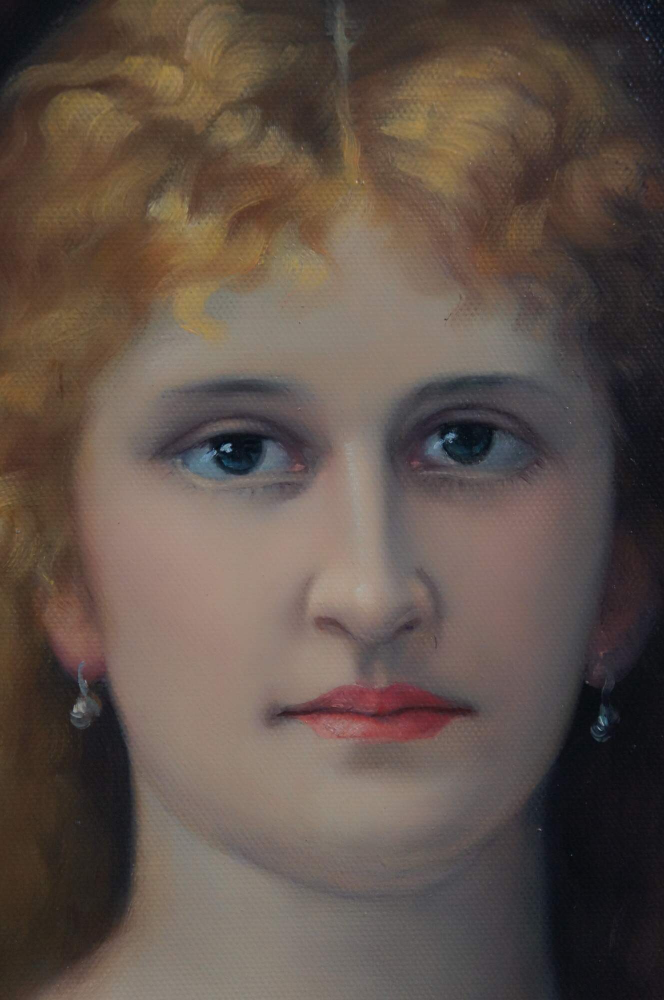Very large and impressive hand painted reproduction oil portrait painting on canvas after “Patricienne de Venise” (Patrician of Venice) originally painted in 1881 by Alexandre Cabanel, showing a woman with long red hair in an elegant red Elizabethan gown, standing next to a chair. Displayed in a carved and beveled gilded frame.