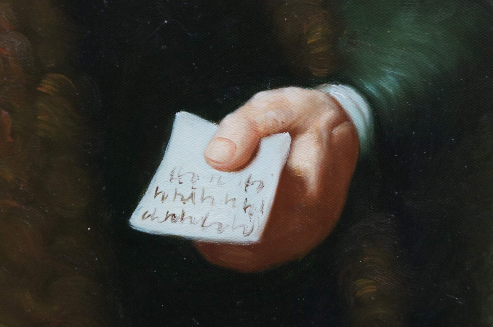 Late 20th century hand painted reproduction oil on canvas painting after “Portrait of Nicolaes Ruts” originally painted in 1631 by Rembrandt van Rijn. This portrait of a fur trader was one of Rembrandt's earliest commissioned pieces and helped launch his career as a portrait painter. Displayed in a carved gilded and ebonized frame.