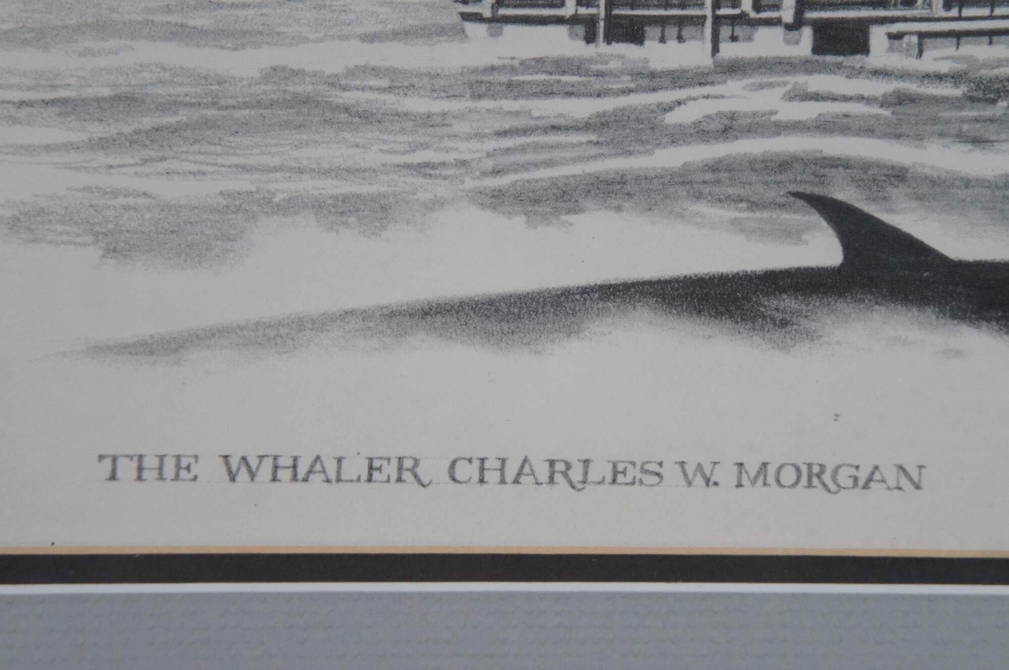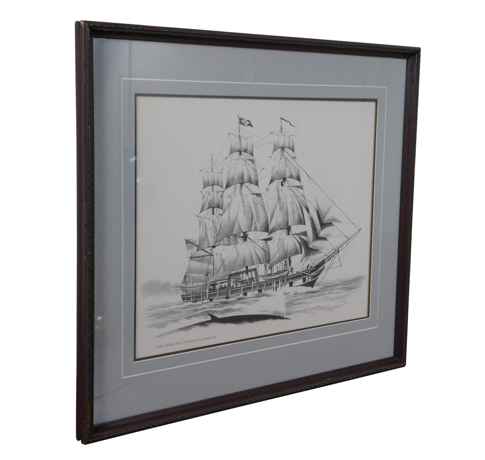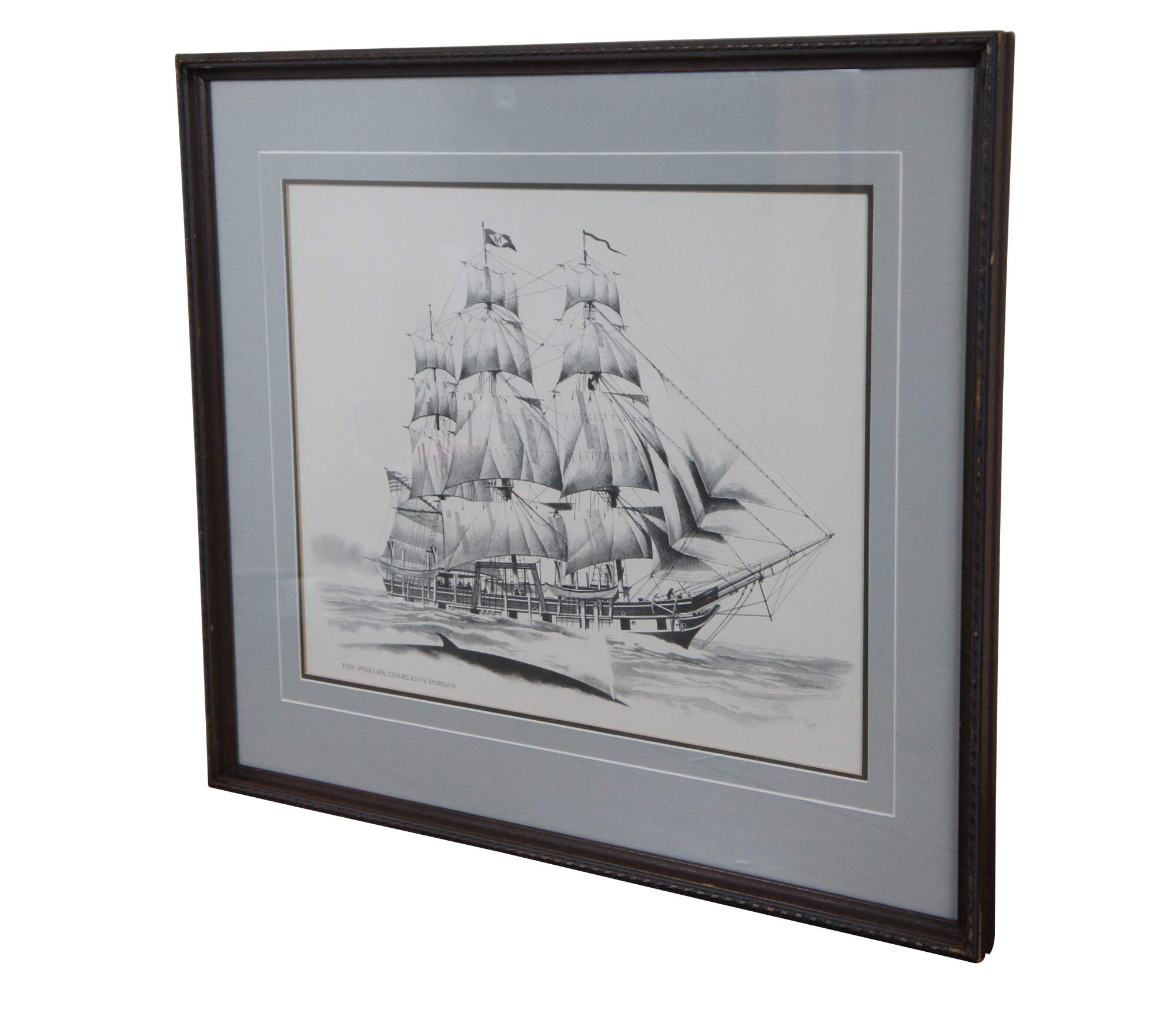 Late 20th century black and white lithograph print depicting “The Whaler Charles W. Morgan” from an engraving by Fowler. Displayed in a neatly carved dark wood frame. Professionally matted and framed under glass.