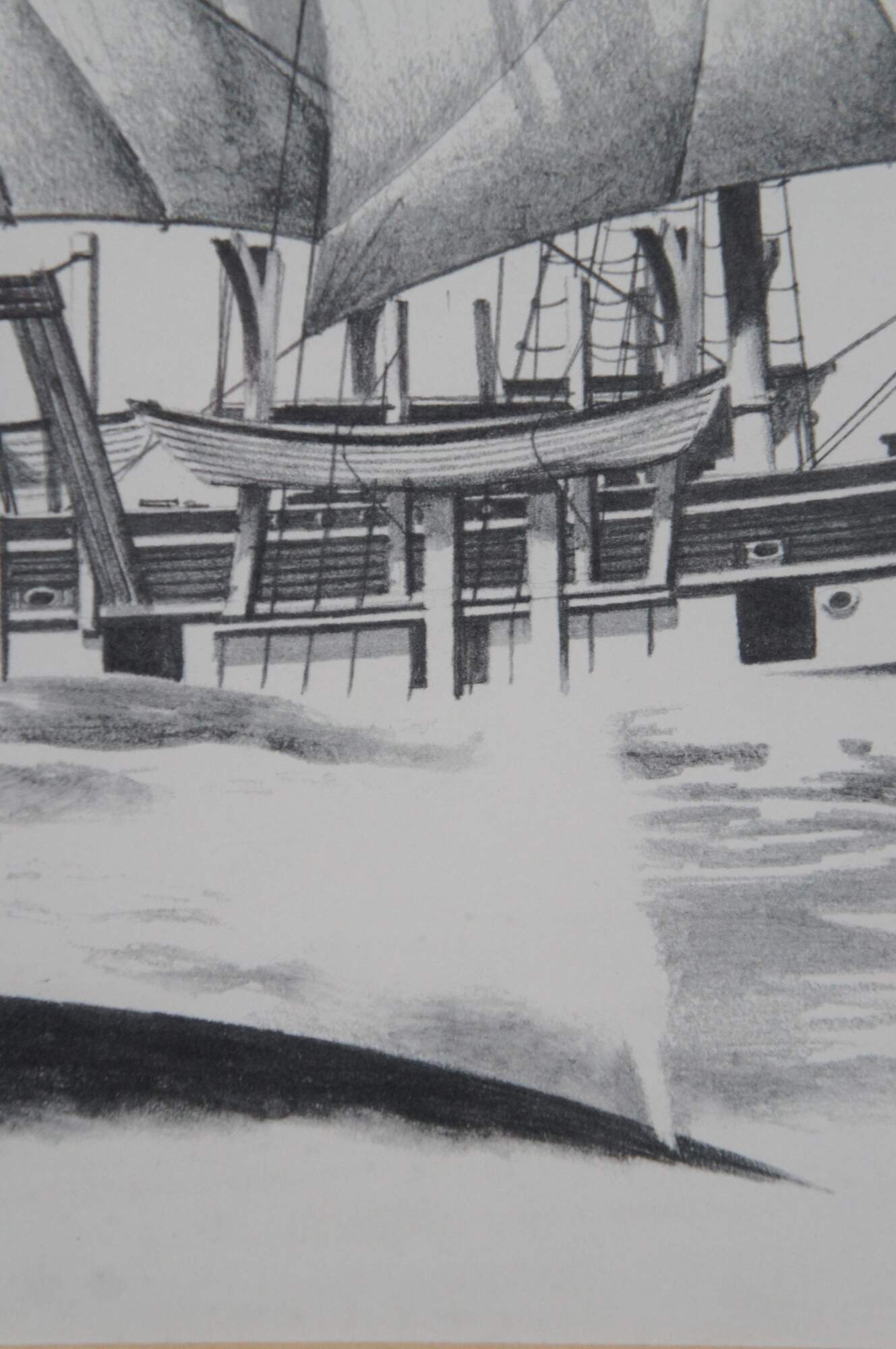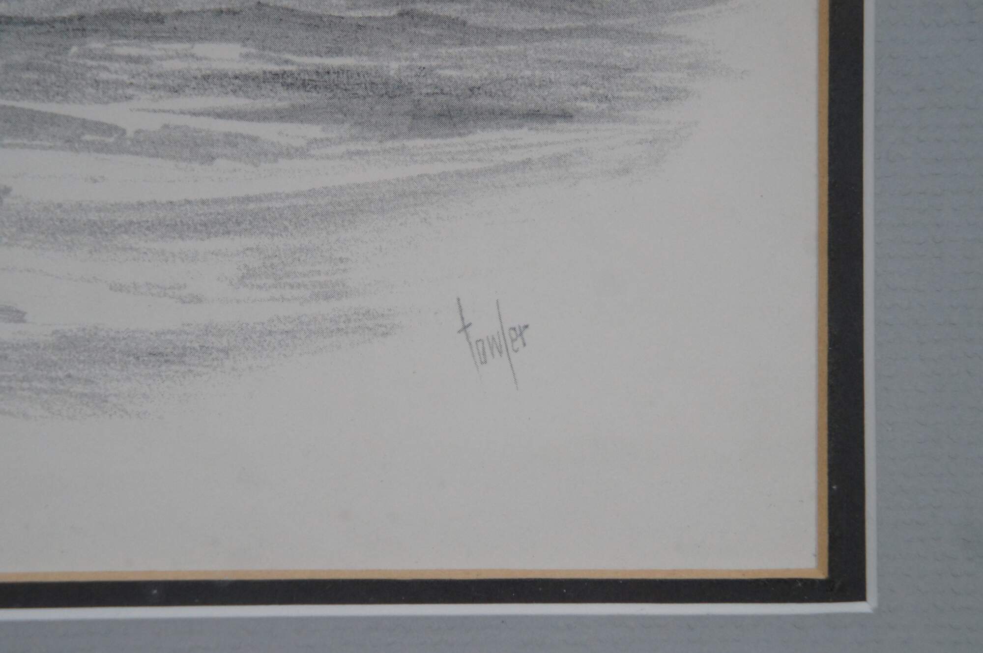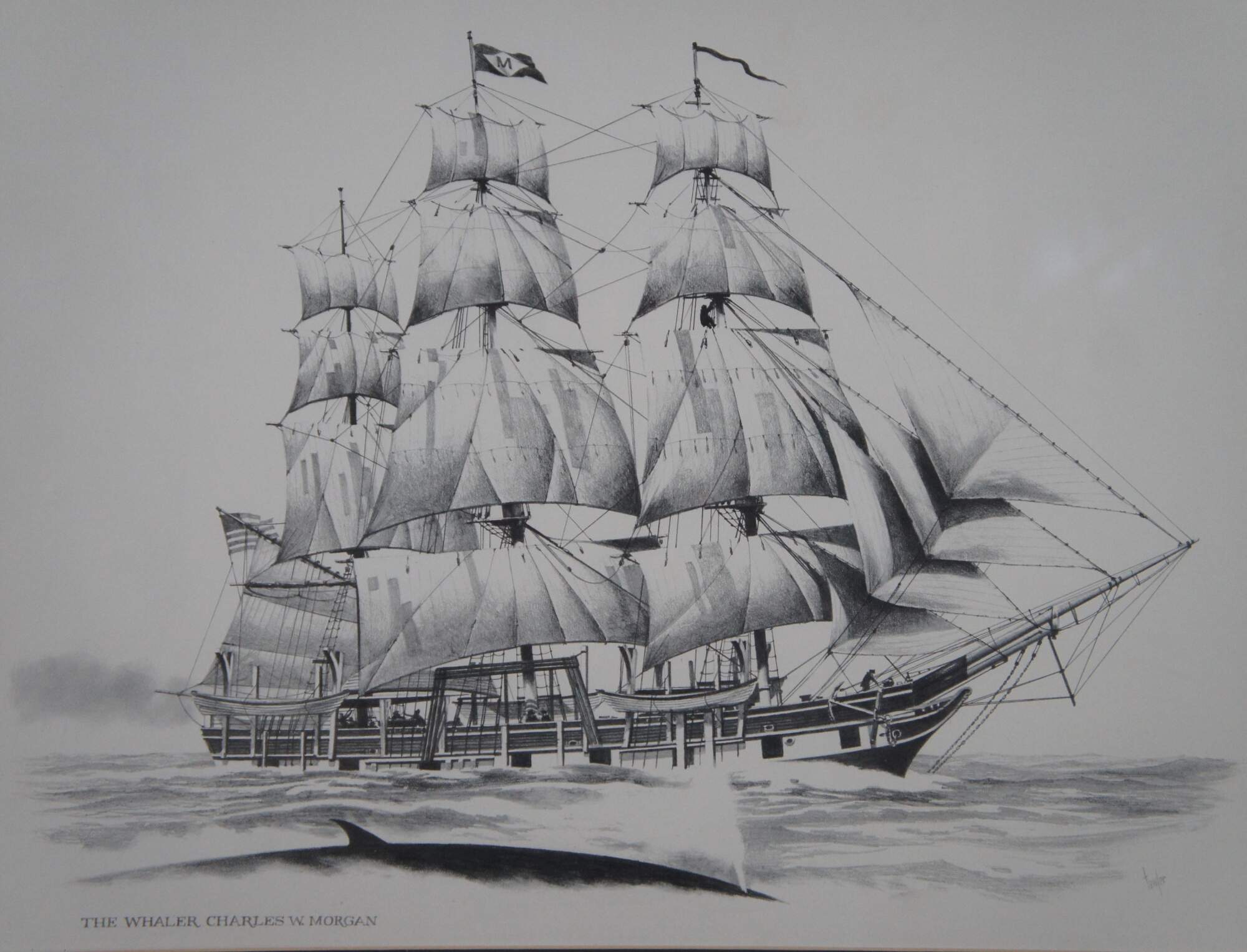 Late 20th century black and white lithograph print depicting “The Whaler Charles W. Morgan” from an engraving by Fowler. Displayed in a neatly carved dark wood frame. Professionally matted and framed under glass.
