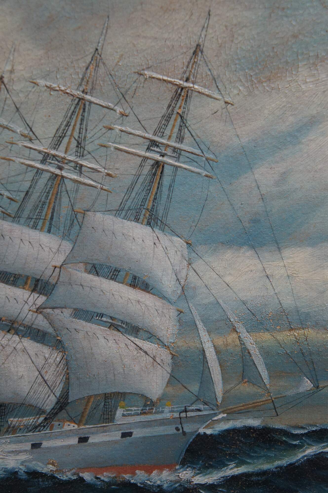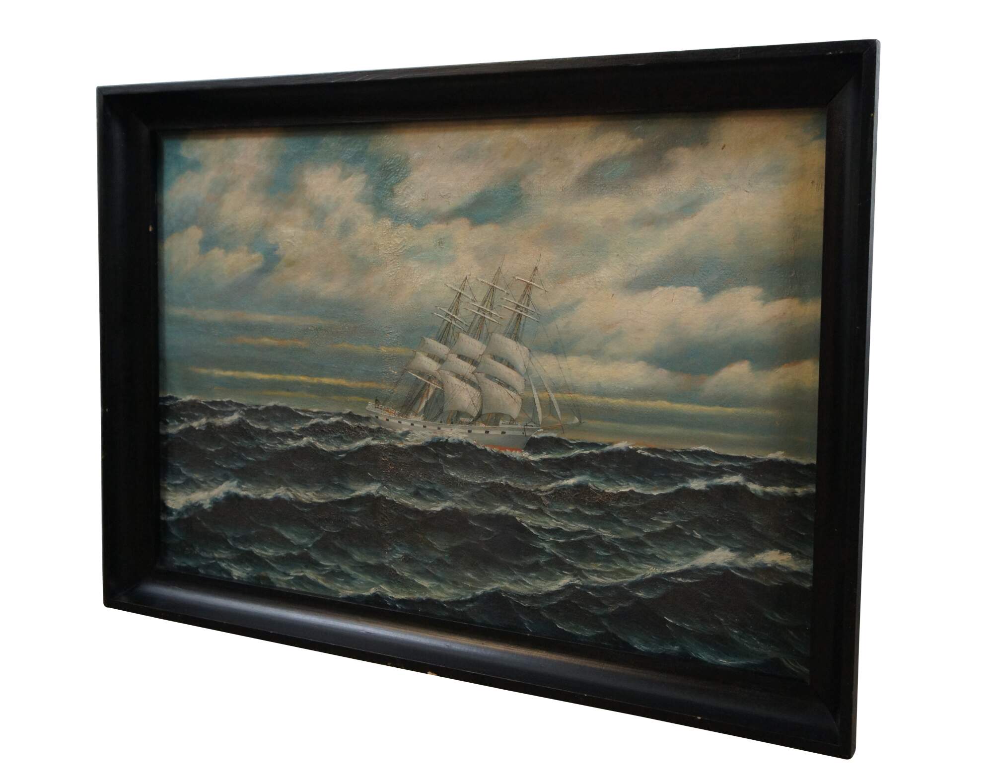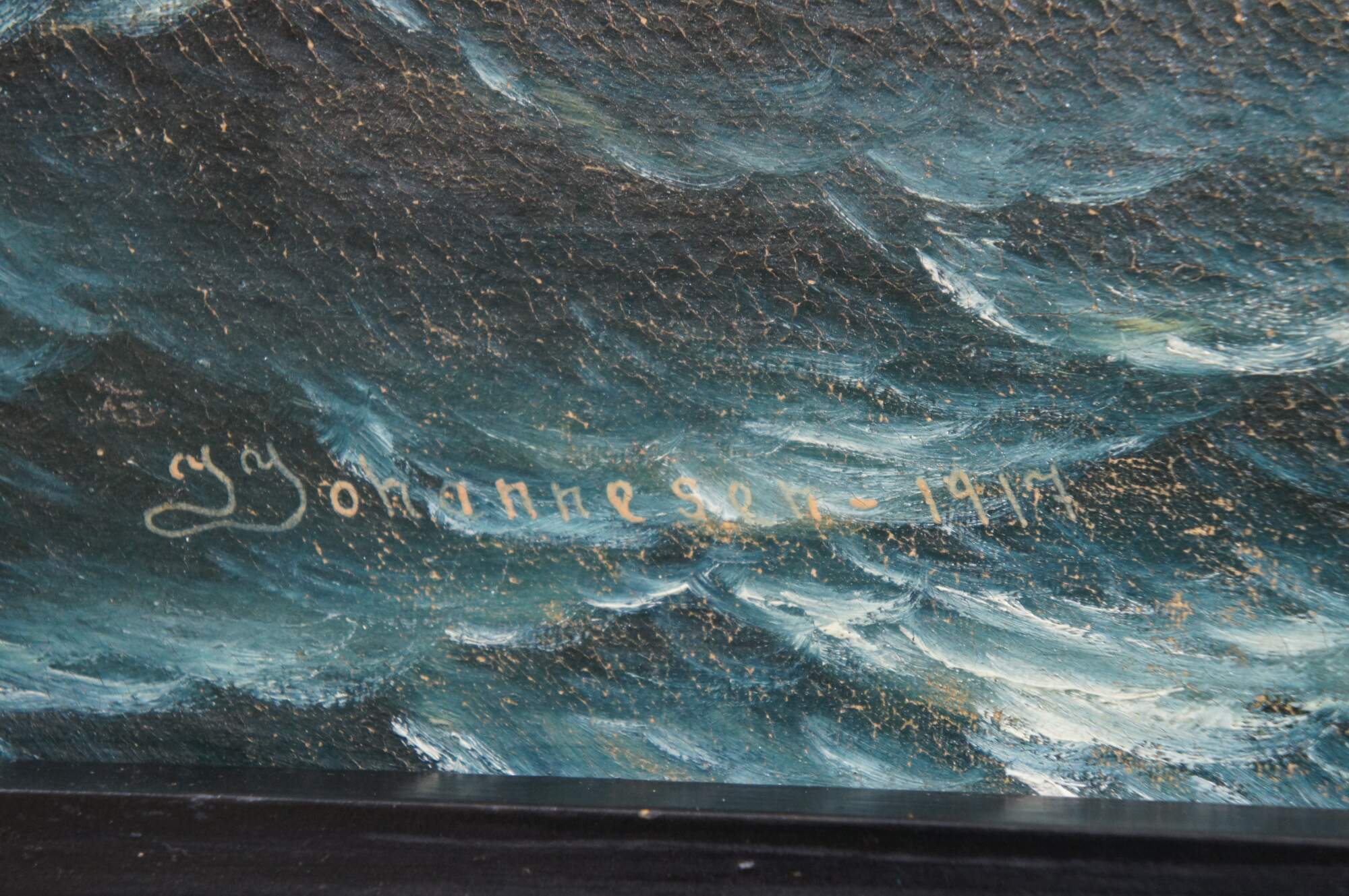 Antique Dutch School oil painting on canvas showing a yacht / clipper ship on a choppy sea. Signed in lower left corner J. Johannesen (Y. Yohannsen) – 1917.