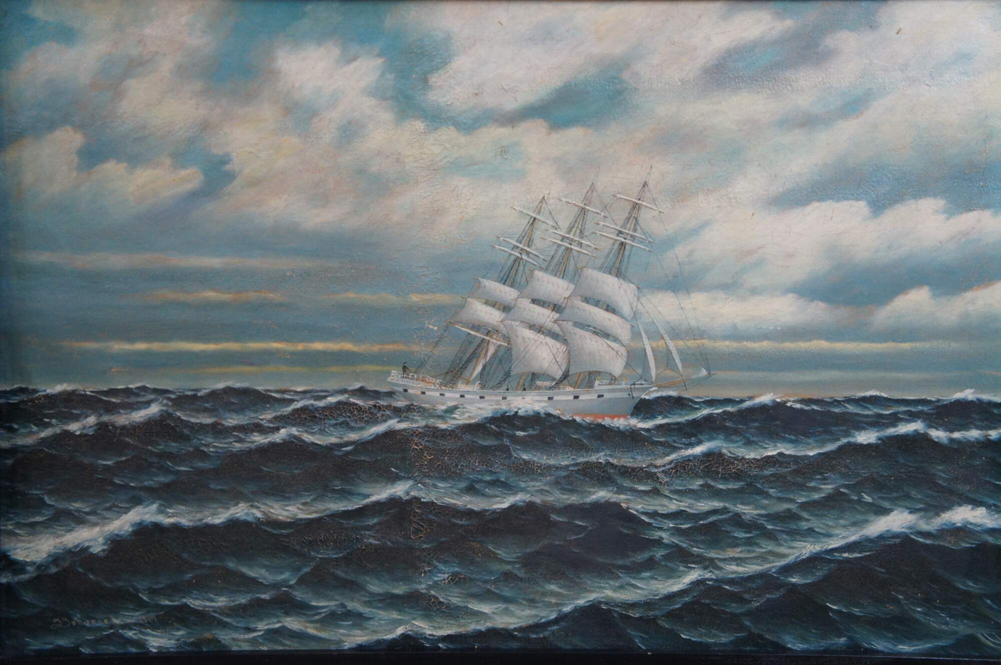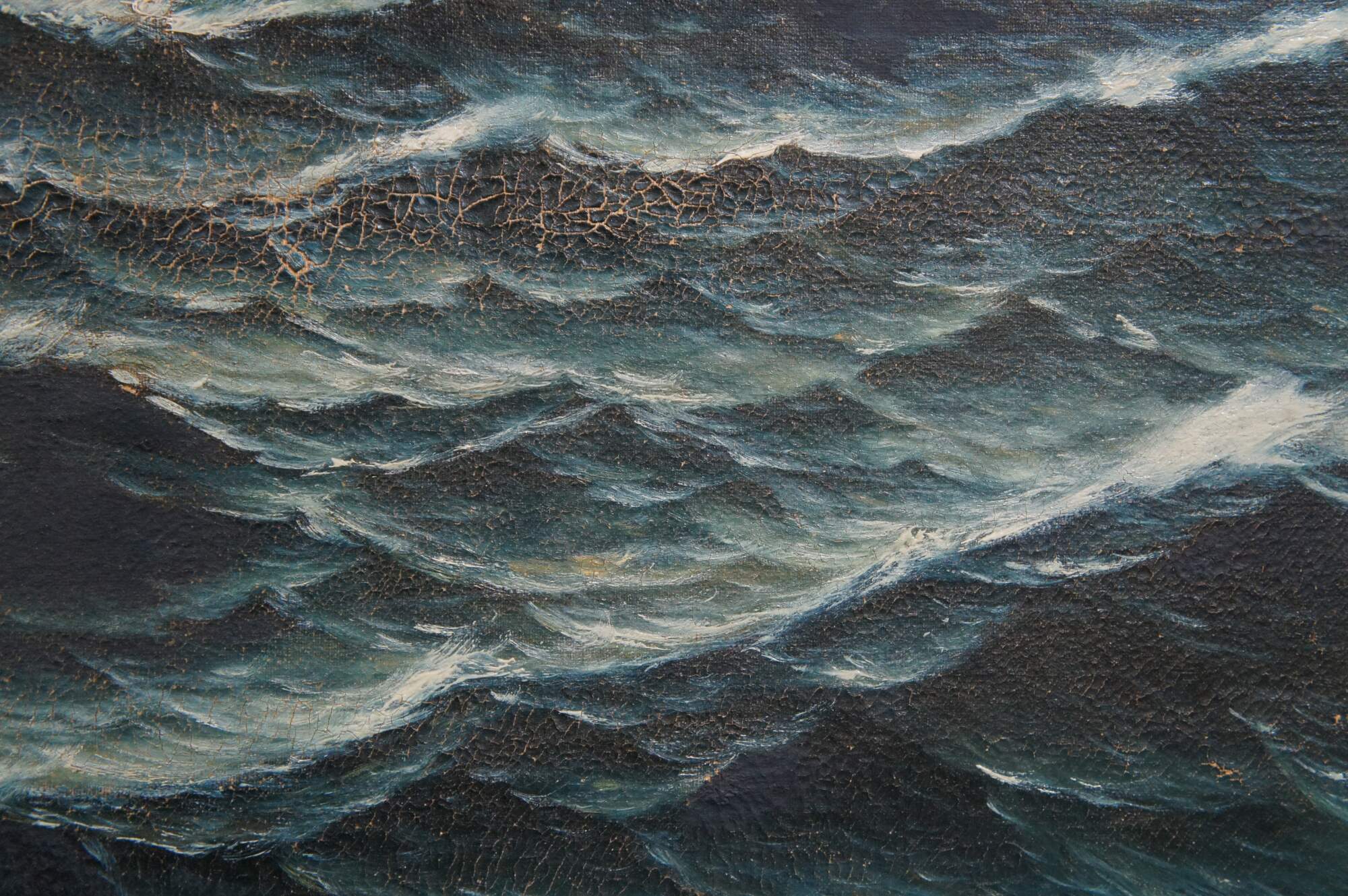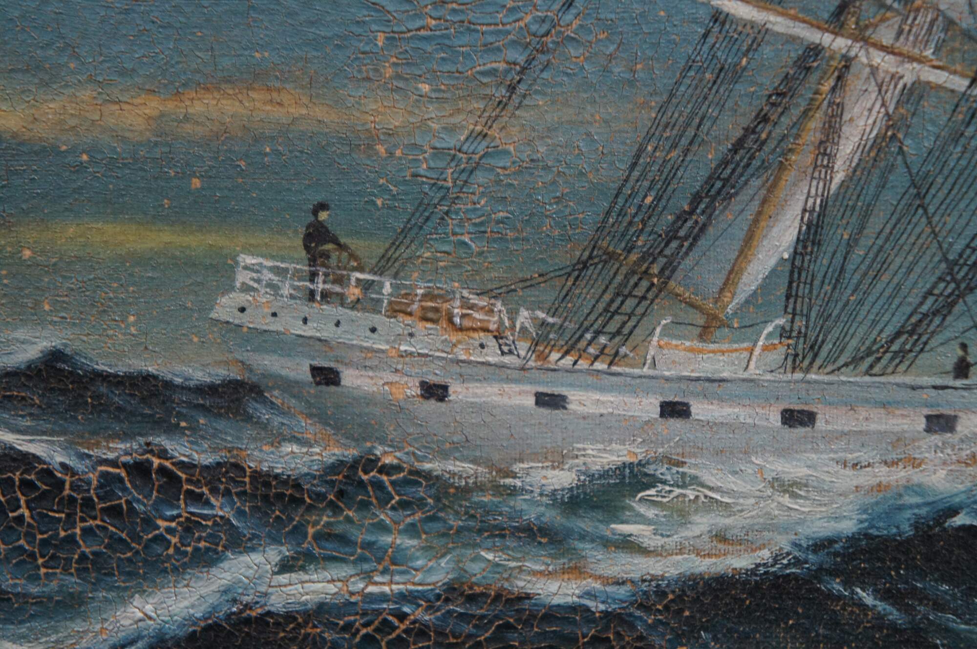 Antique Dutch School oil painting on canvas showing a yacht / clipper ship on a choppy sea. Signed in lower left corner J. Johannesen (Y. Yohannsen) – 1917.