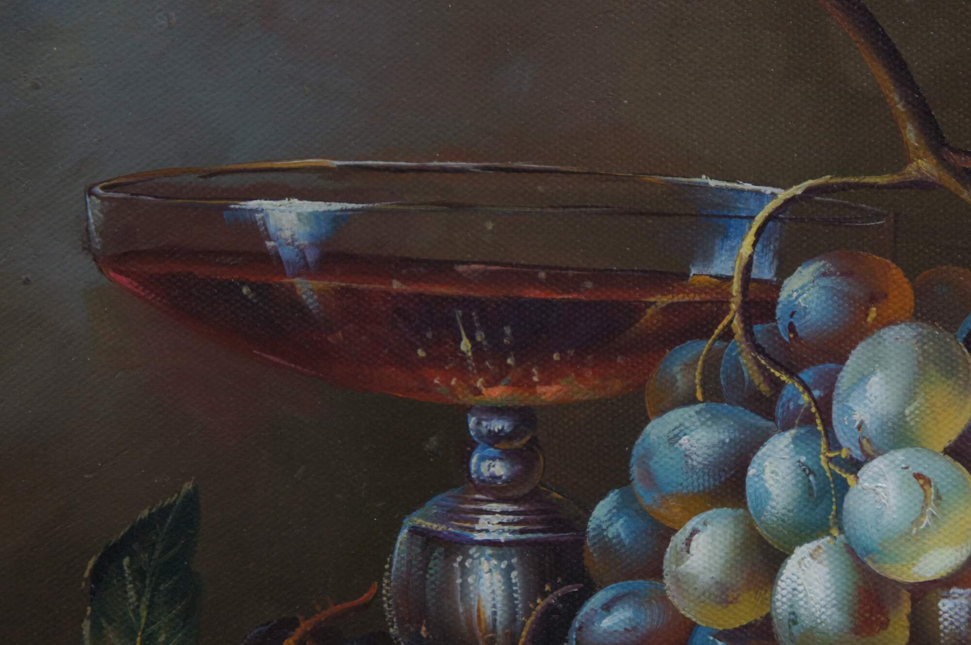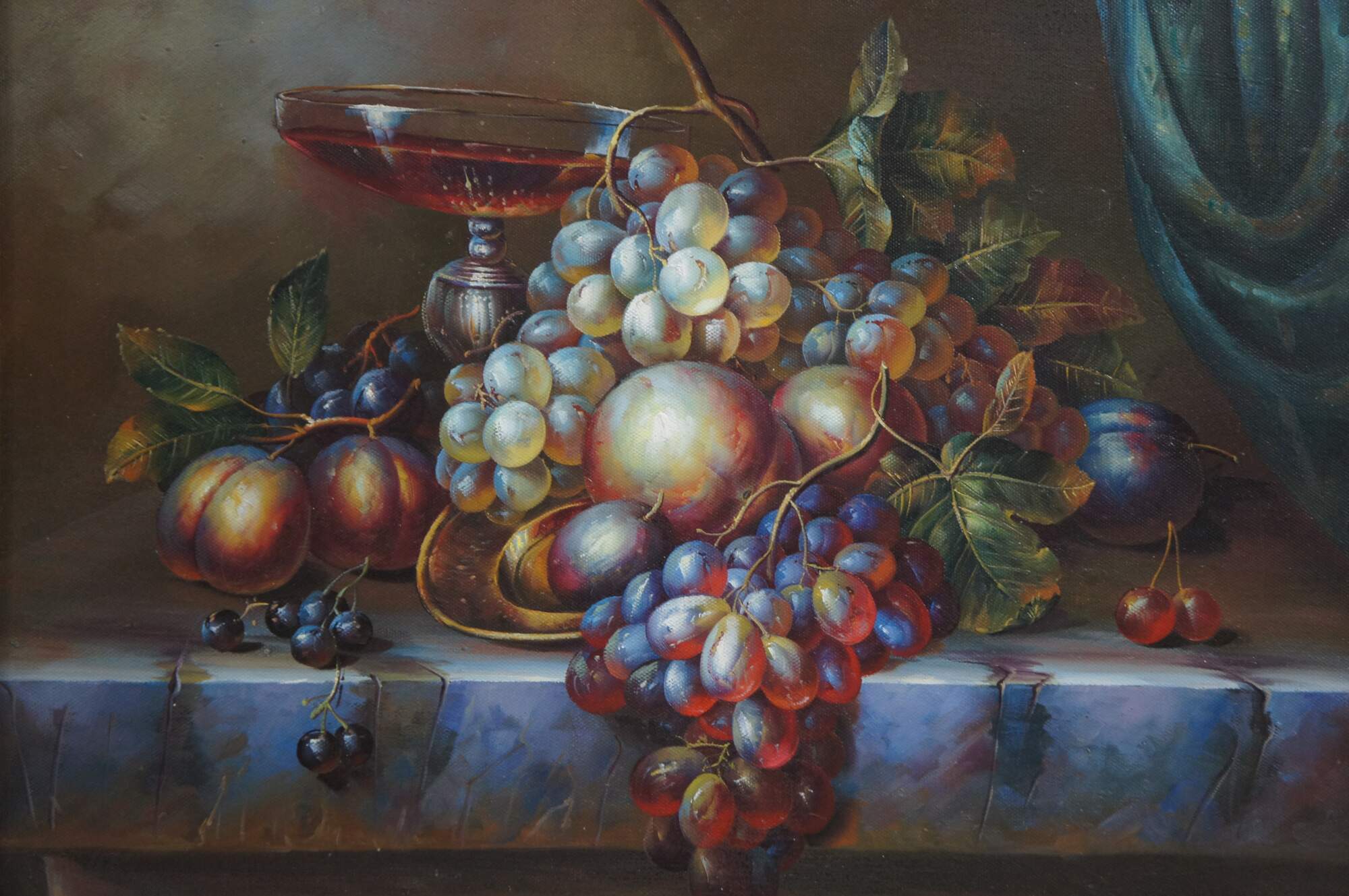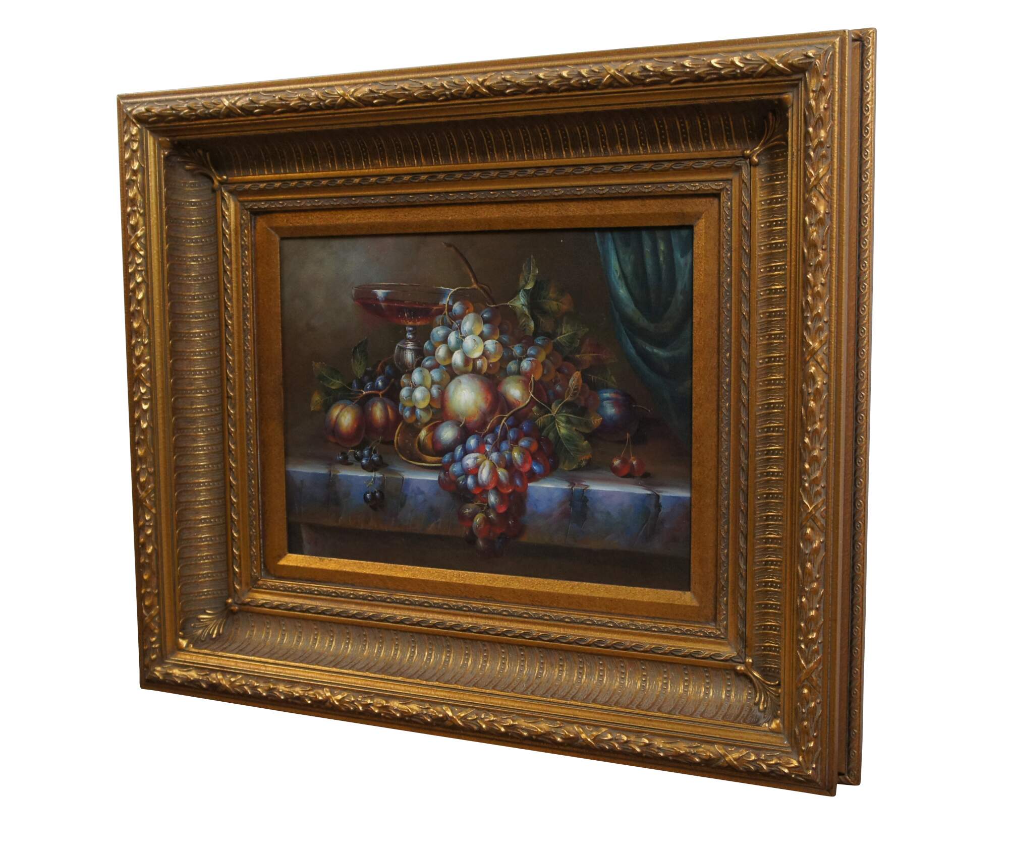 Late 20th century oil painting on canvas featuring a still life of grapes, peaches and plums and a goblet of wine on a stone table. Displayed in an elegantly carved gold gesso frame.