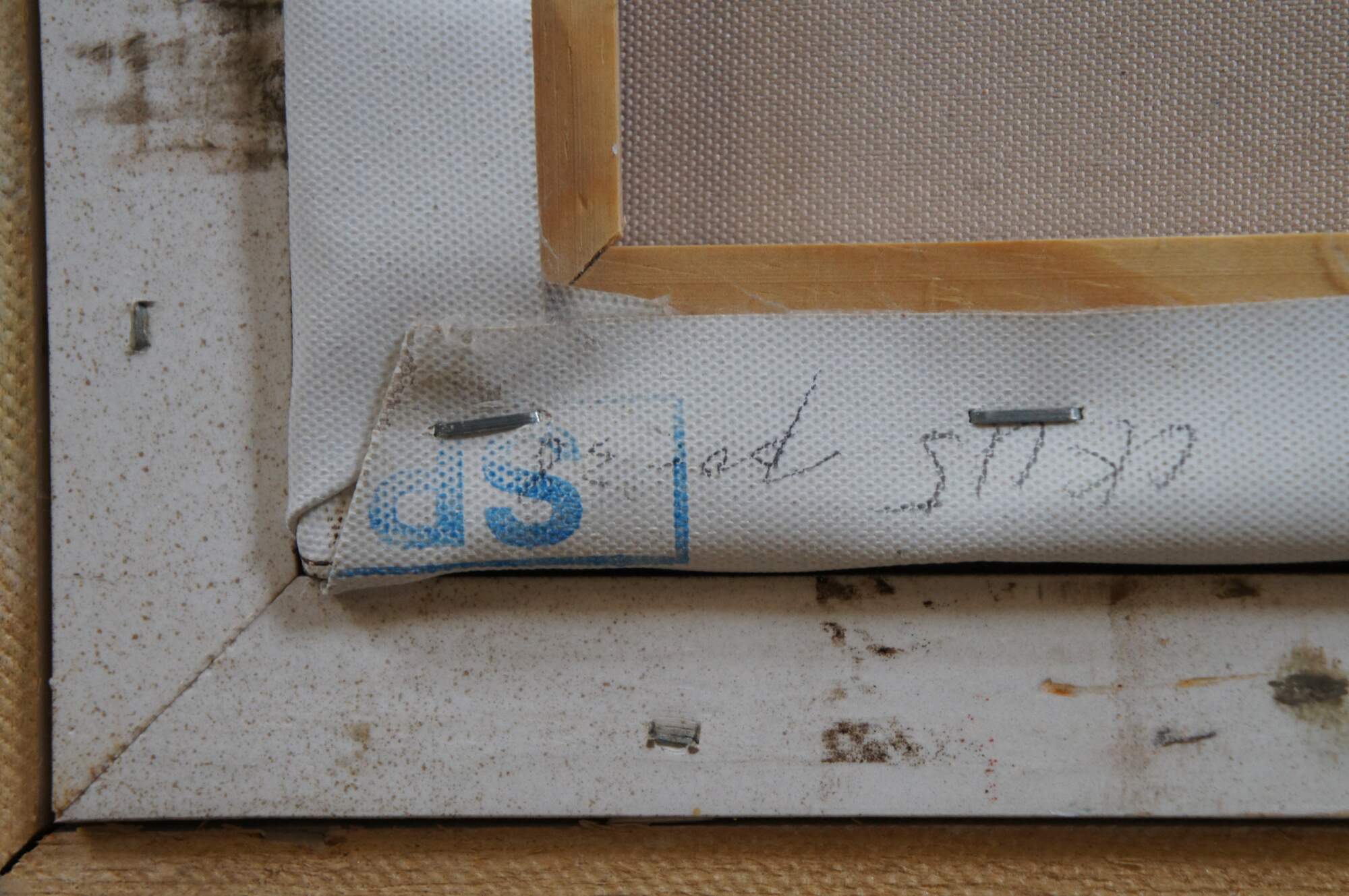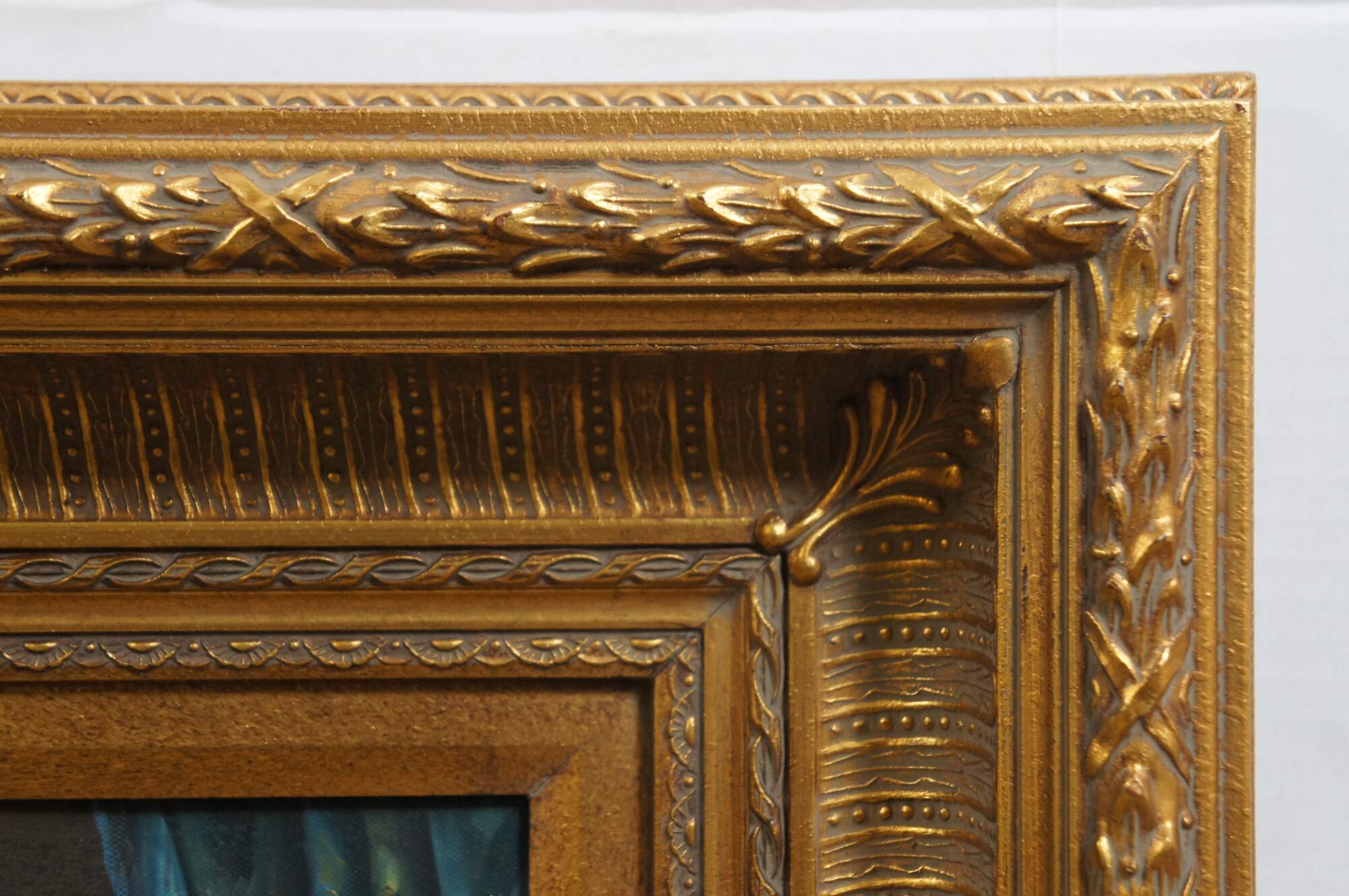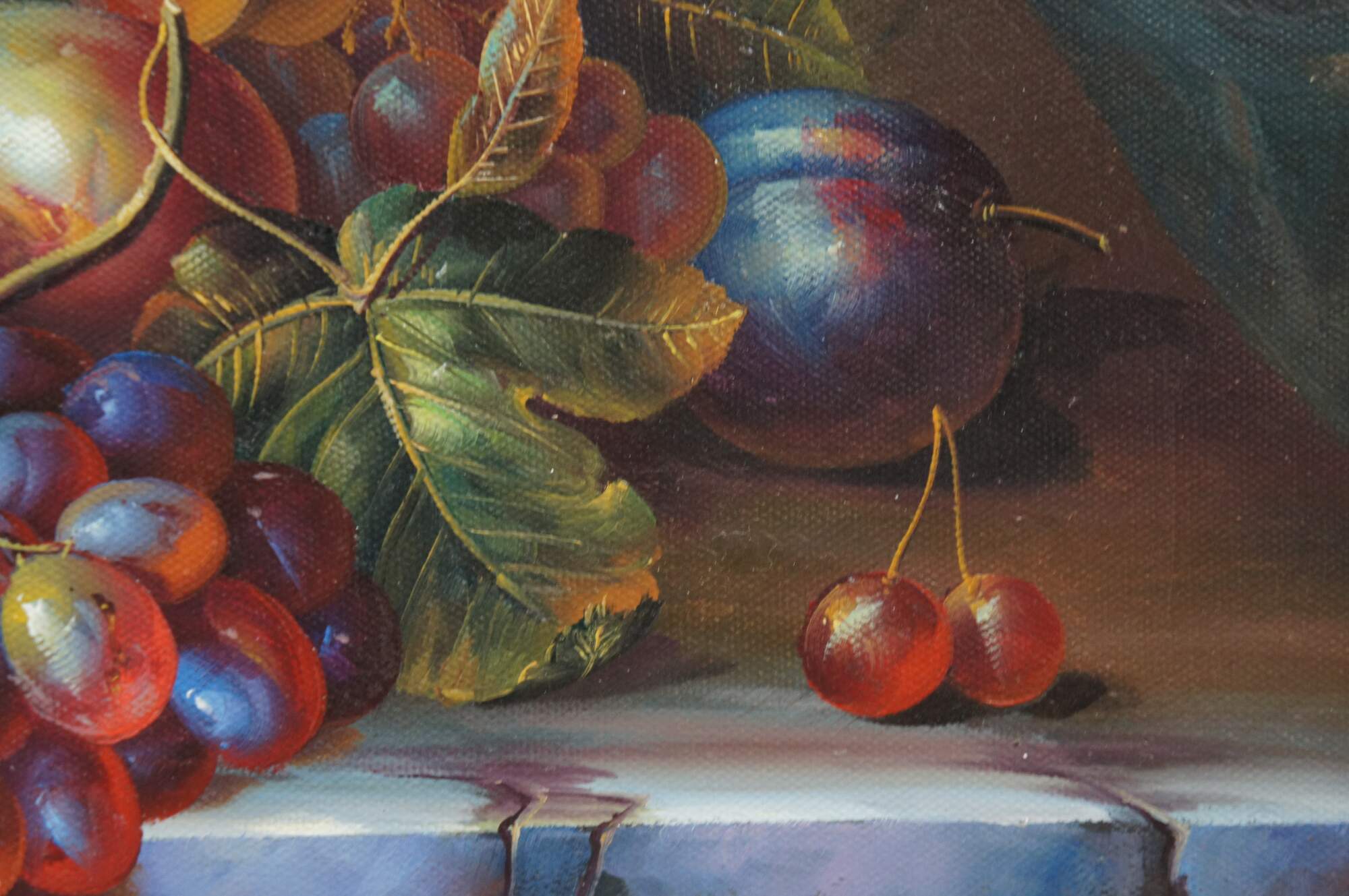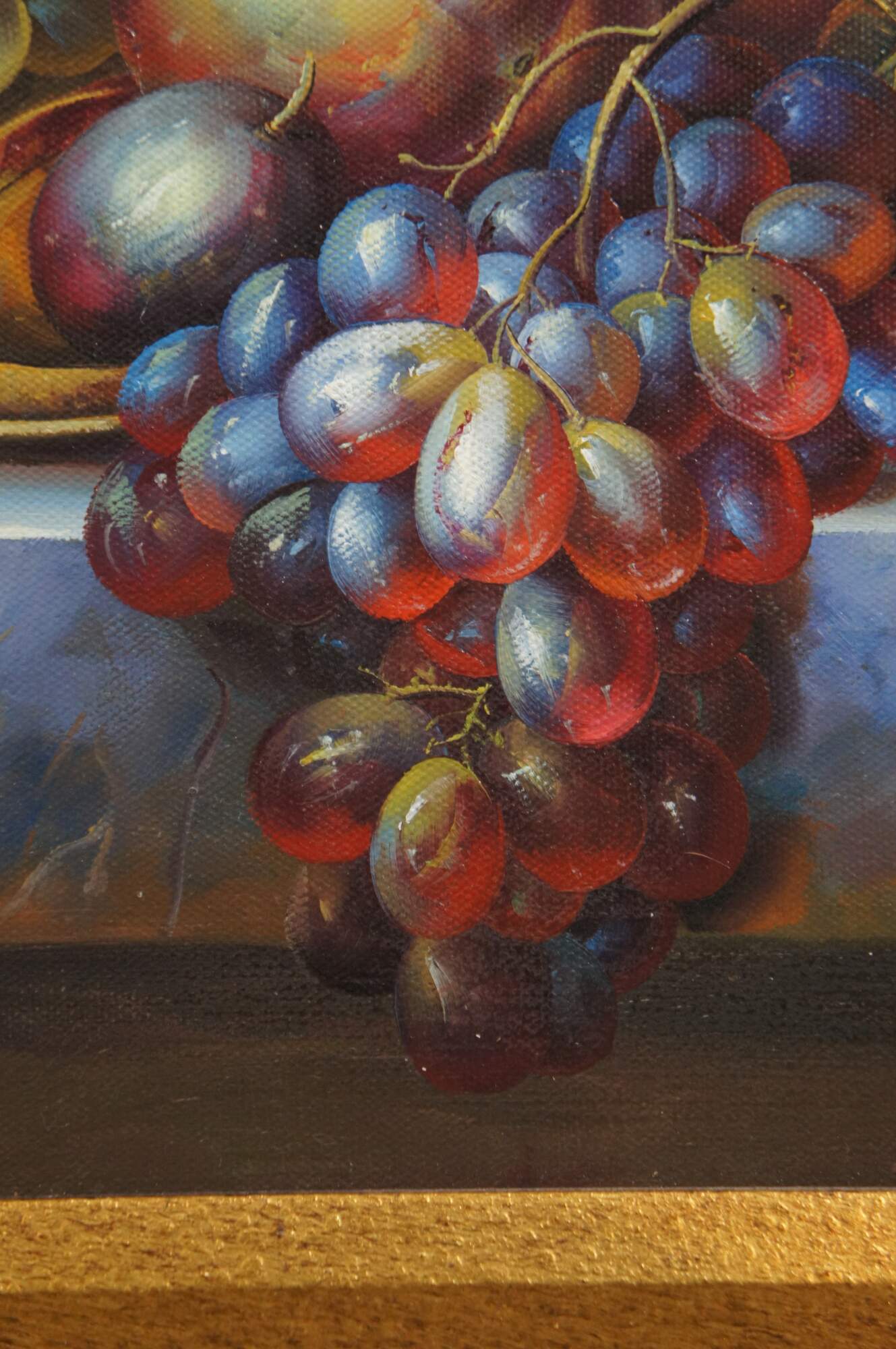 Late 20th century oil painting on canvas featuring a still life of grapes, peaches and plums and a goblet of wine on a stone table. Displayed in an elegantly carved gold gesso frame.