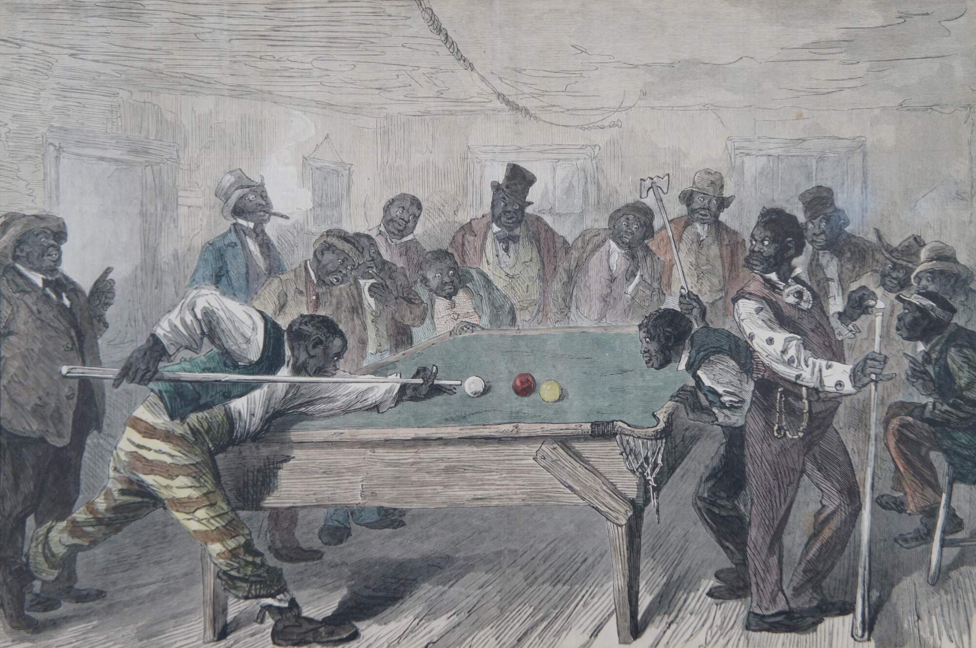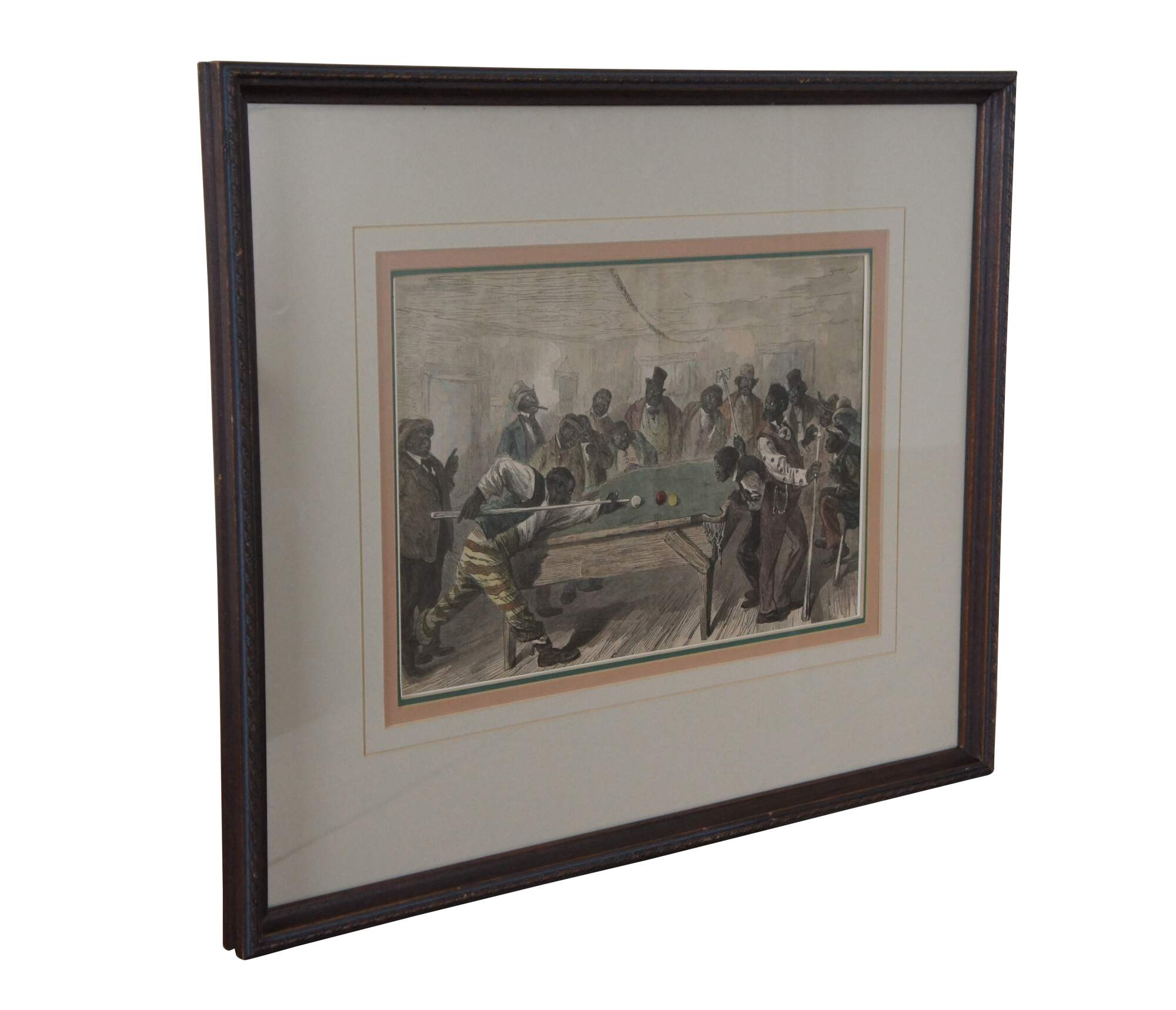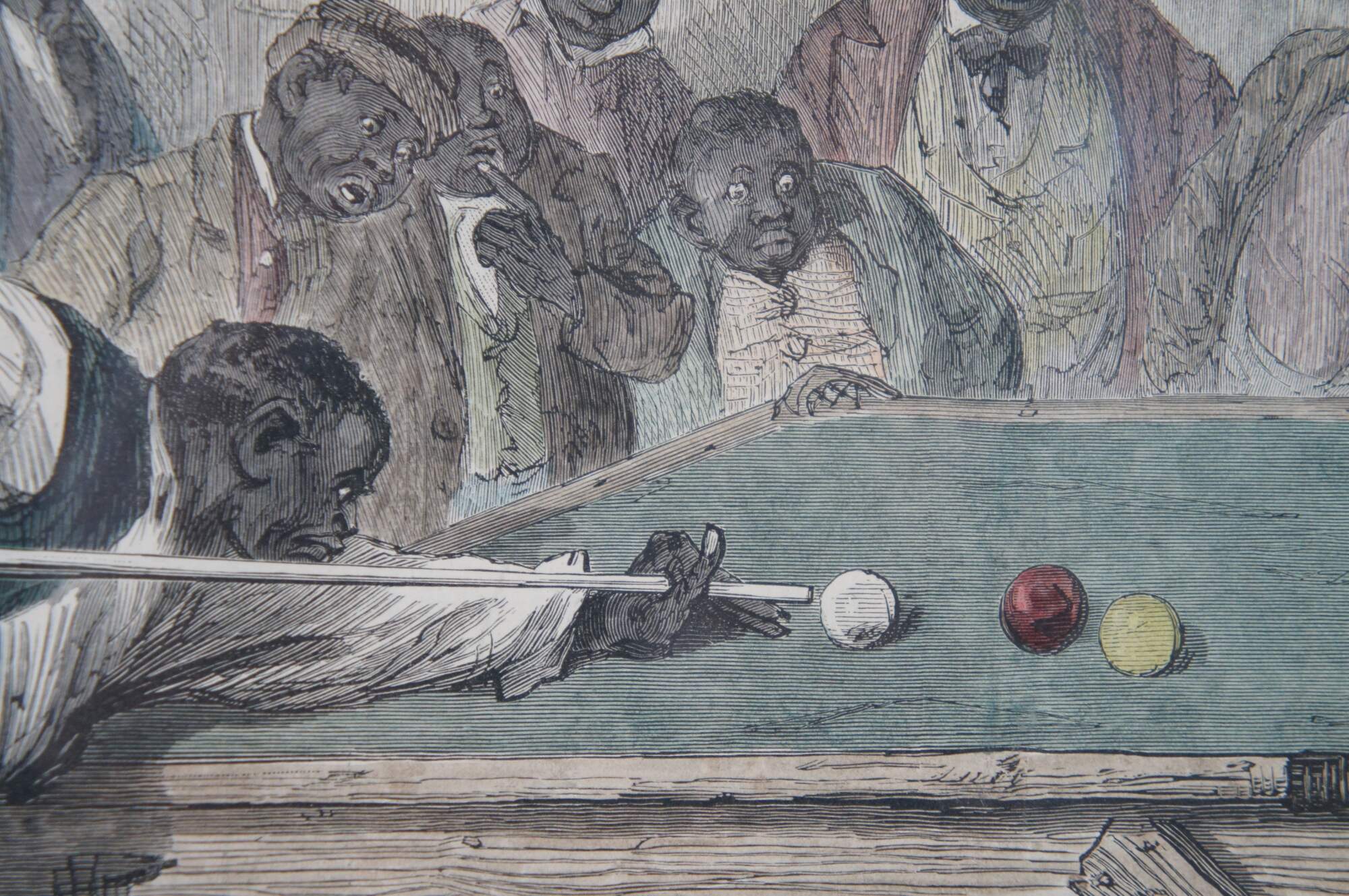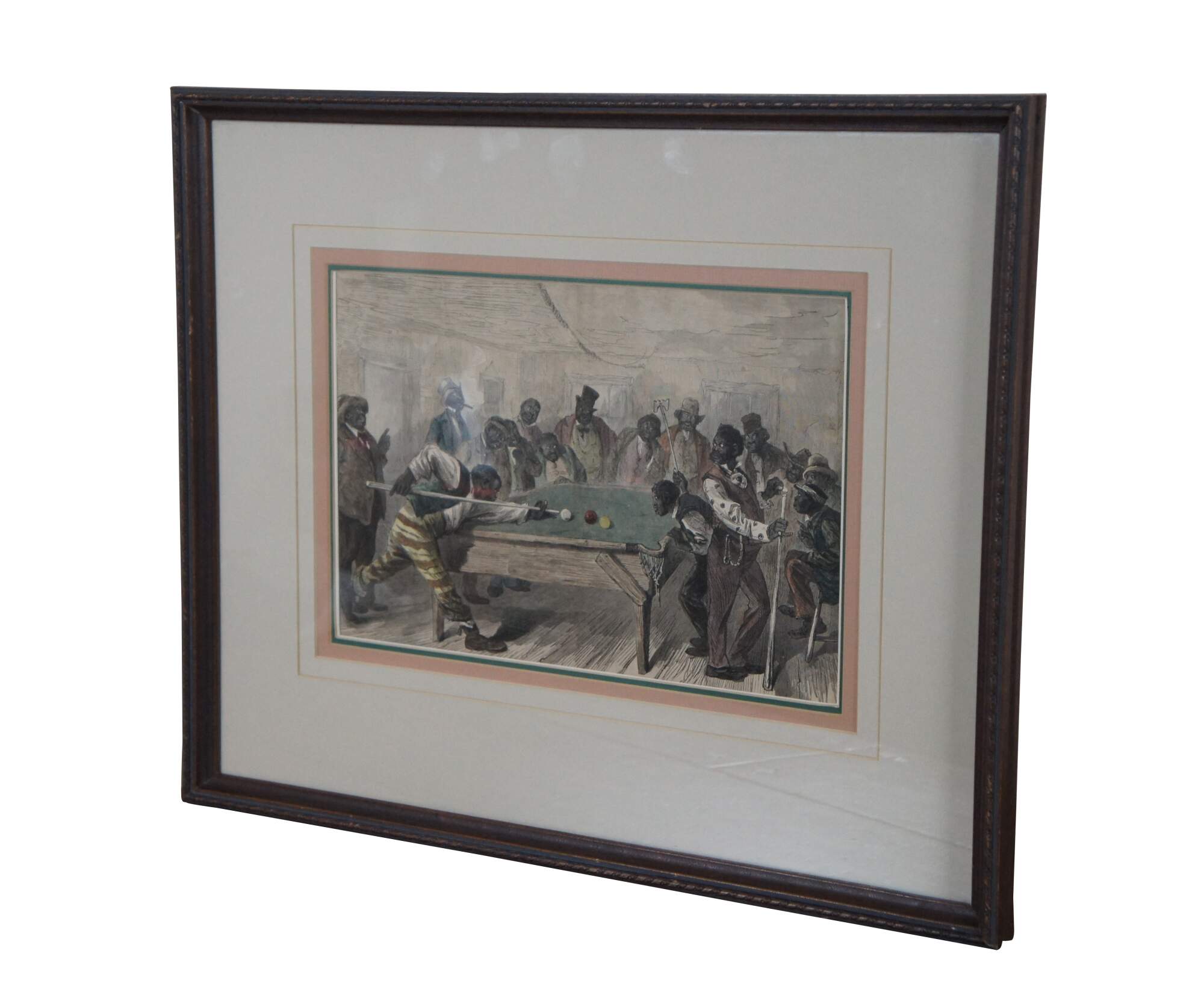 Antique late 19th century hand colored engraving titled “The Blackville Billiard Club” after Solomon Eytinge, showing a bar full of African American men playing pool / billiards. Cut from the March 31, 1883 edition Harper’s Weekly magazine.