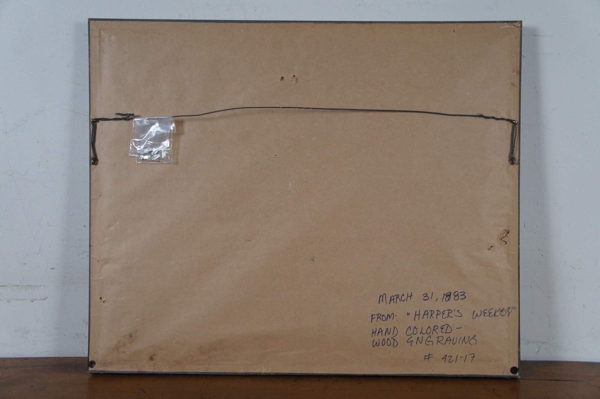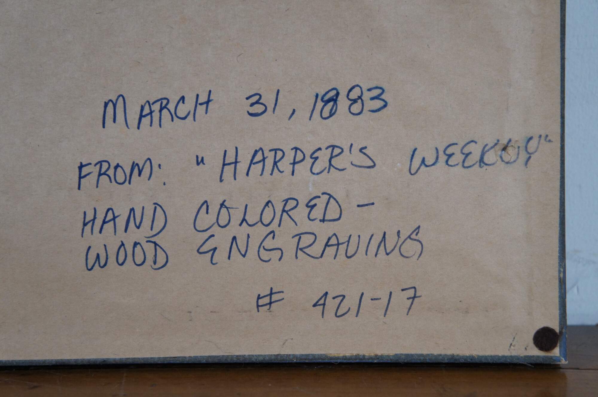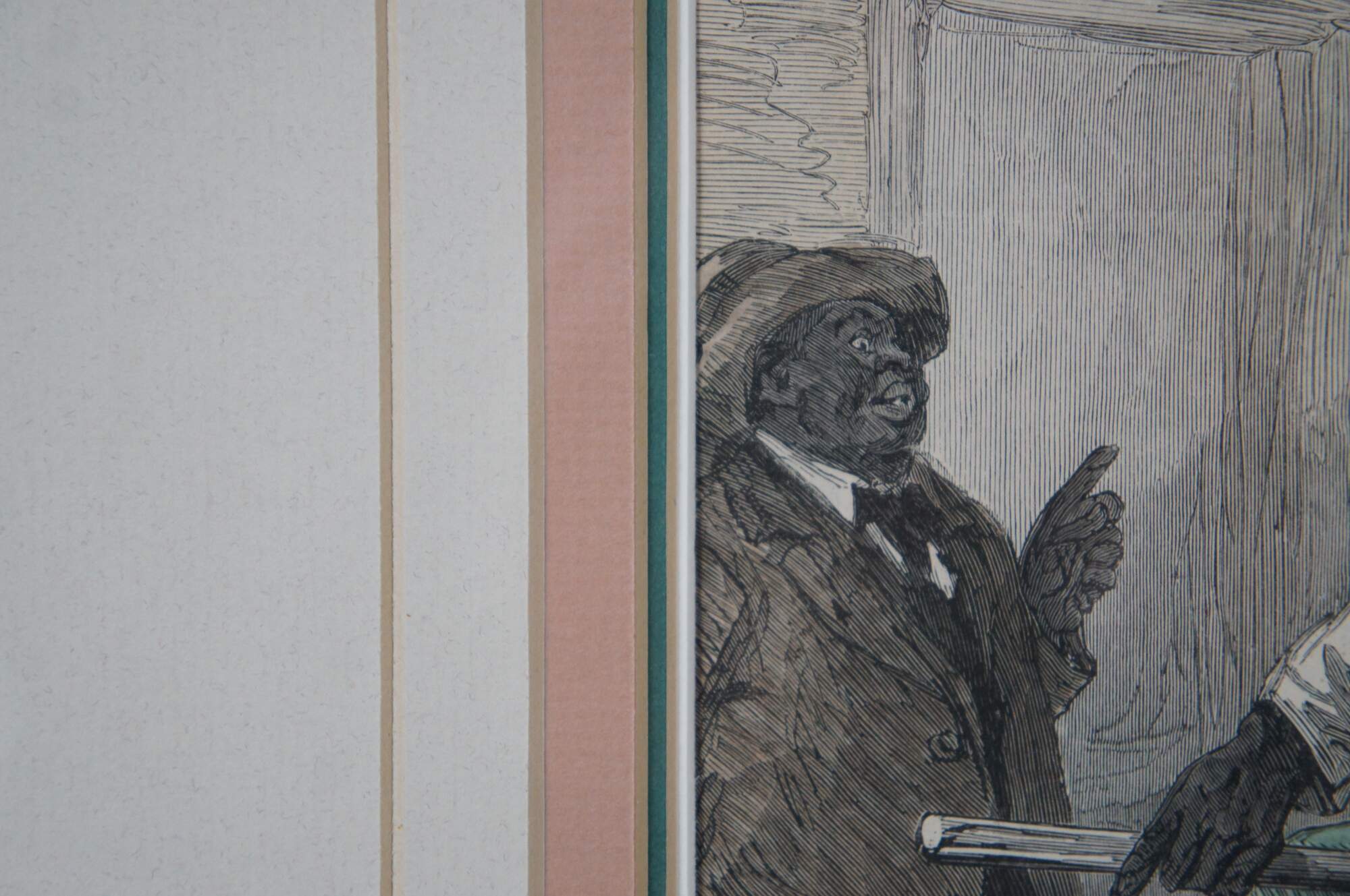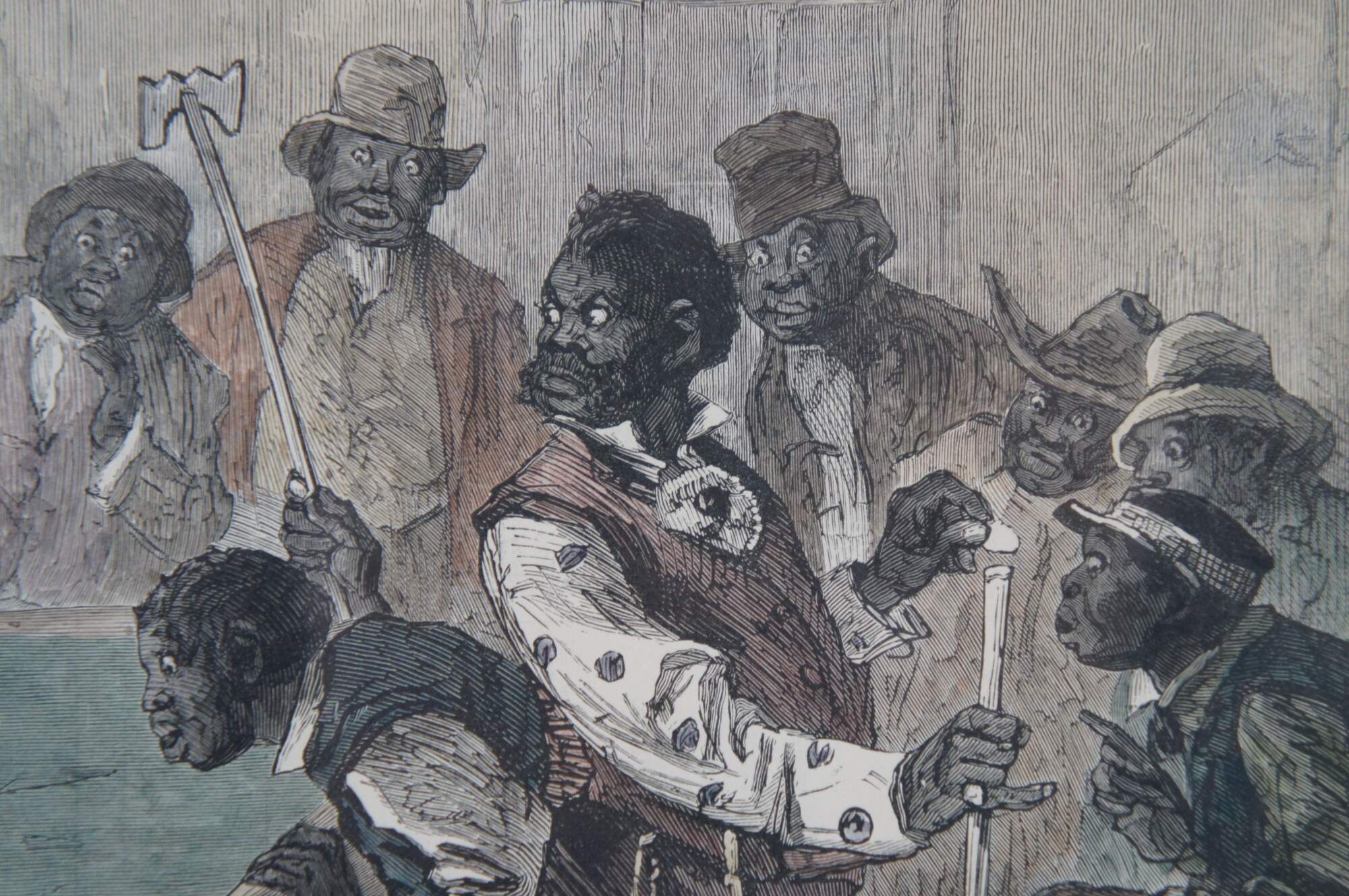 Antique late 19th century hand colored engraving titled “The Blackville Billiard Club” after Solomon Eytinge, showing a bar full of African American men playing pool / billiards. Cut from the March 31, 1883 edition Harper’s Weekly magazine.