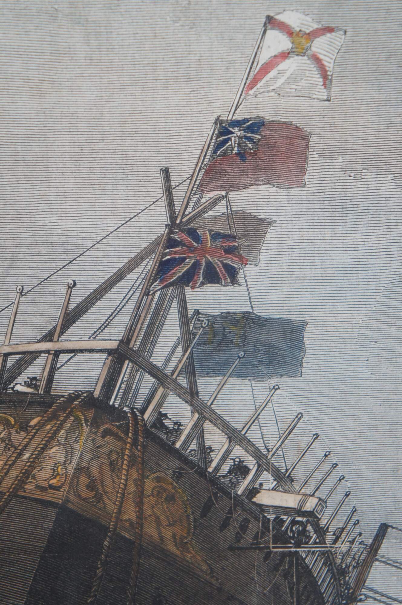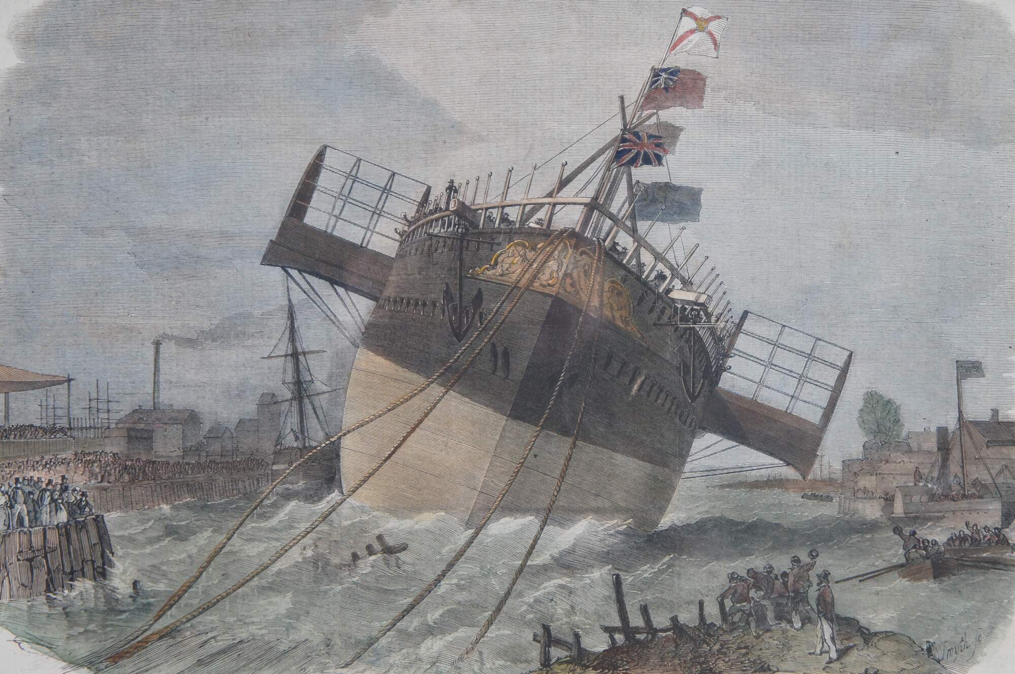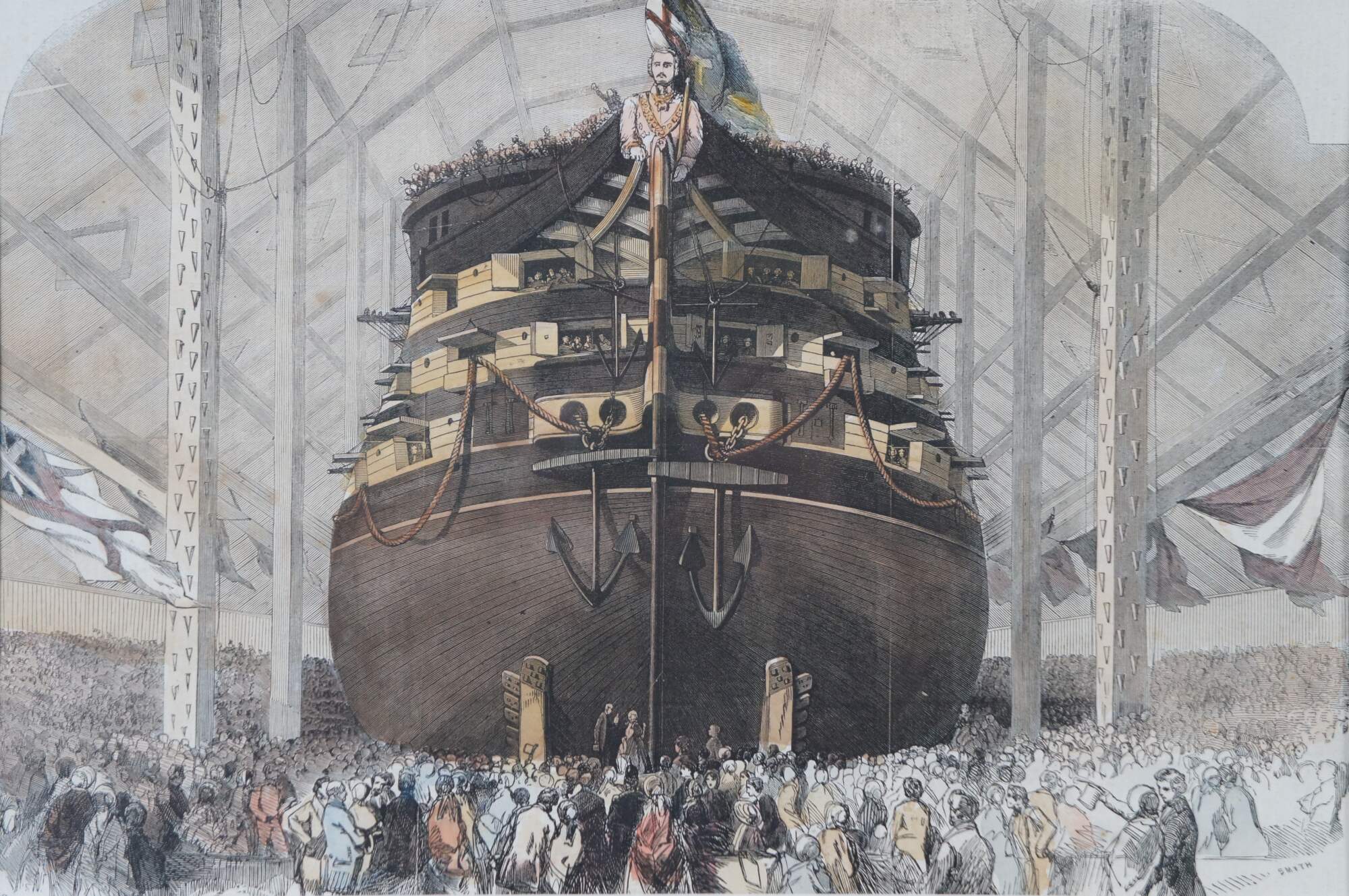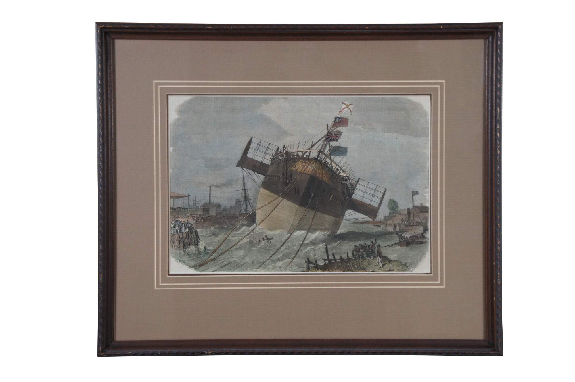 Pair of antique nautical / maritime hand colored engravings depicting “The Launch of the H.M.S. Royal Albert” from the Woolwich Dockyard and “The Launch of the Paramatta,” from the Illustrated London News, both signed in plate by illustrator / engraver, Frederick James Smyth.