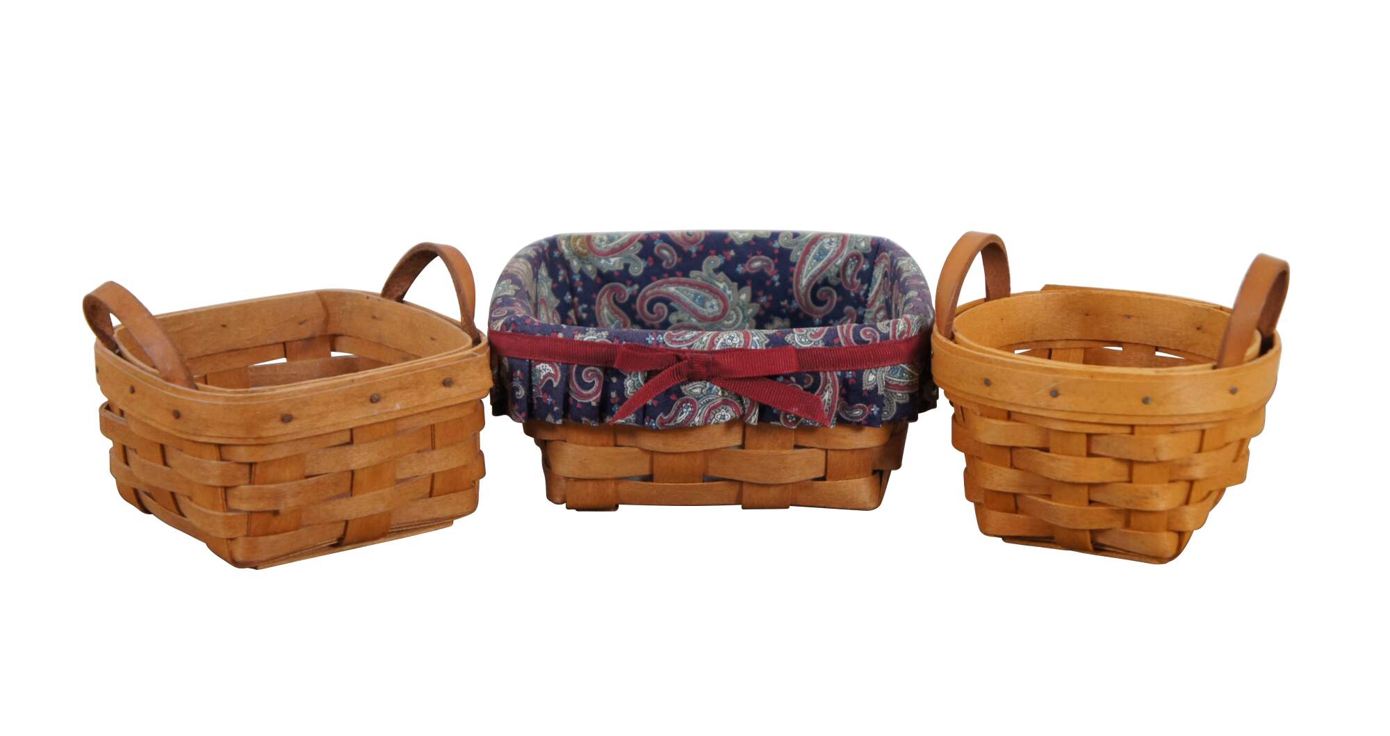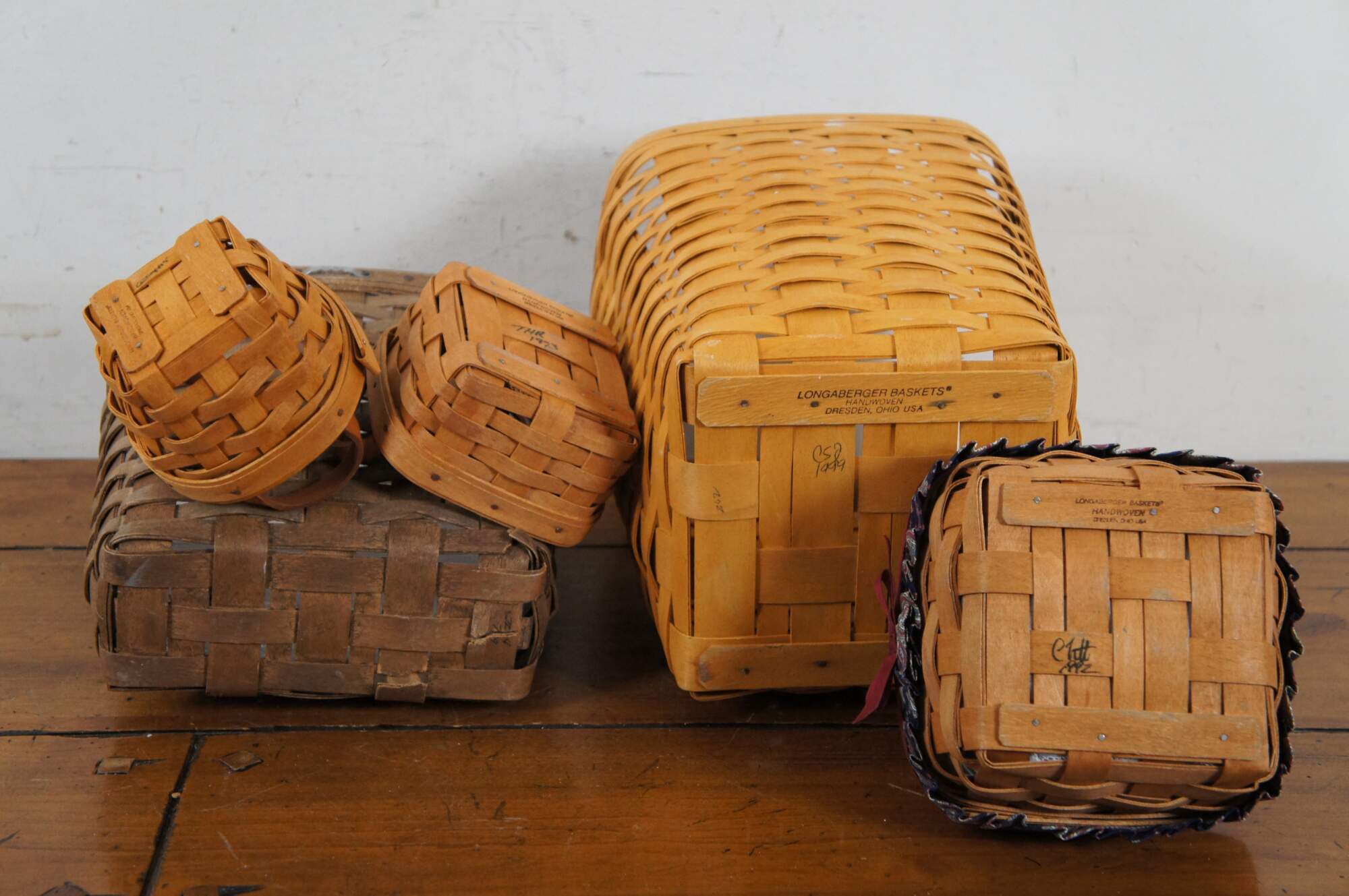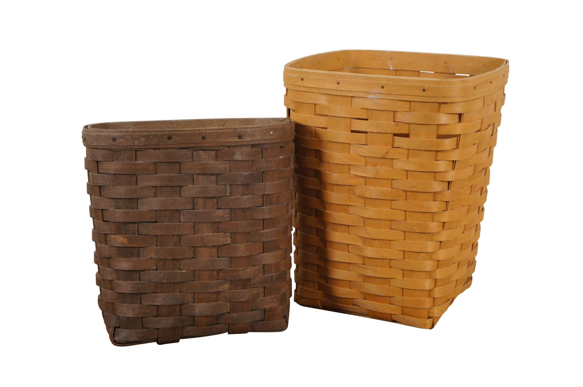 Lot of five vintage Longaberger hand woven maple baskets including on wall hanging mail basket with plastic liner, a square 12" waste basket, small square basket with paisley cotton liner, and two miniature baskets - one square and one round - with leather handles. Signed JDH 79, Chtl 1992, THR 1993, CEG 1995, CSJ 1999.