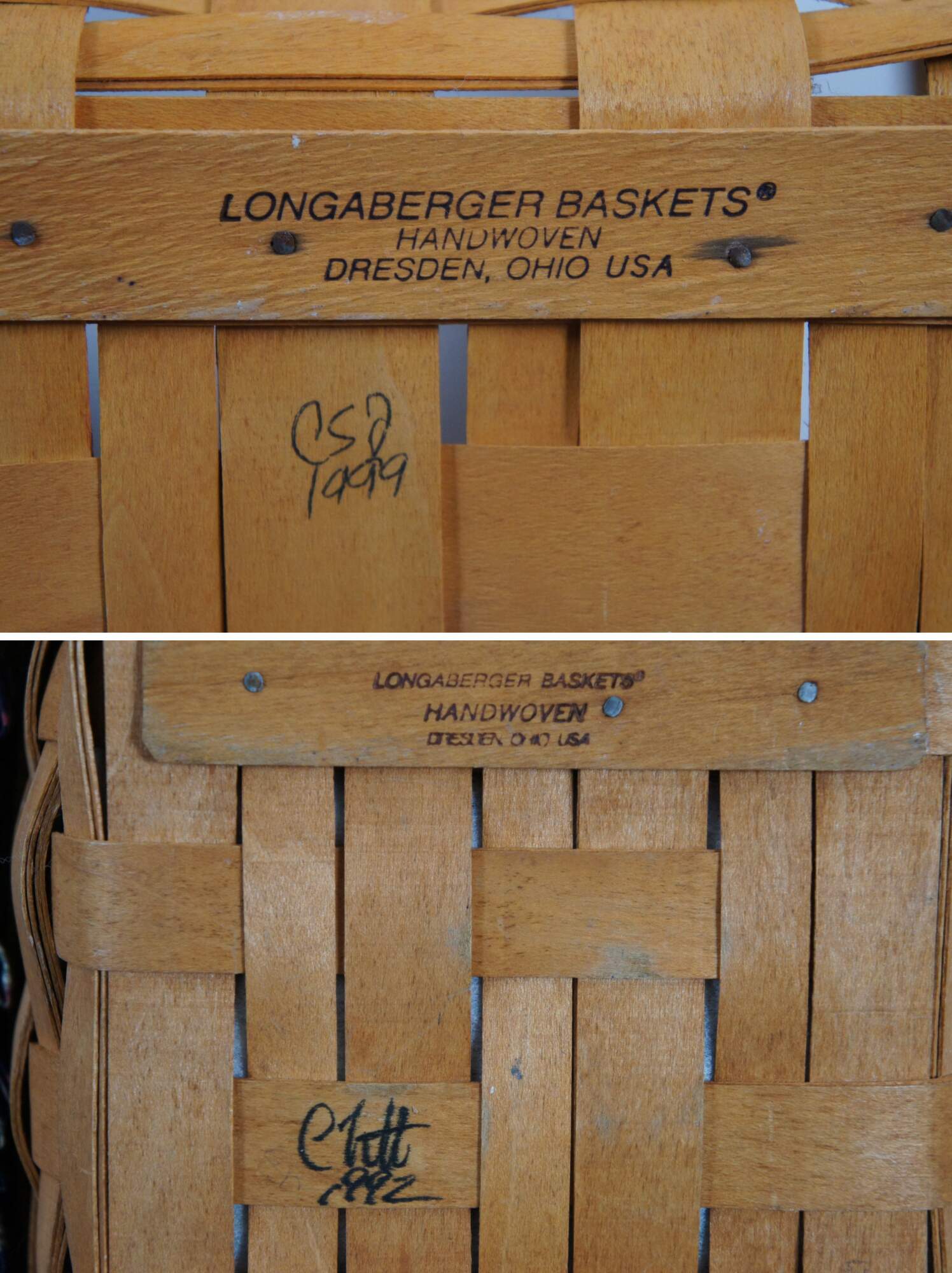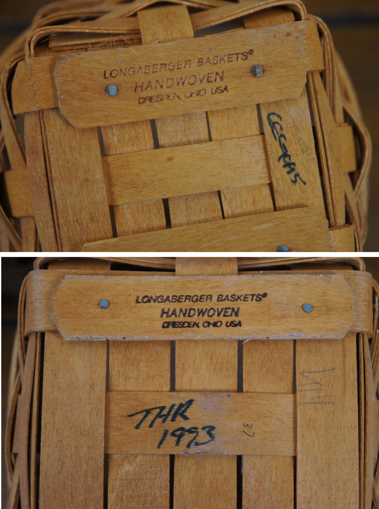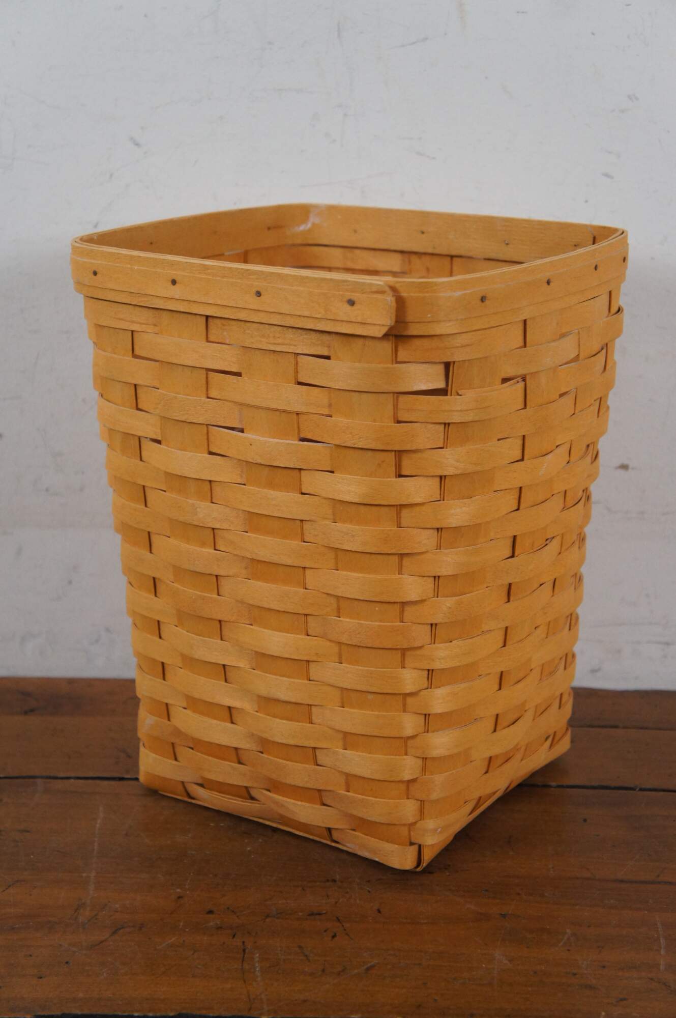Lot of five vintage Longaberger hand woven maple baskets including on wall hanging mail basket with plastic liner, a square 12" waste basket, small square basket with paisley cotton liner, and two miniature baskets - one square and one round - with leather handles. Signed JDH 79, Chtl 1992, THR 1993, CEG 1995, CSJ 1999.