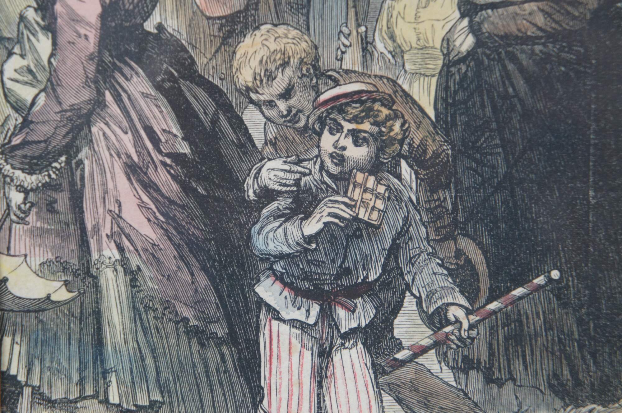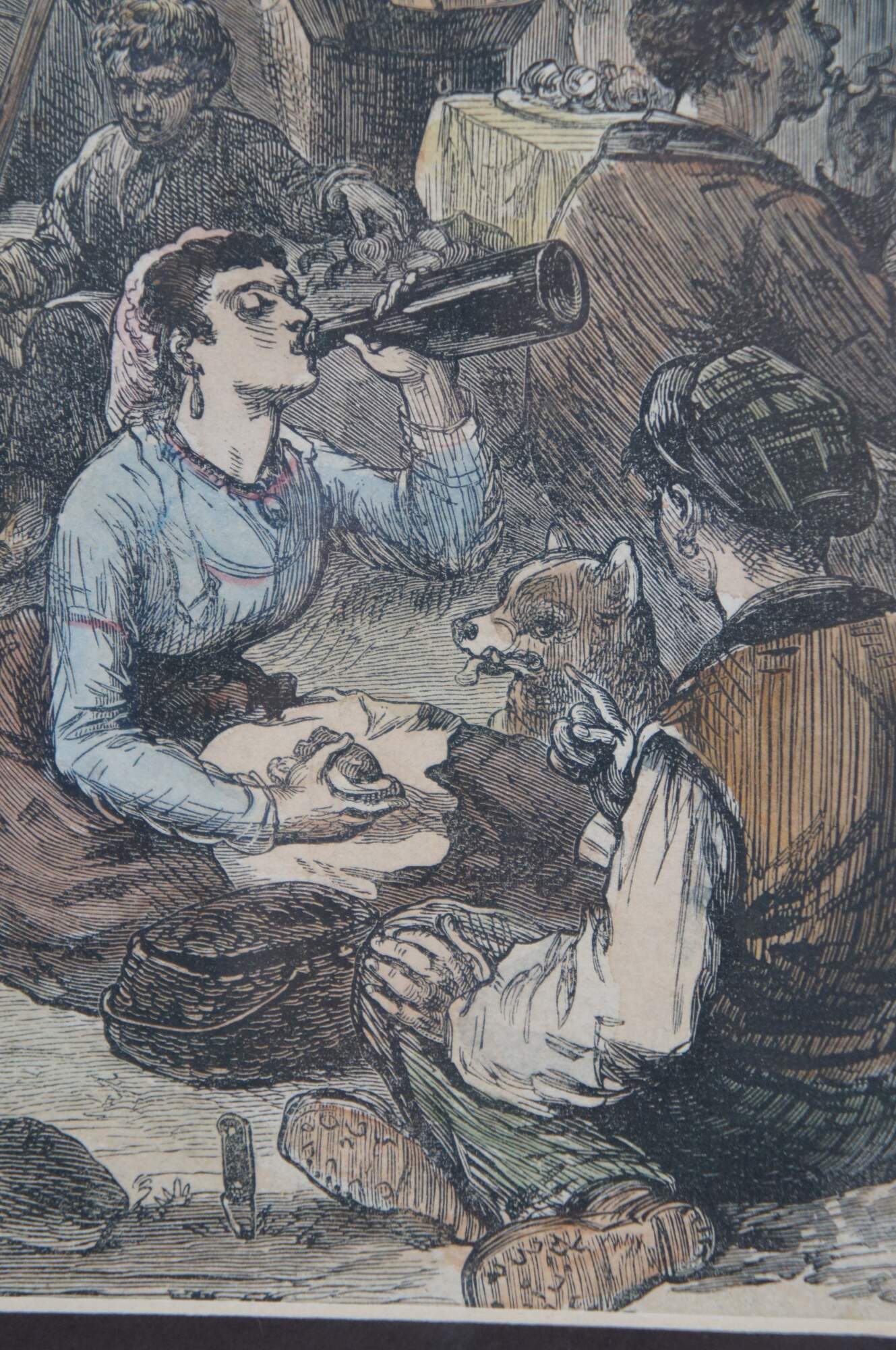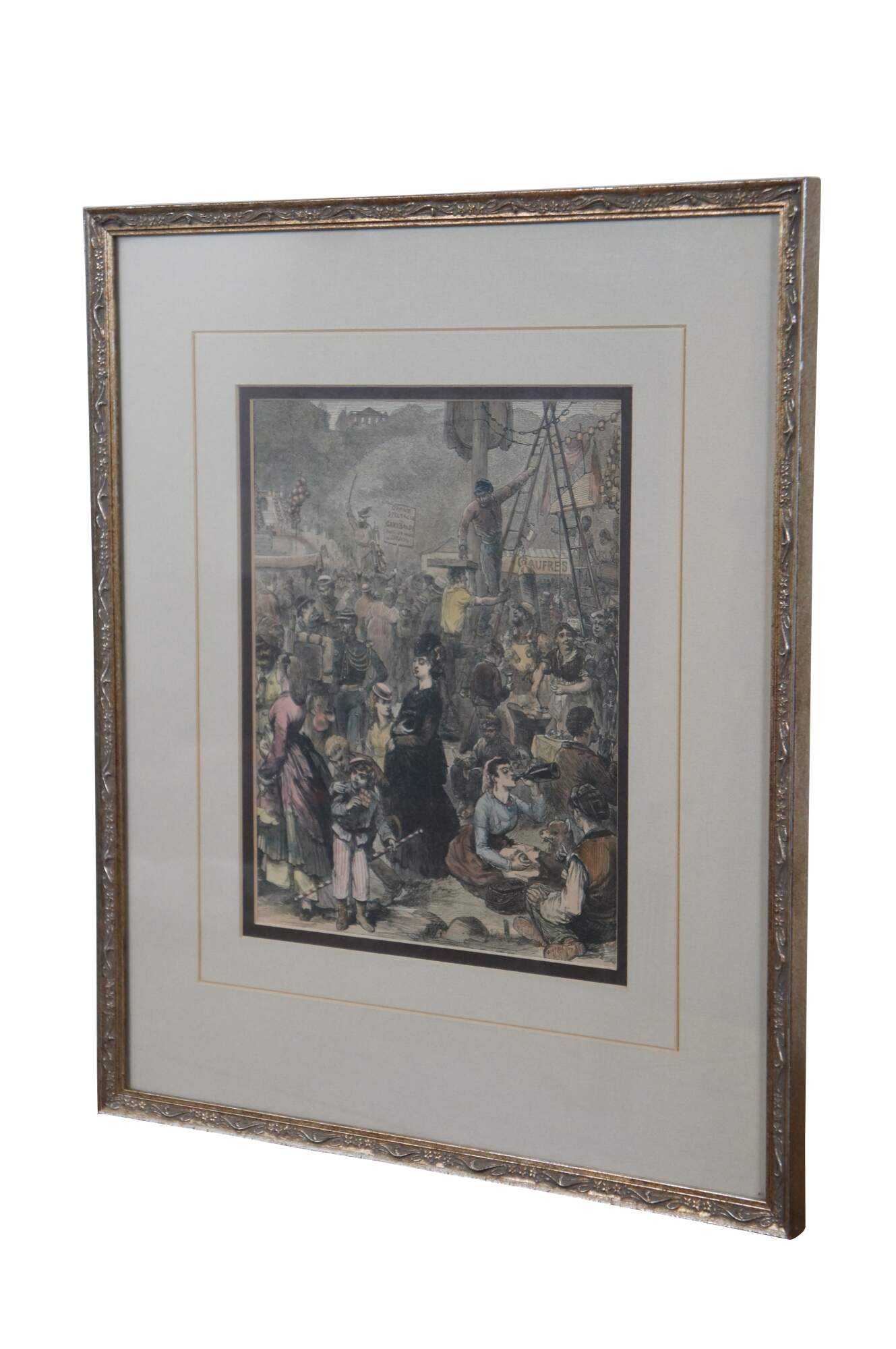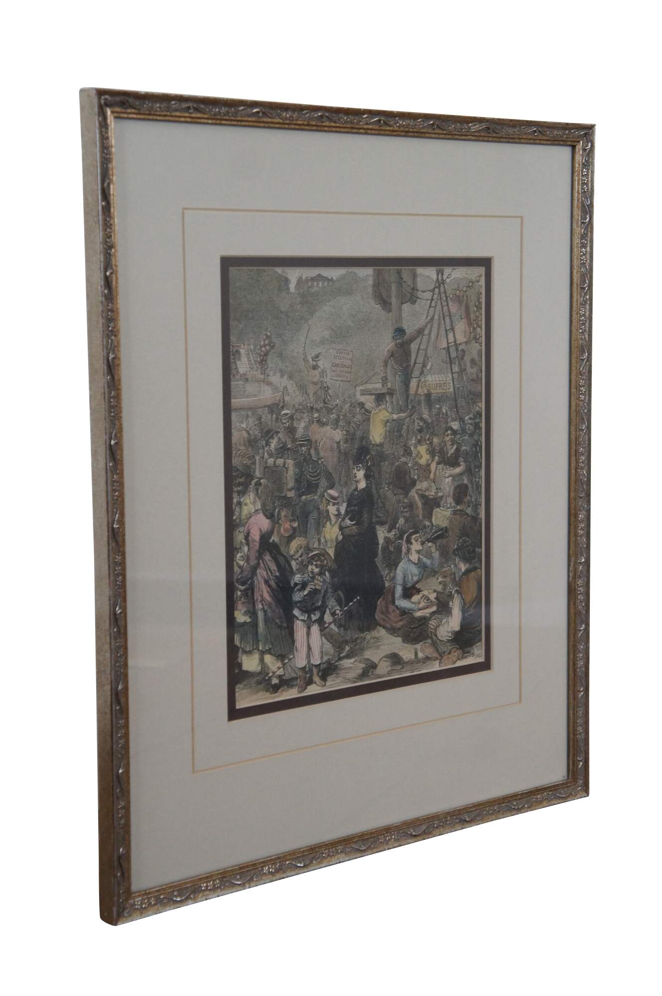Framed antique hand colored wood engraving depicting "The Fair of St Cloud Near Paris" by Felix Regamey, showing a crowded throng of people enjoying a festival. Engraved by J.W. Palmer, 1871. Framed in a distressed gilded floral frame. This image comes from the Illustrated London News.