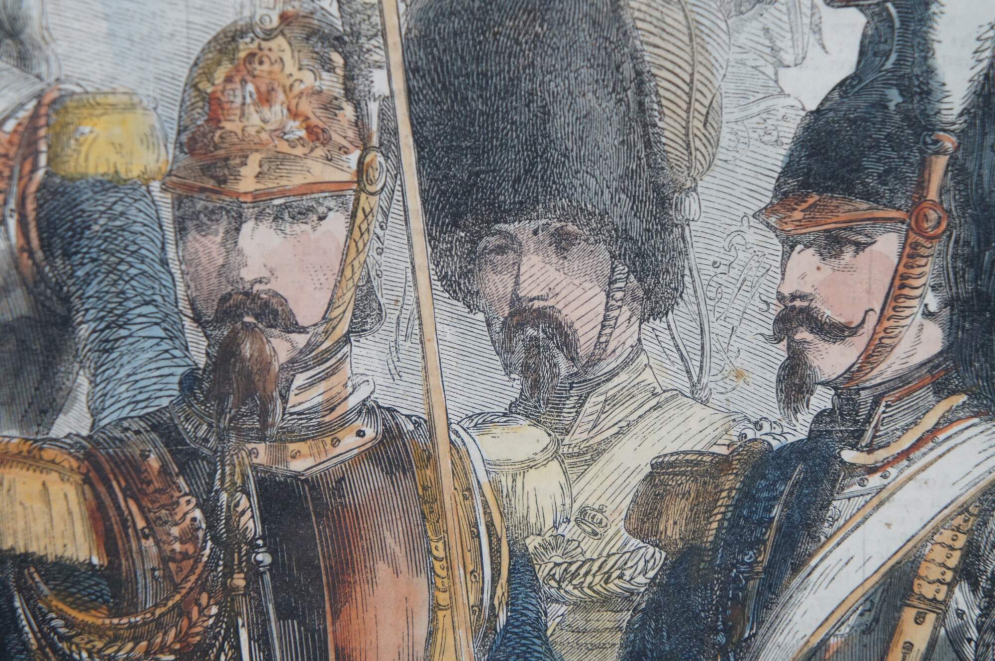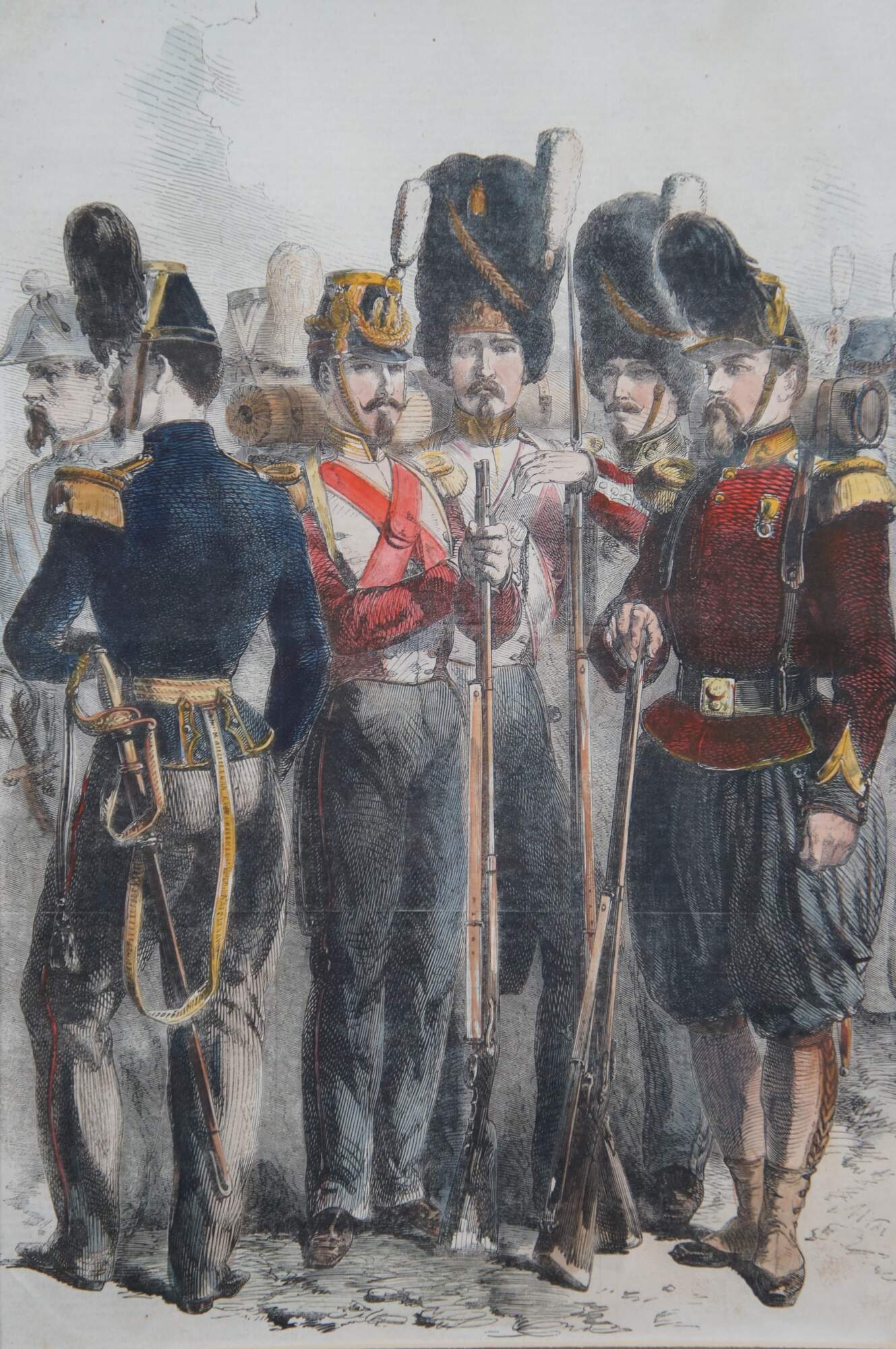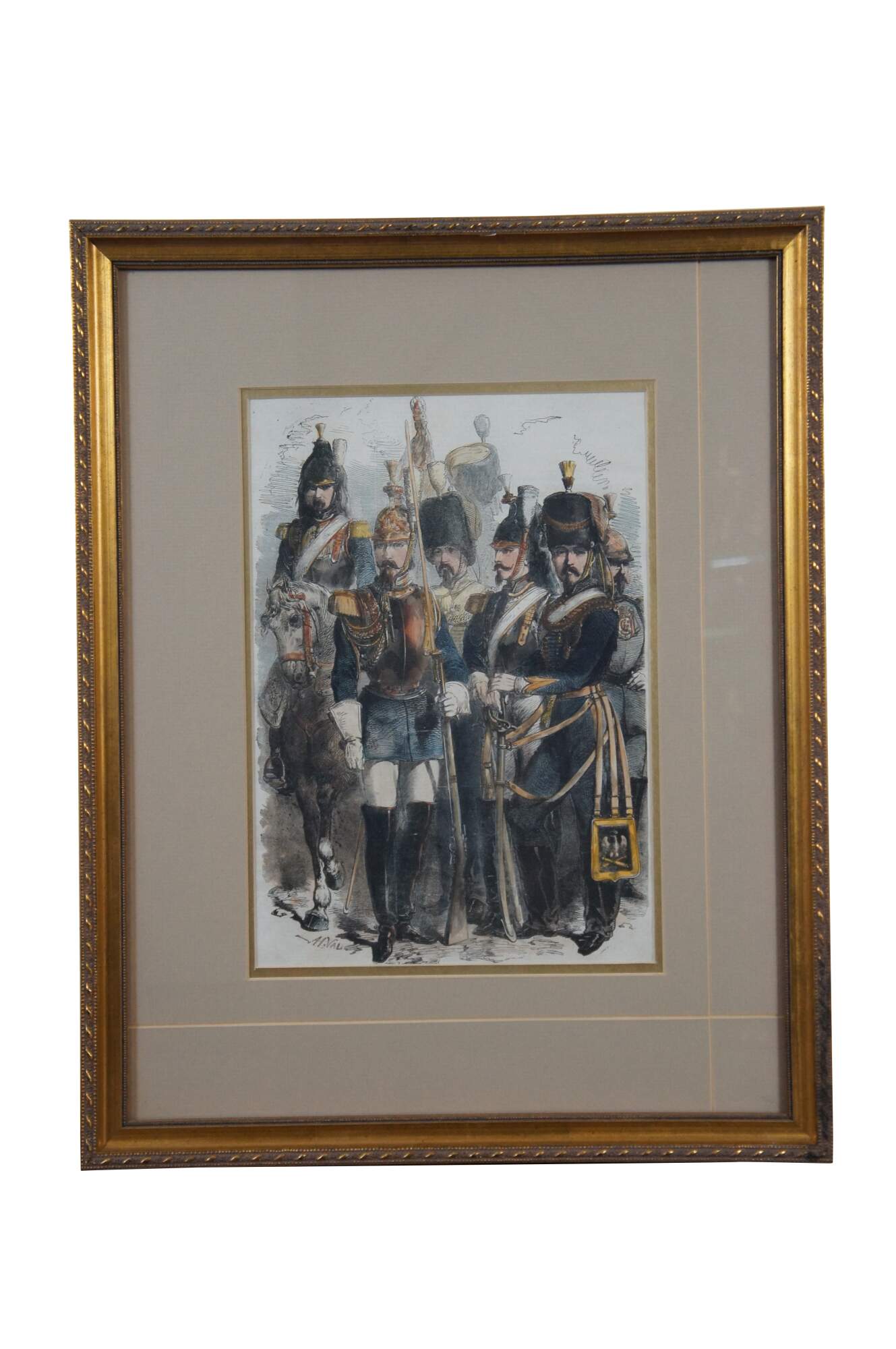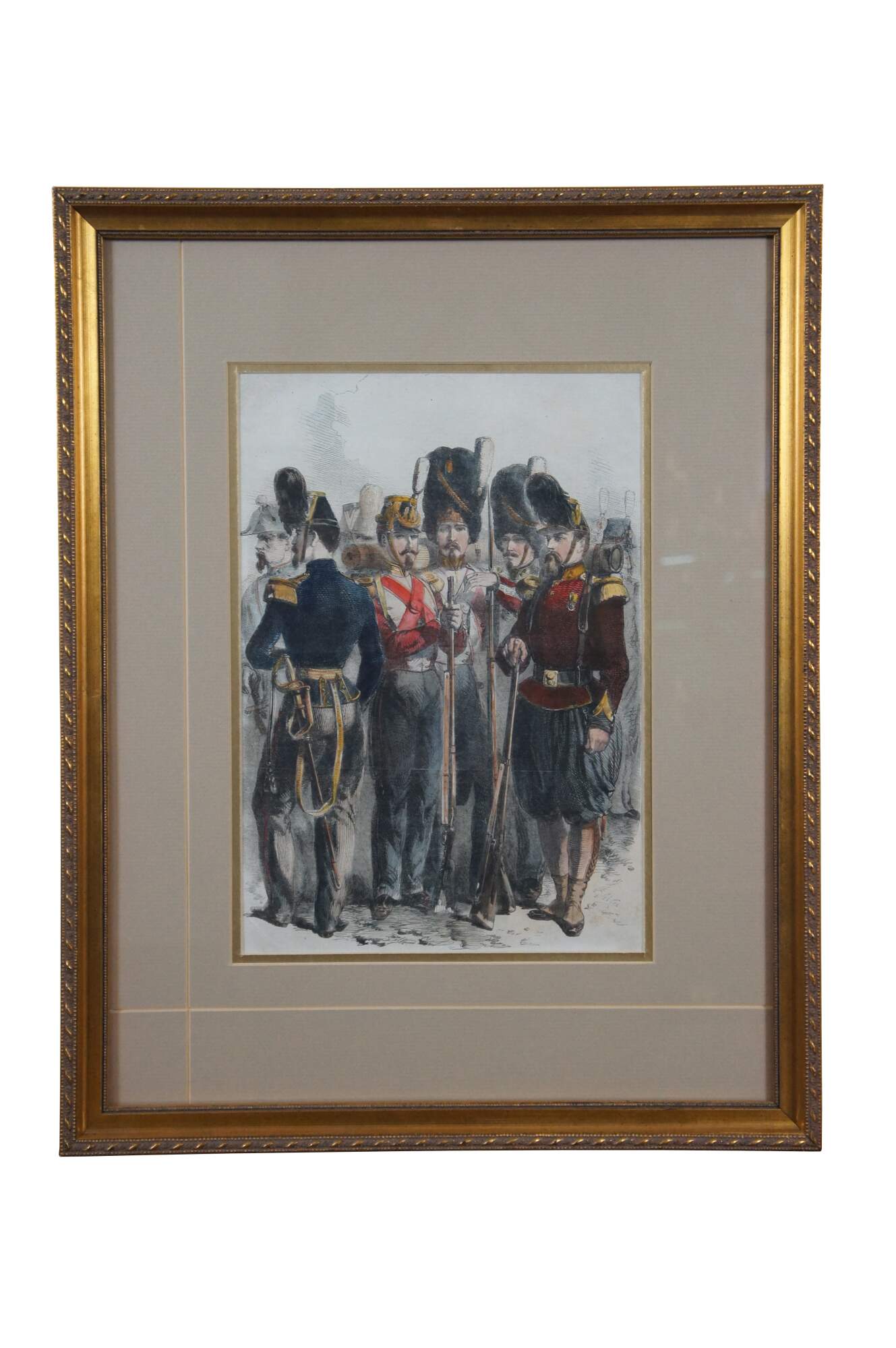 Pair of 19th century hand colored engravings depicting "Infantry & Calvary of the French Imperial Guard", for the Illustrated London News 1854. Signed in plate in lower left corner A.H. Val. Features hand cut mats, framed in gilded, beveled frames with beaded and ribbon twist details.