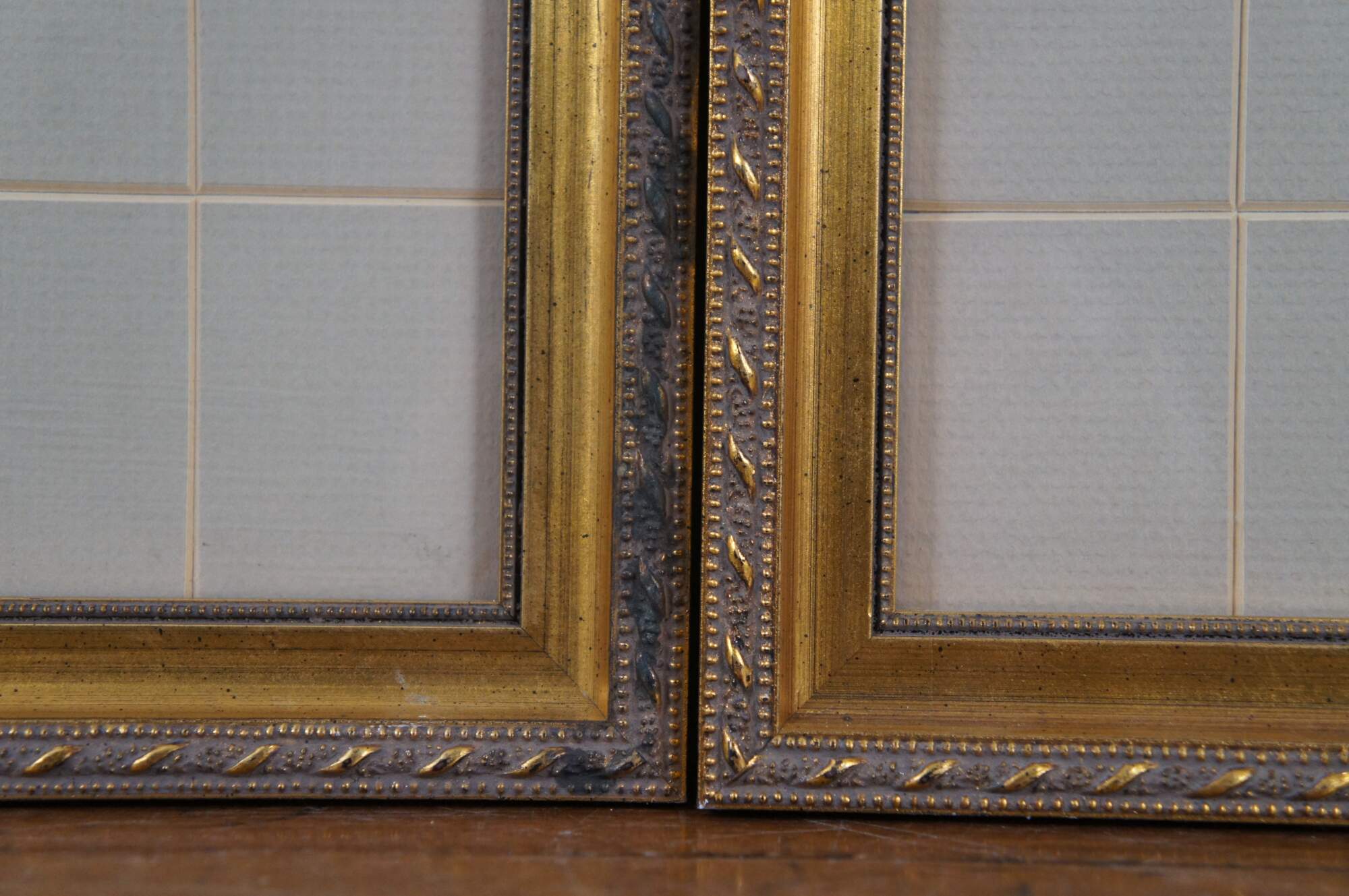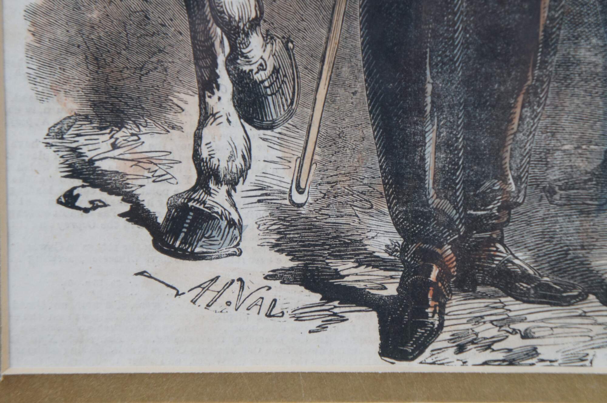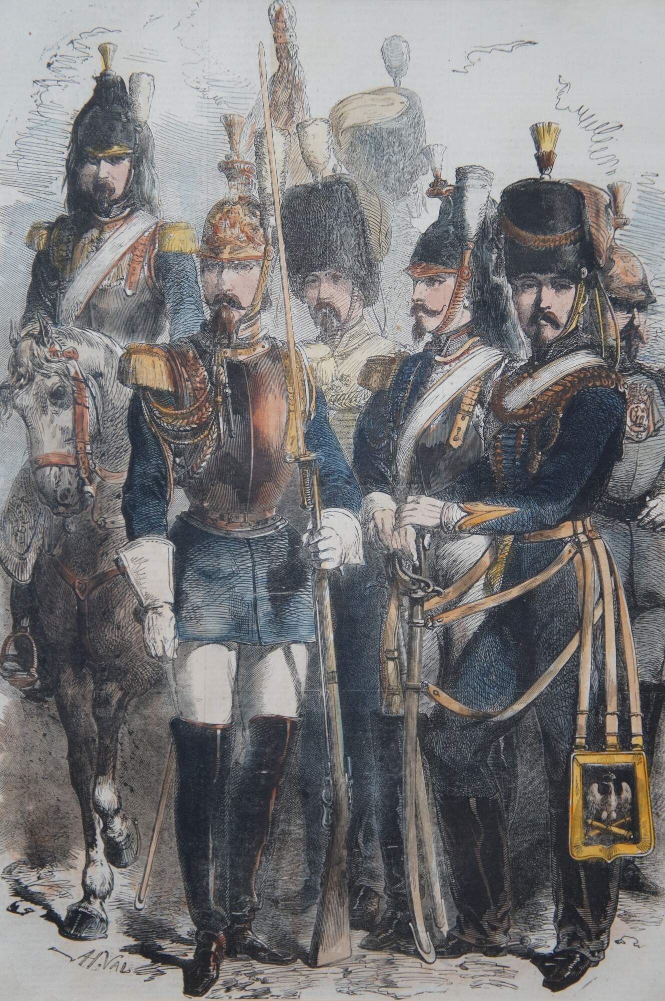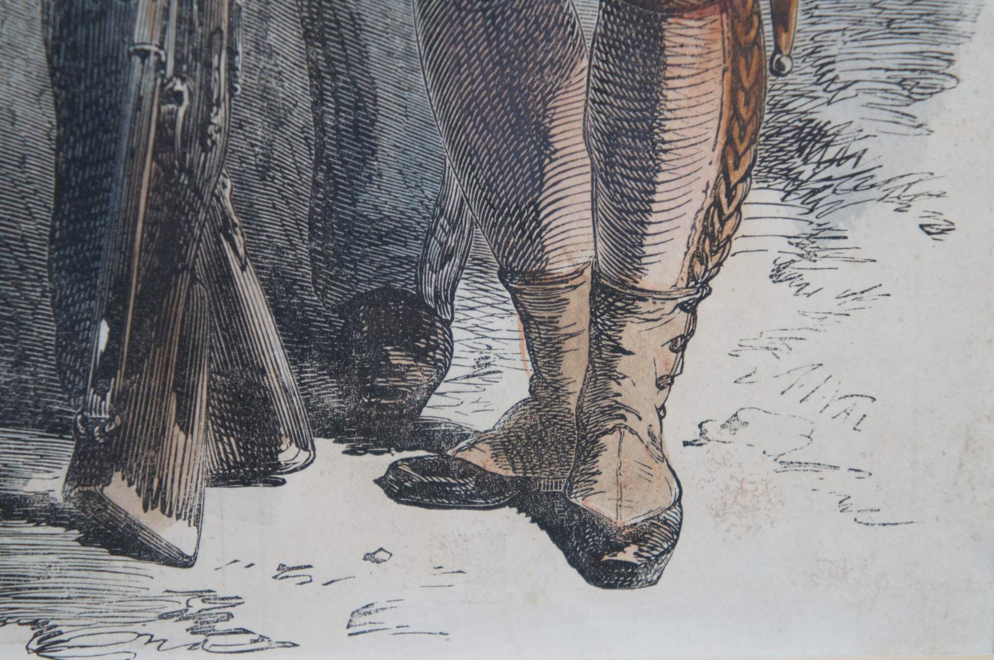 Pair of 19th century hand colored engravings depicting "Infantry & Calvary of the French Imperial Guard", for the Illustrated London News 1854. Signed in plate in lower left corner A.H. Val. Features hand cut mats, framed in gilded, beveled frames with beaded and ribbon twist details.