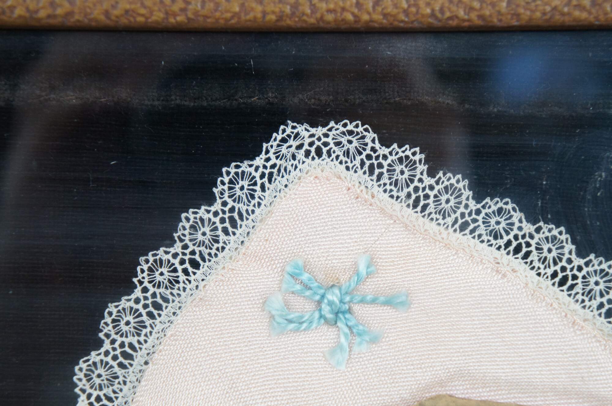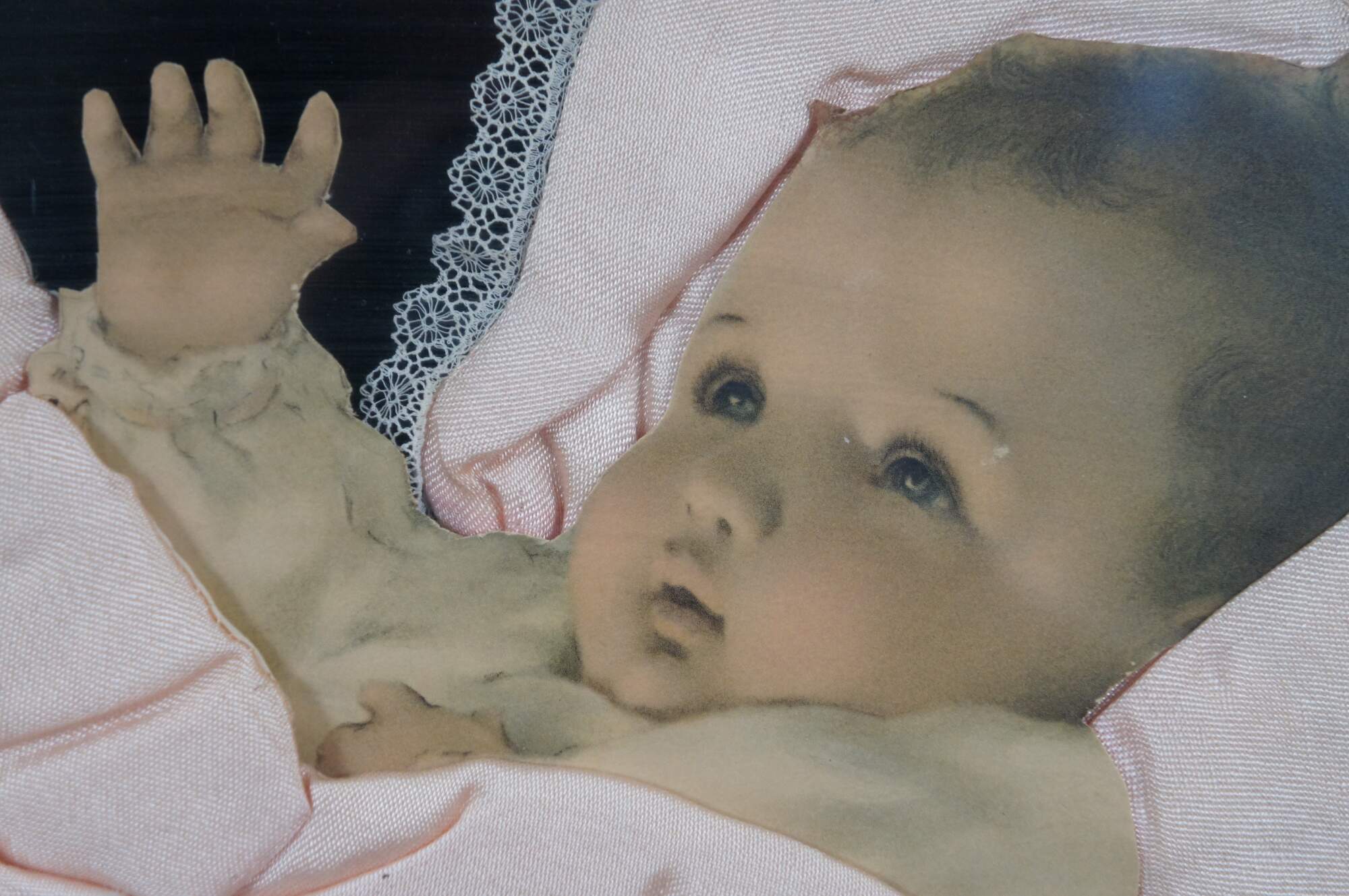 Early 20th century framed pink baby blanket with stitched blue tufting and lace trim, nestled around a die cut photograph of a baby, mounted on a backdrop of black velvet. Possibly a piece of memorial / mourning art, purportedly popular from the Victorian era through the 1930's. Framed in a brown wood frame with semi abstract carved details.