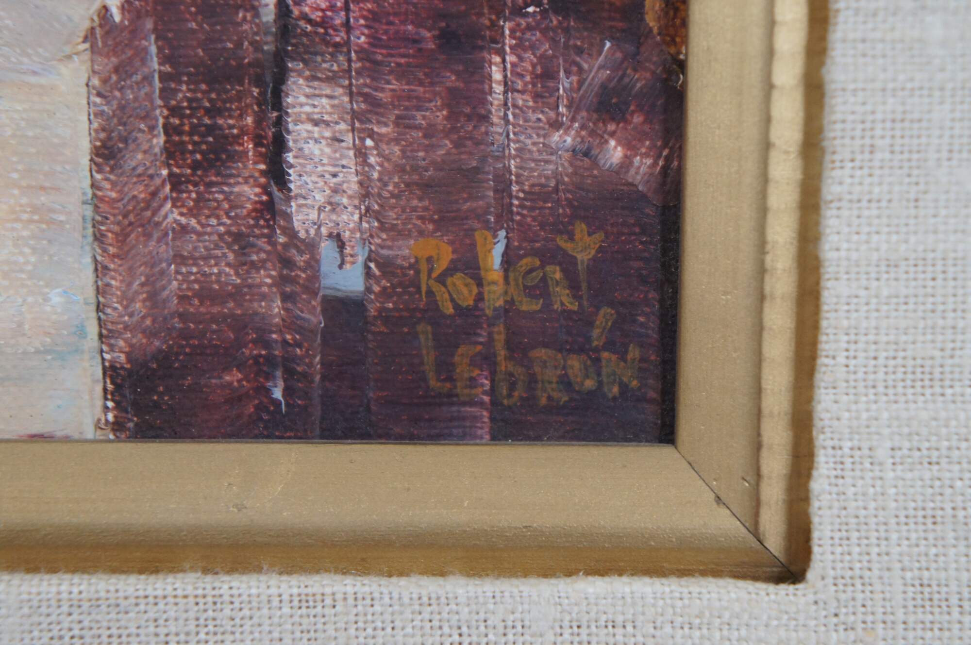 Vintage oil on canvas expressionist / semi-abstract cityscape painting of New York City and the Brooklyn Bridge by Robert Lebron. Signed in lower right. Framed in a gilded double frame with an off-white linen mat.
