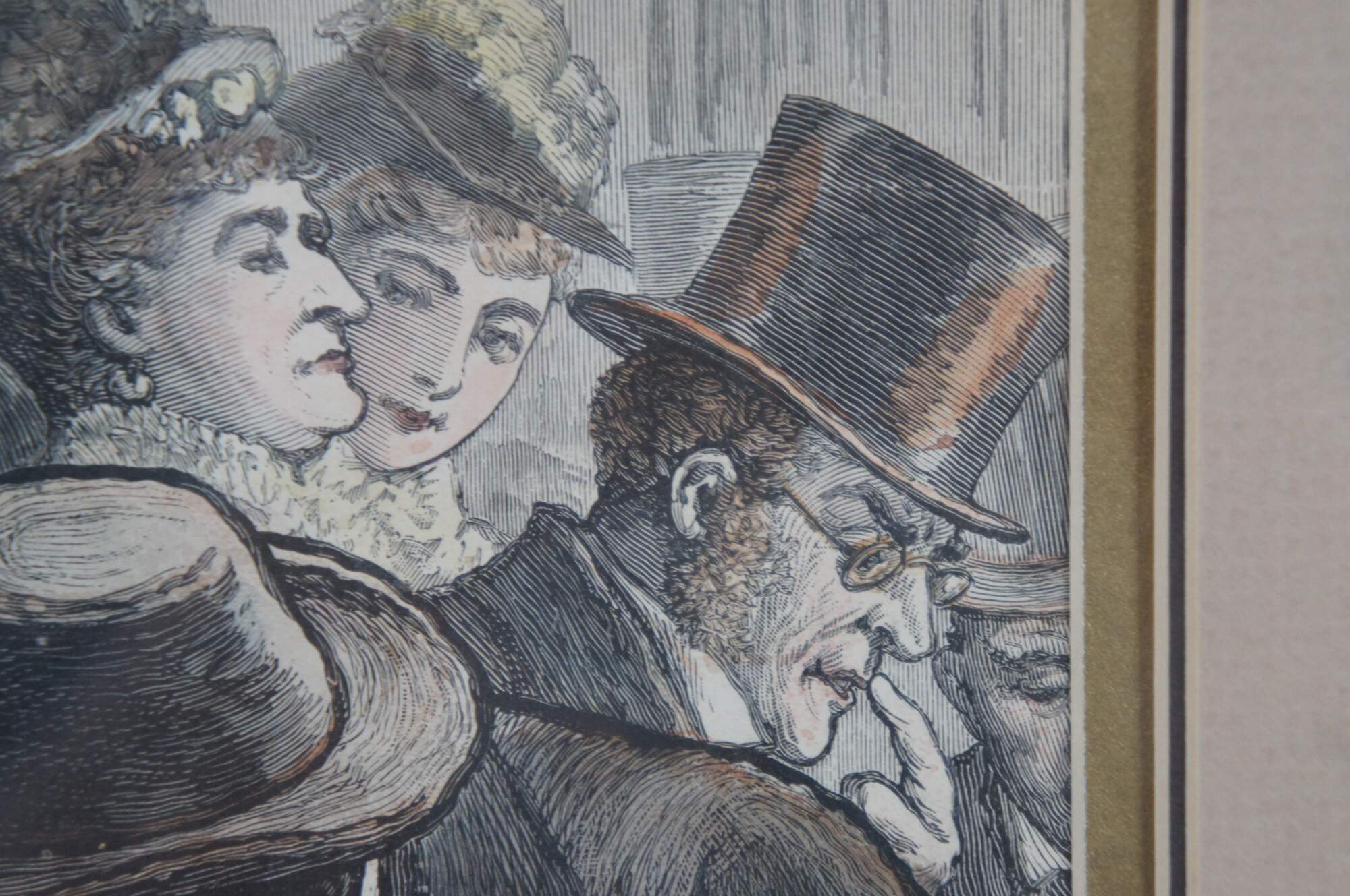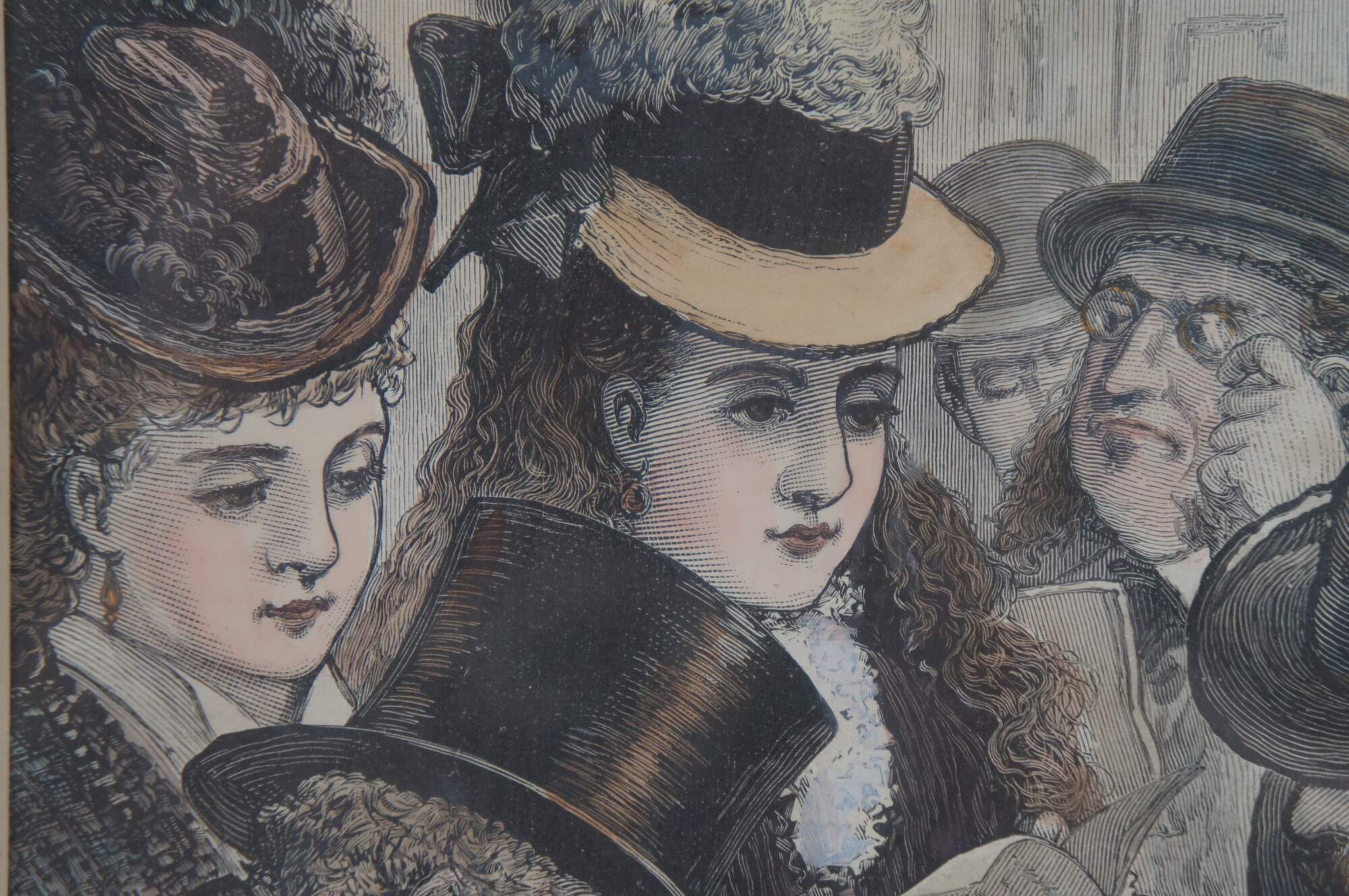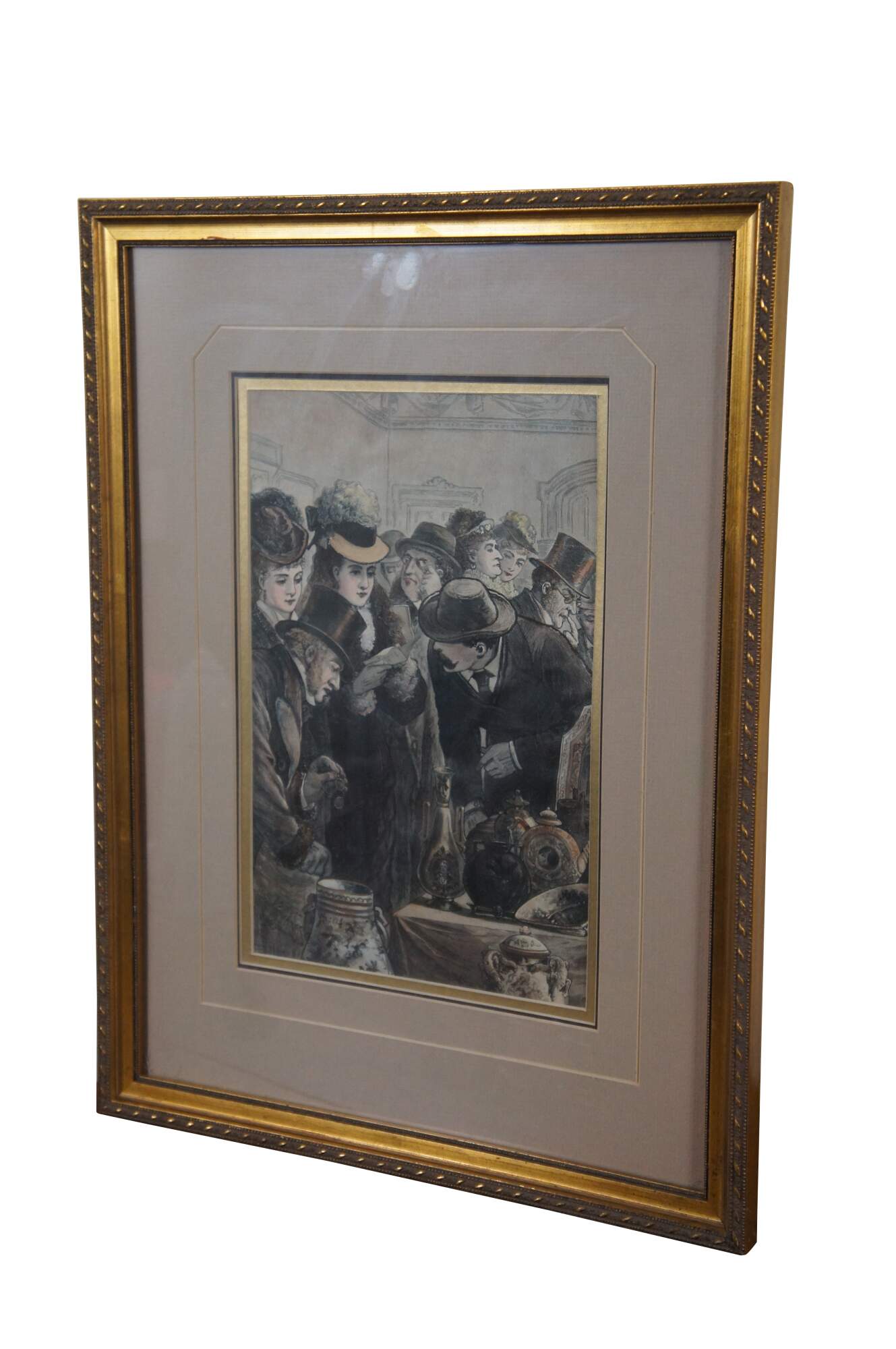 Mid to late 19th century hand colored engraving depicting men and women viewing objects on a table at an auction. Titled New York City - An Auction Sale of Bric-A-Brac From Centennial Exhibition. Published in "Frank Leslie's Illustrated" January 1877. Framed with a unique mat in a gilded frame with beaded and ribbon twist details.