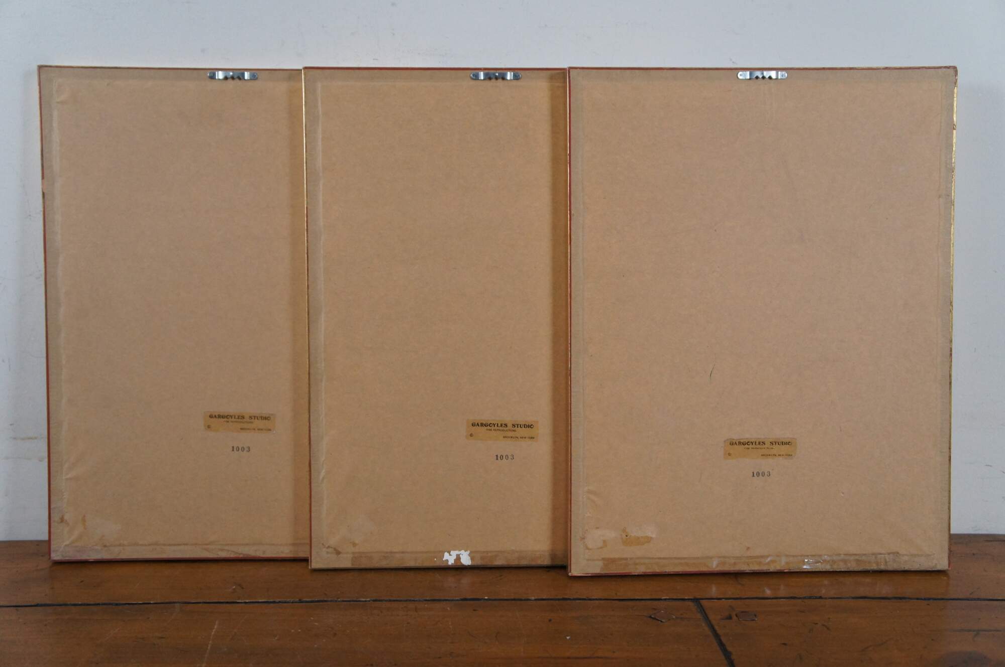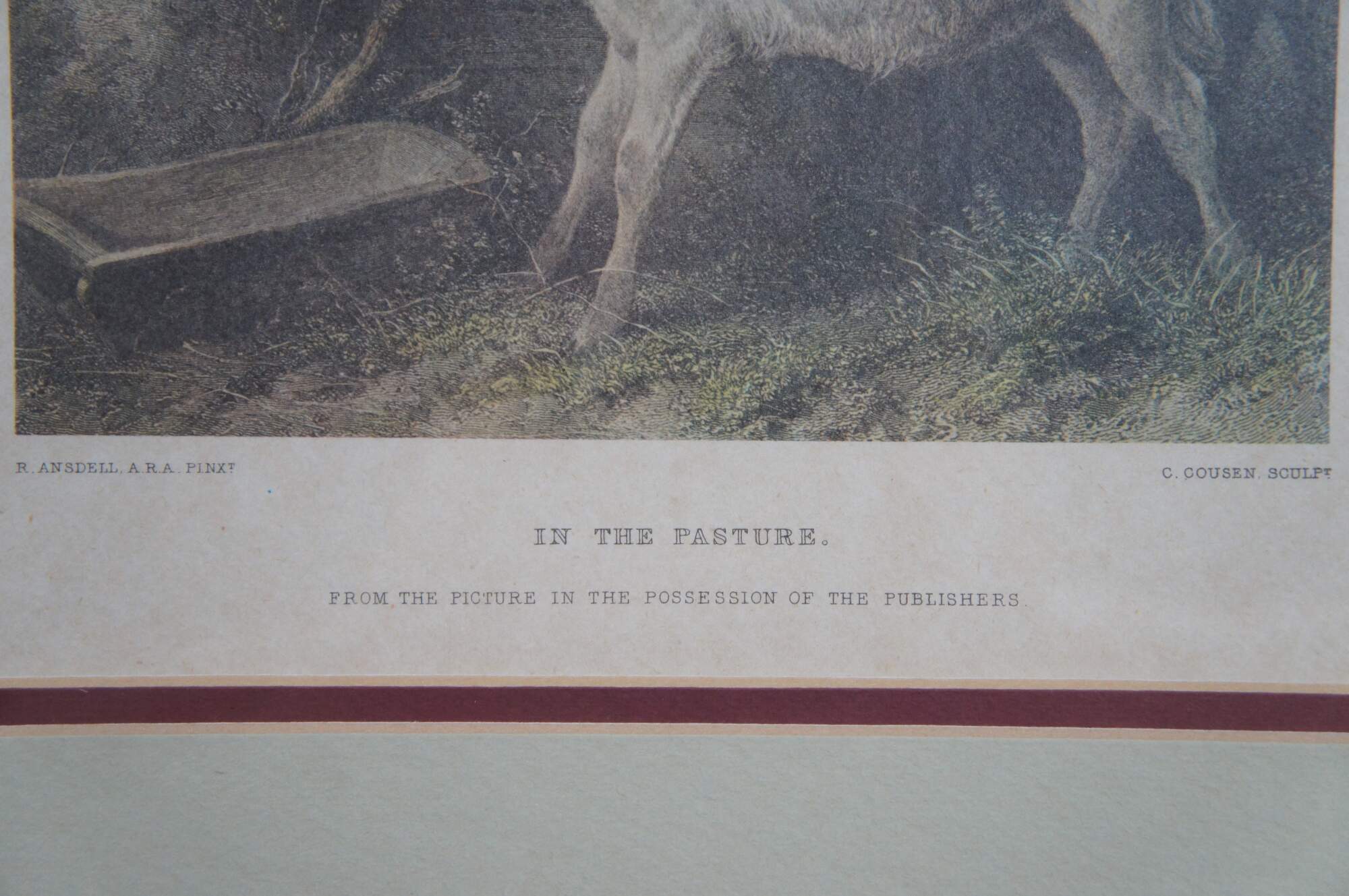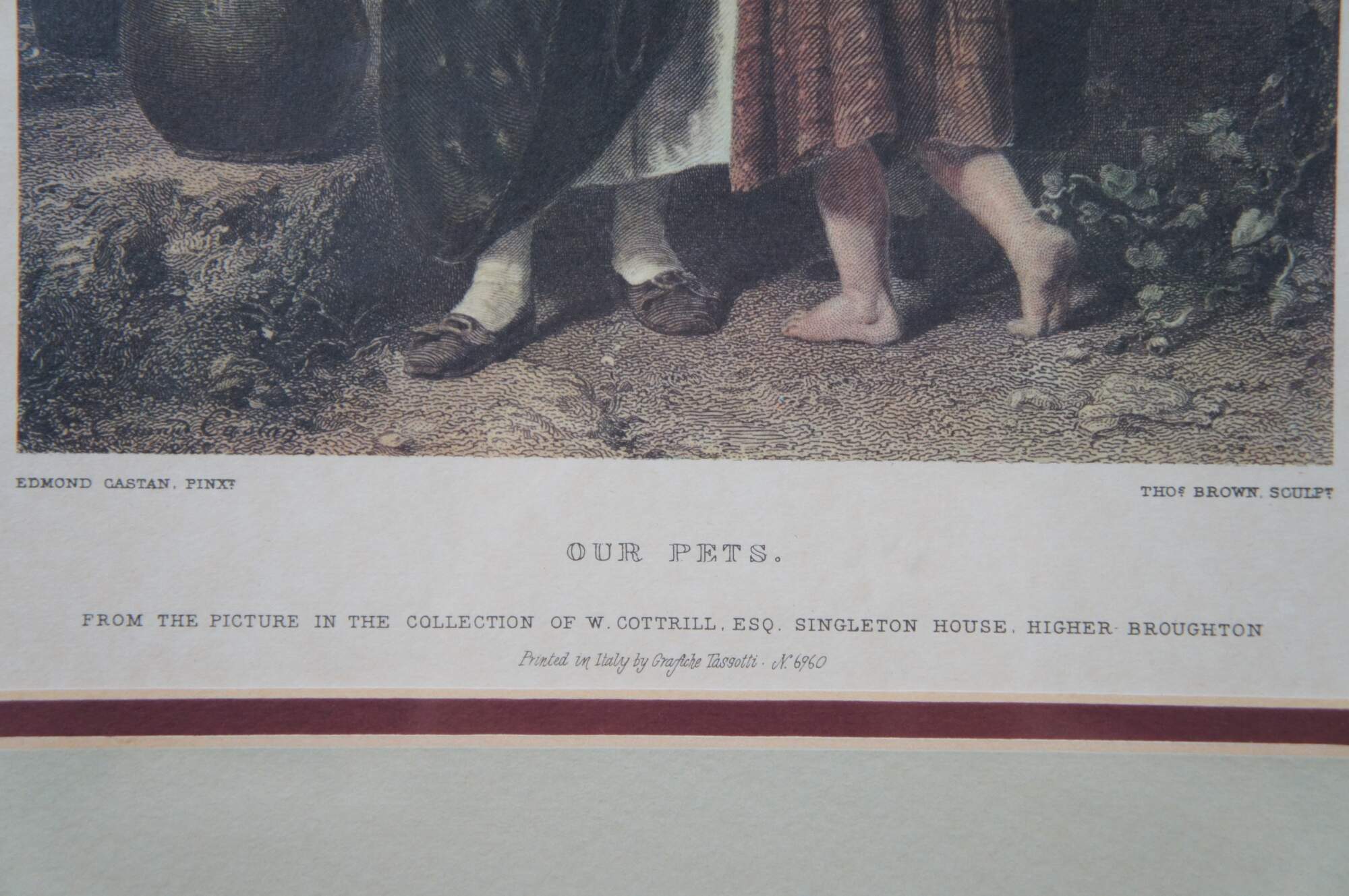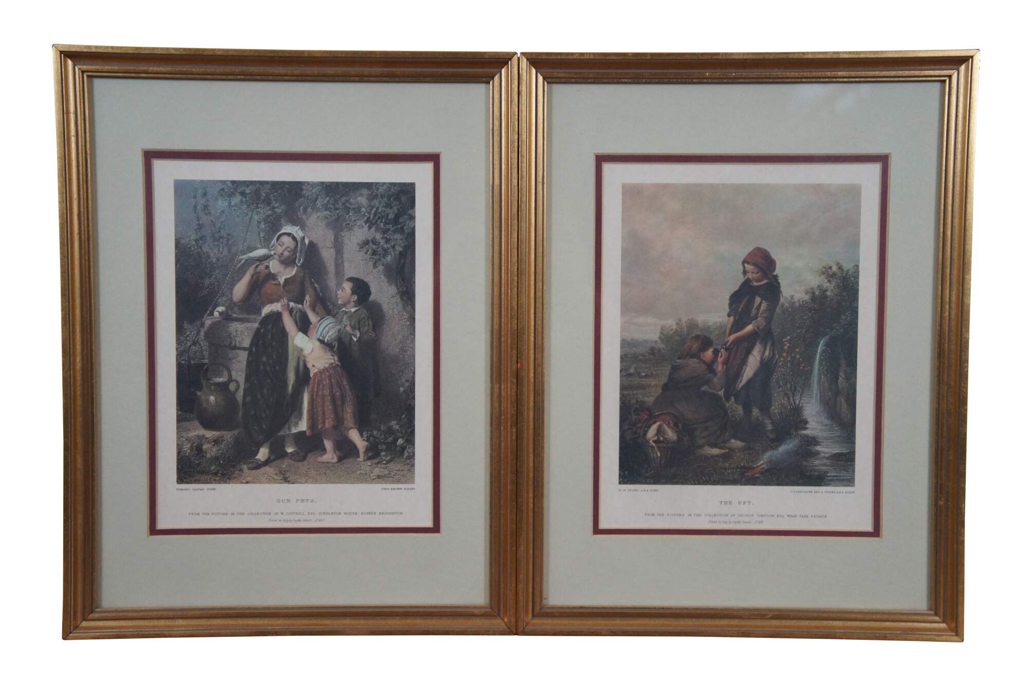 Set of three vintage lithograph prints: "Our Pets" by Edmond Castan, engraved by Thomas Brown for The Art Journal, 1871 / "The Spring" by H. Campotosto (print is incorrectly labeled by the publisher as "The Eft" by H. Le Jeune, engraved by J. Stancliffe and L. Stocks, 1869) / and "In the Pasture" by Richard Ansdell, engraved by C. Cousen for The Art Journal 1869. Printed in Italy by Grafiche Tassotti. Framed by Gargoyles Studio Fine Reproductions of Brooklyn, New York. Item number 1003.