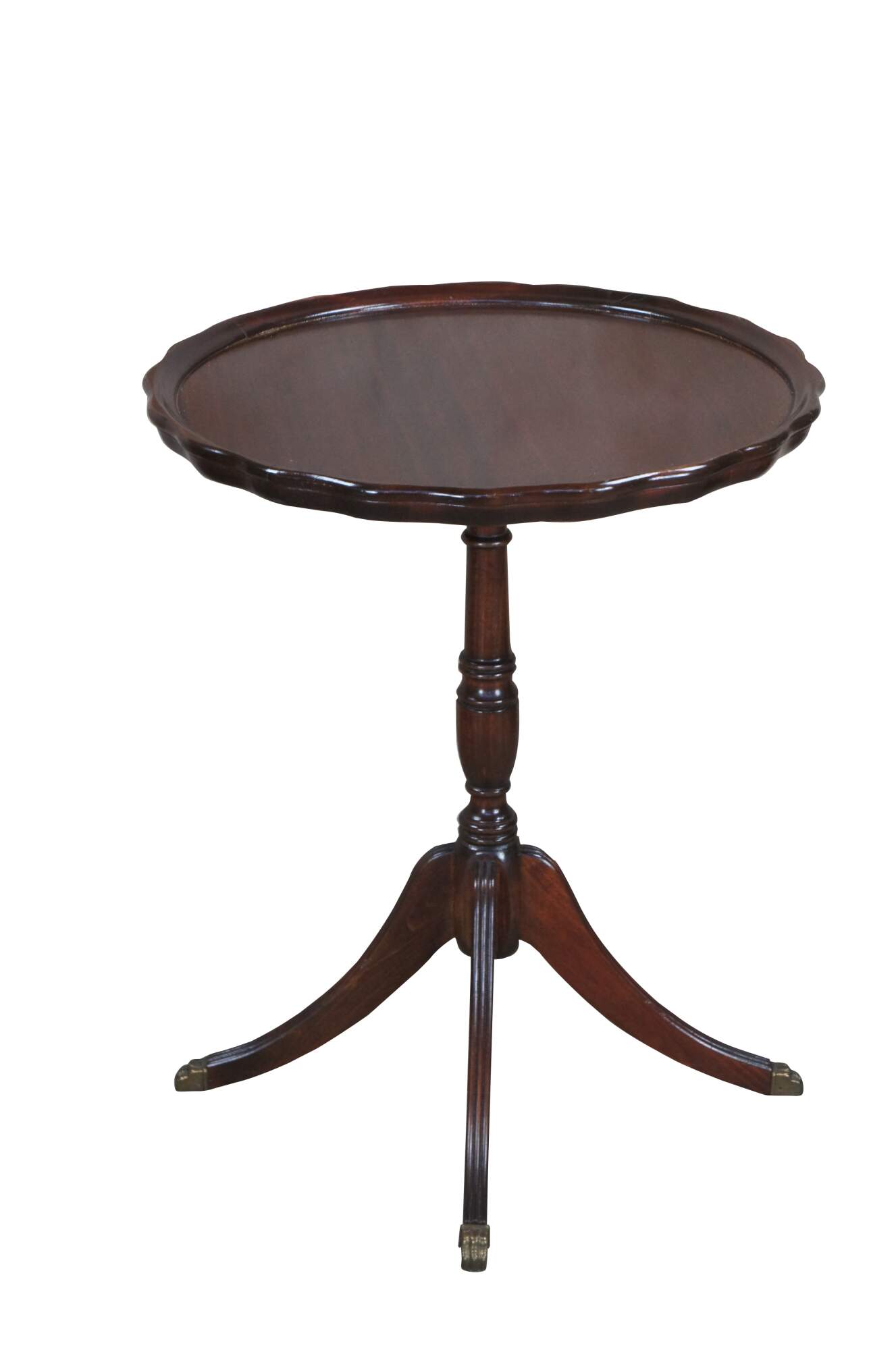 1940s Duncan Phyfe style pie crust tables. Made from mahogany with an inset scalloped top over a turned support with downswept fluted Duncan Phyfe legs and brass capped paw feet.