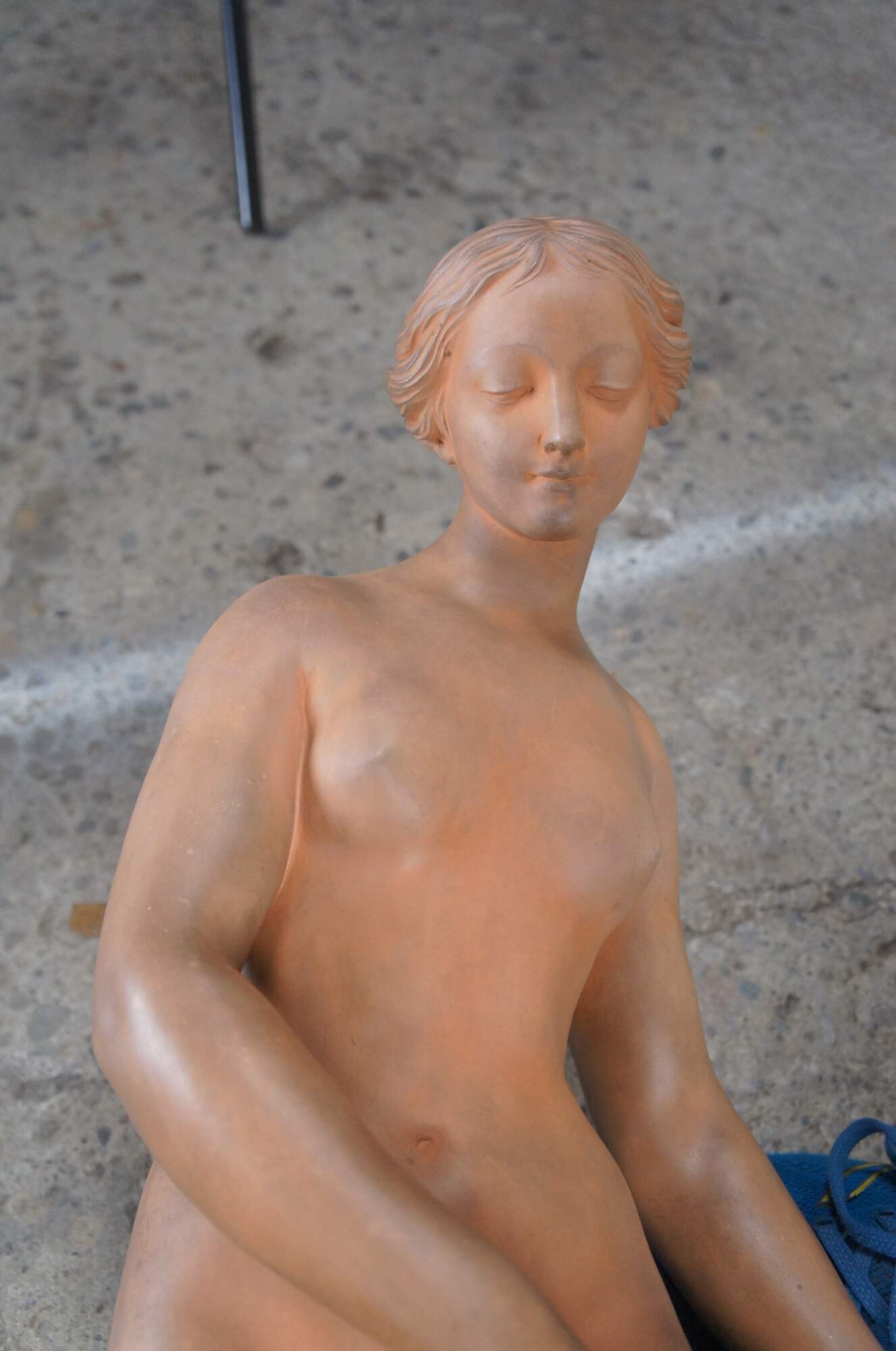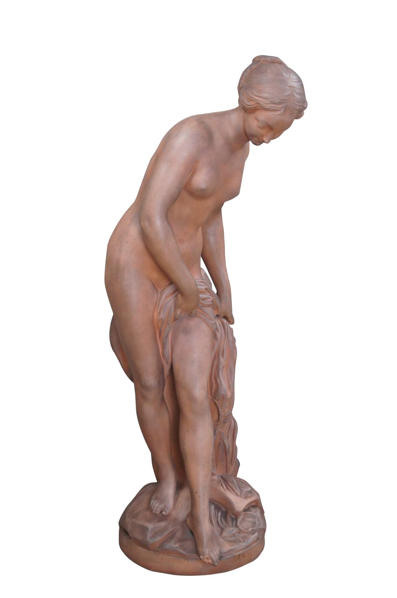 Vintage terracotta bathing woman sculpture, titled La Baigneuse, after the work of French artist Etienne Maurice Falconet.