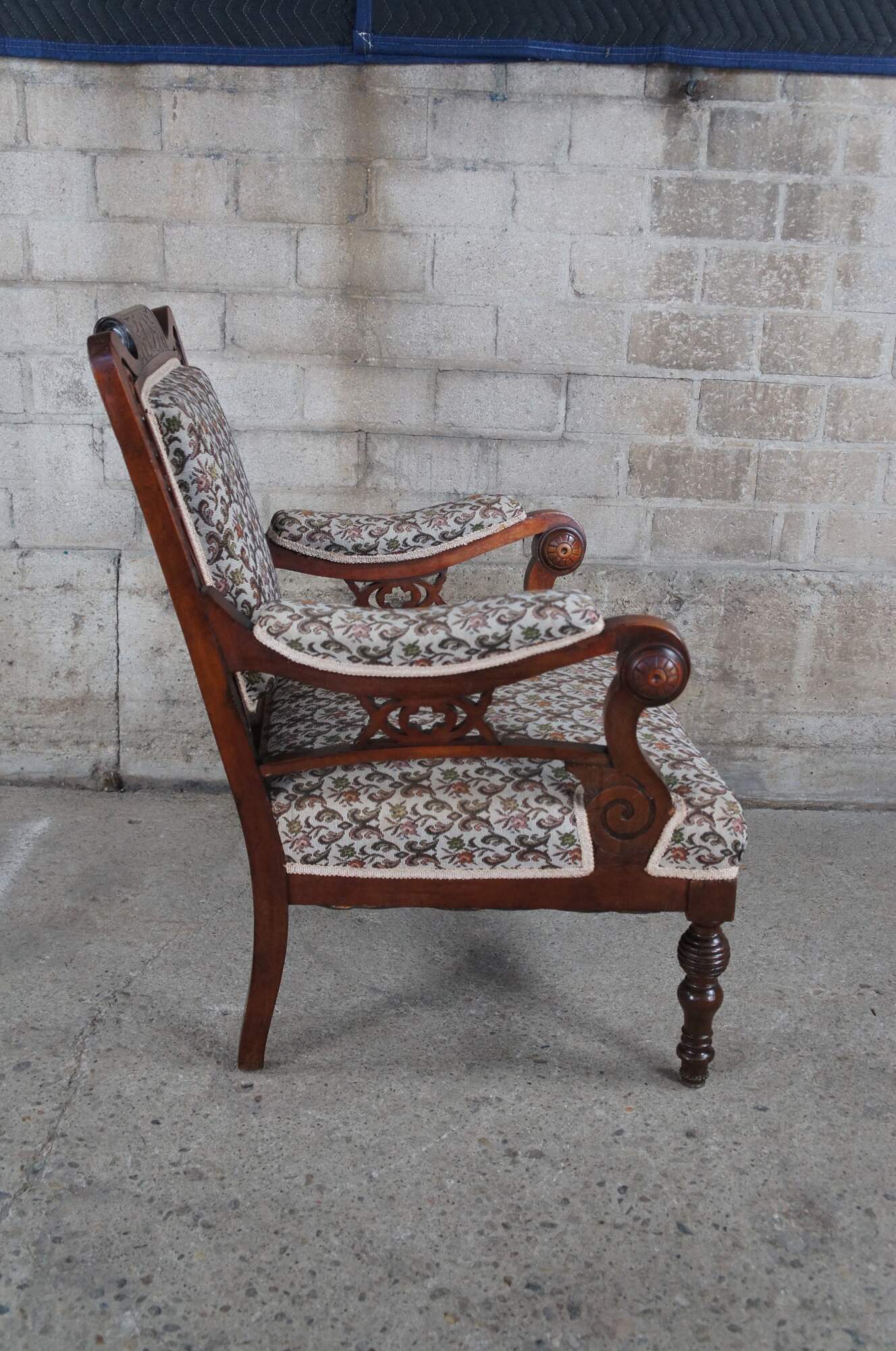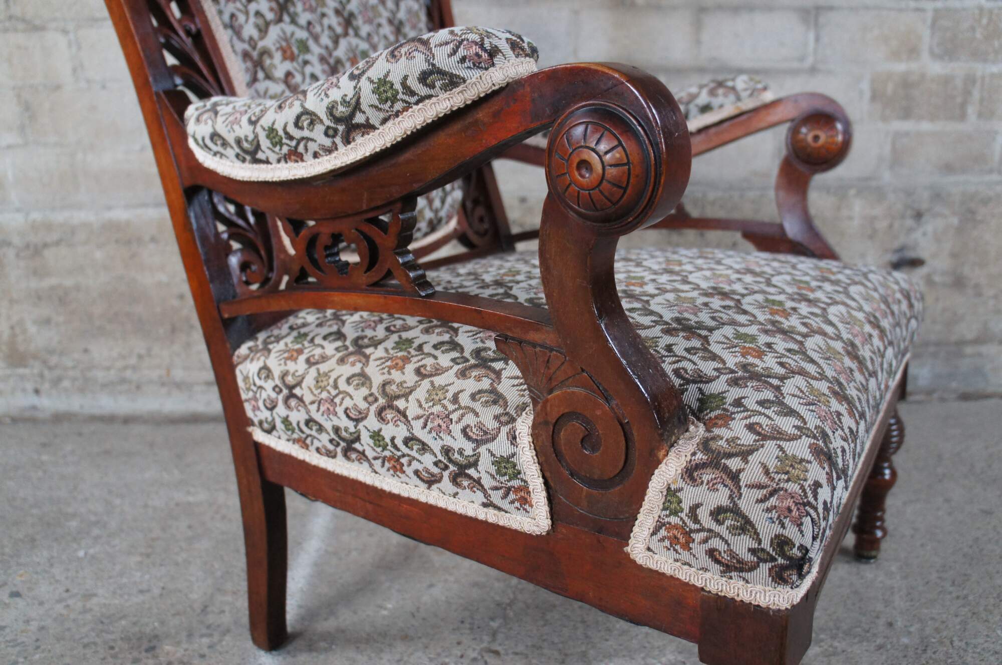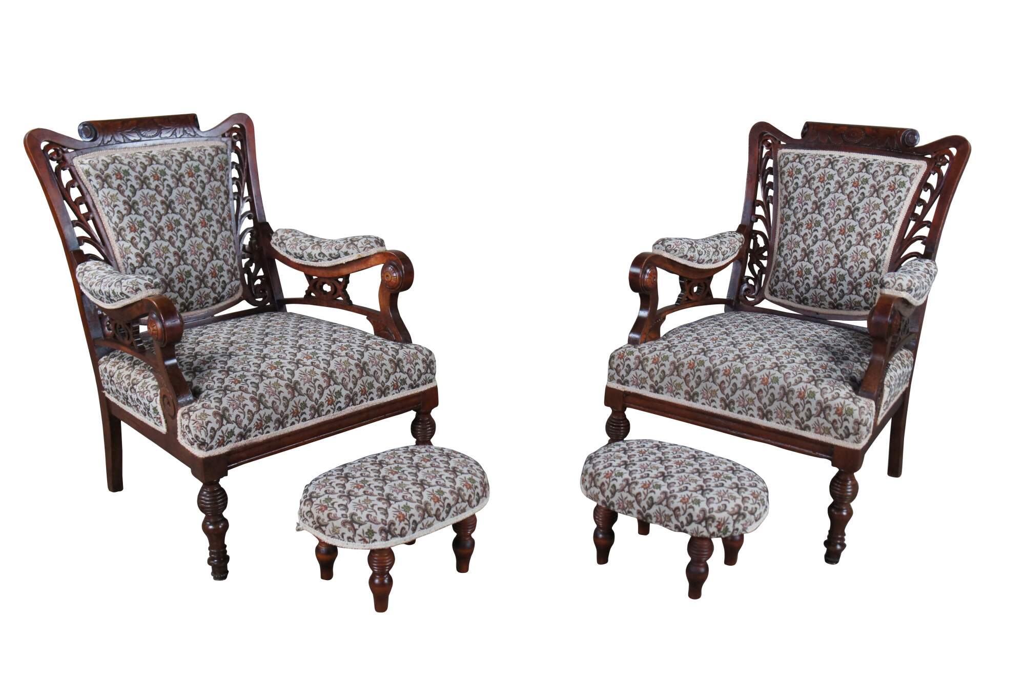 2 impressive Victorian era library, club or parlor arm chairs and ottomans. Made from mahogany with a pierced foliate back, downswept padded arms with accompanied S scroll supports, turned wheel medallions and geometric floral upholstery. Crest rail is scrolled and centered by a 20 petal chrysanthemum flanked by leaves on each side. The chair is supported by turned beehive legs along the front over a baluster turned arrow foot and square legs at the rear.
