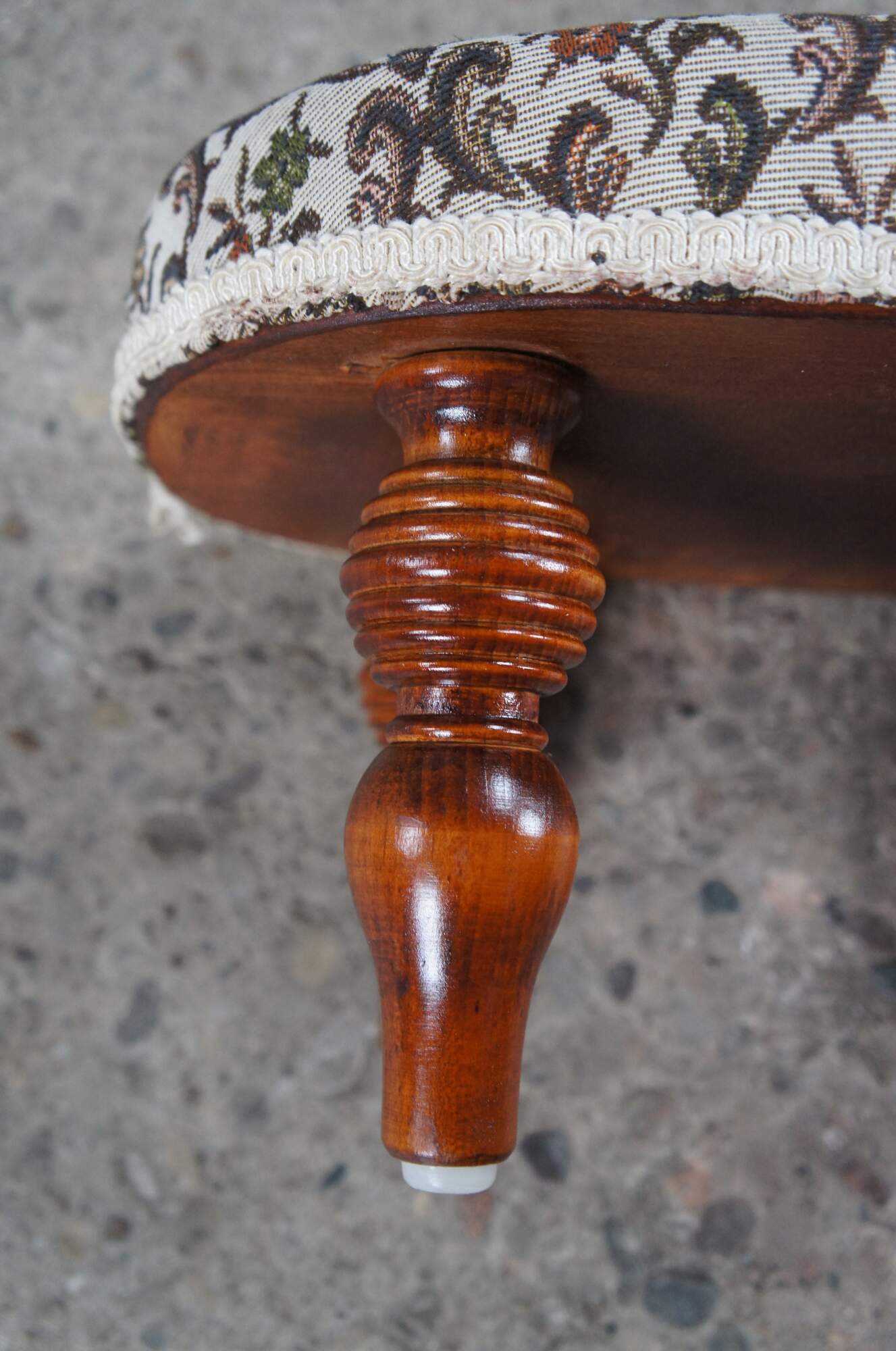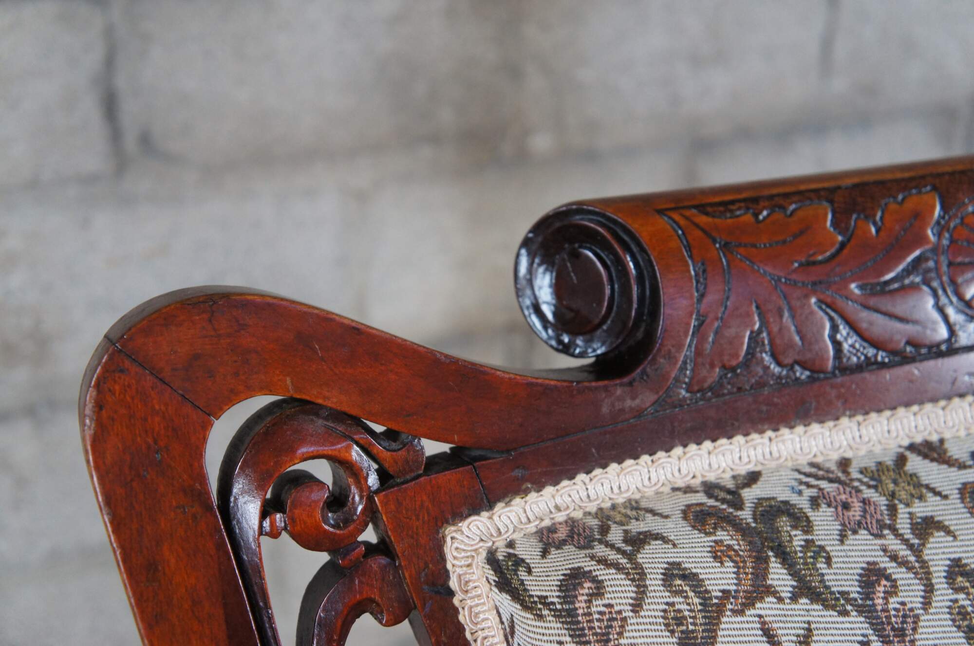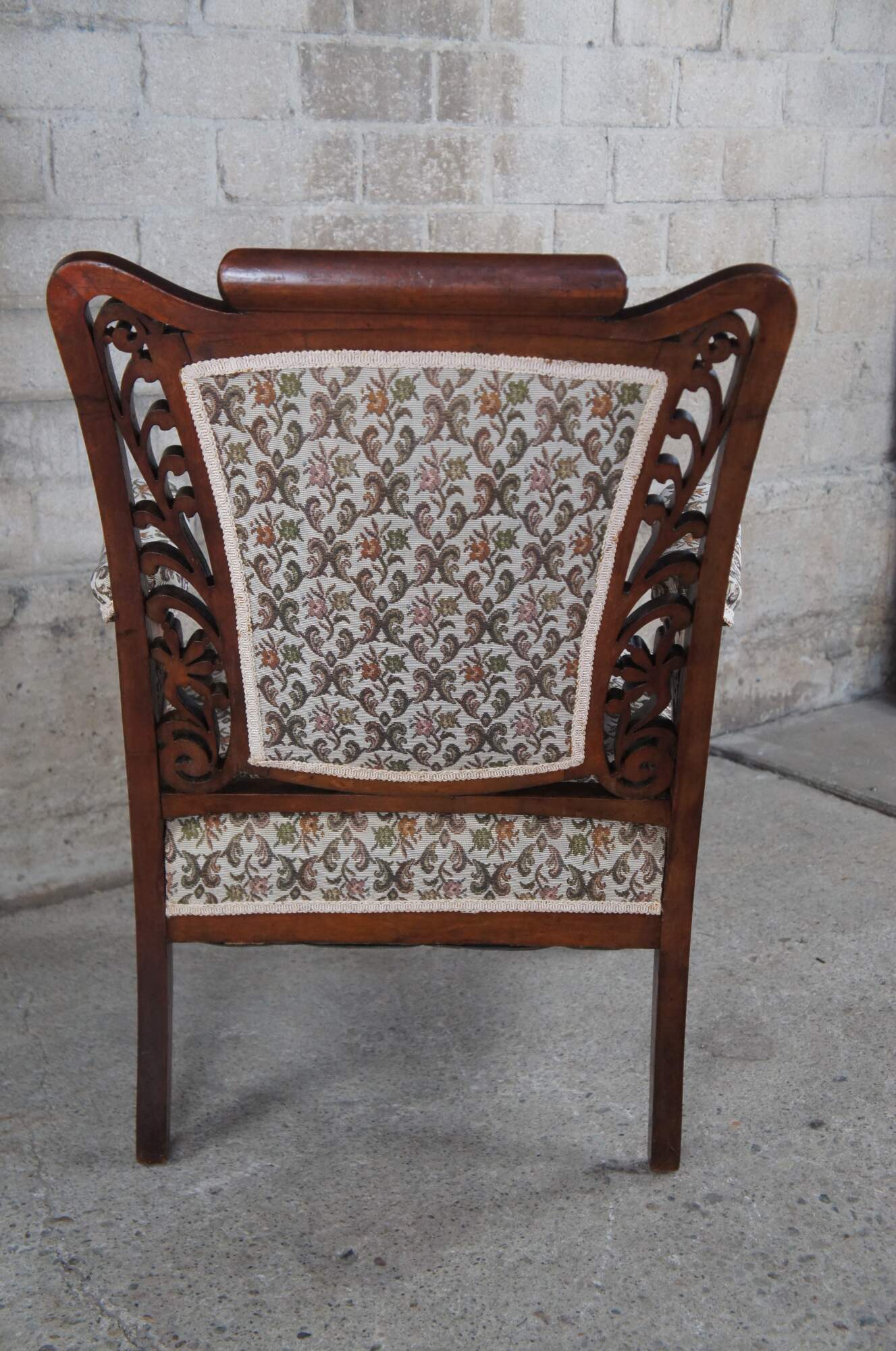 2 impressive Victorian era library, club or parlor arm chairs and ottomans. Made from mahogany with a pierced foliate back, downswept padded arms with accompanied S scroll supports, turned wheel medallions and geometric floral upholstery. Crest rail is scrolled and centered by a 20 petal chrysanthemum flanked by leaves on each side. The chair is supported by turned beehive legs along the front over a baluster turned arrow foot and square legs at the rear.
