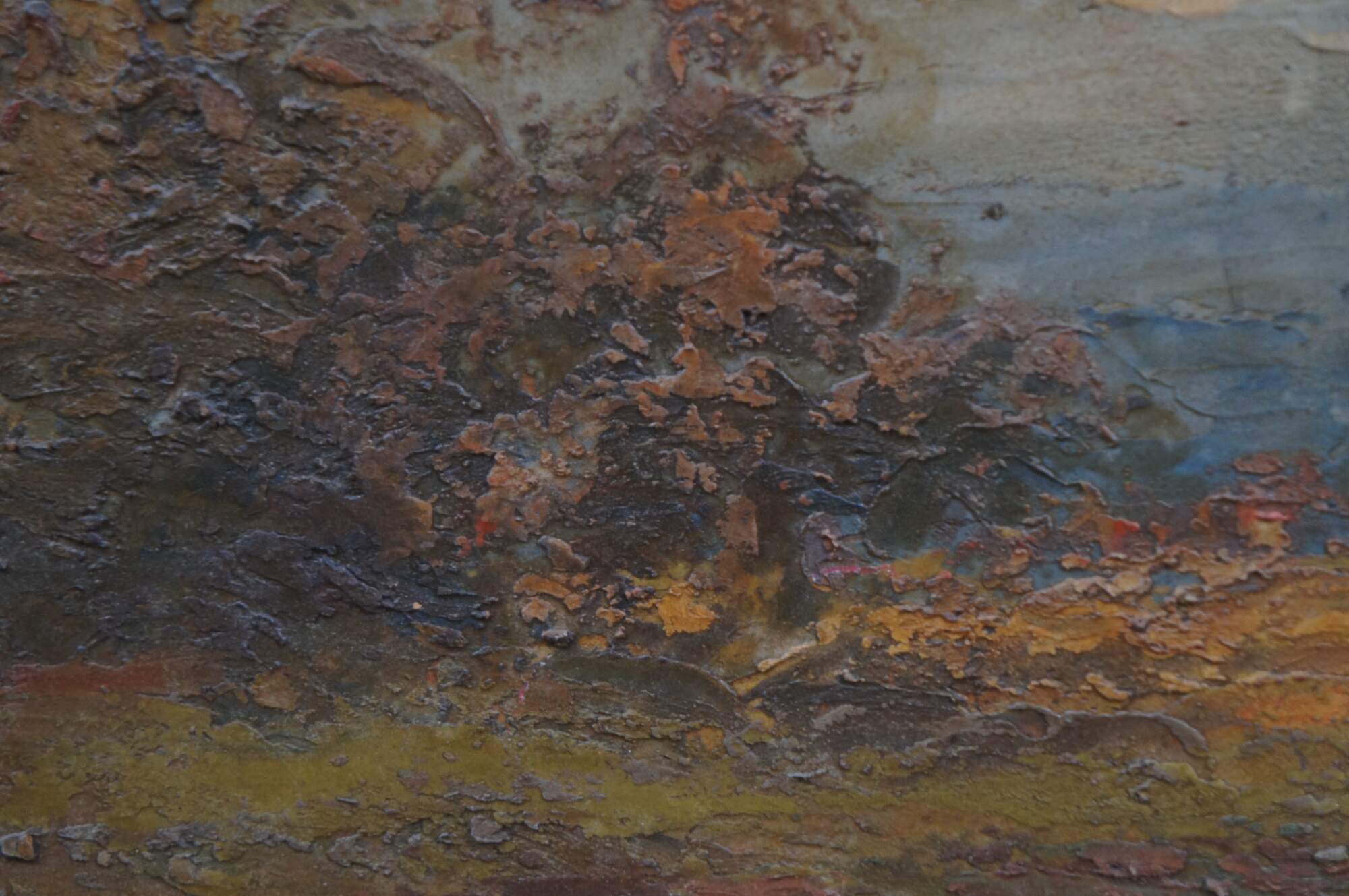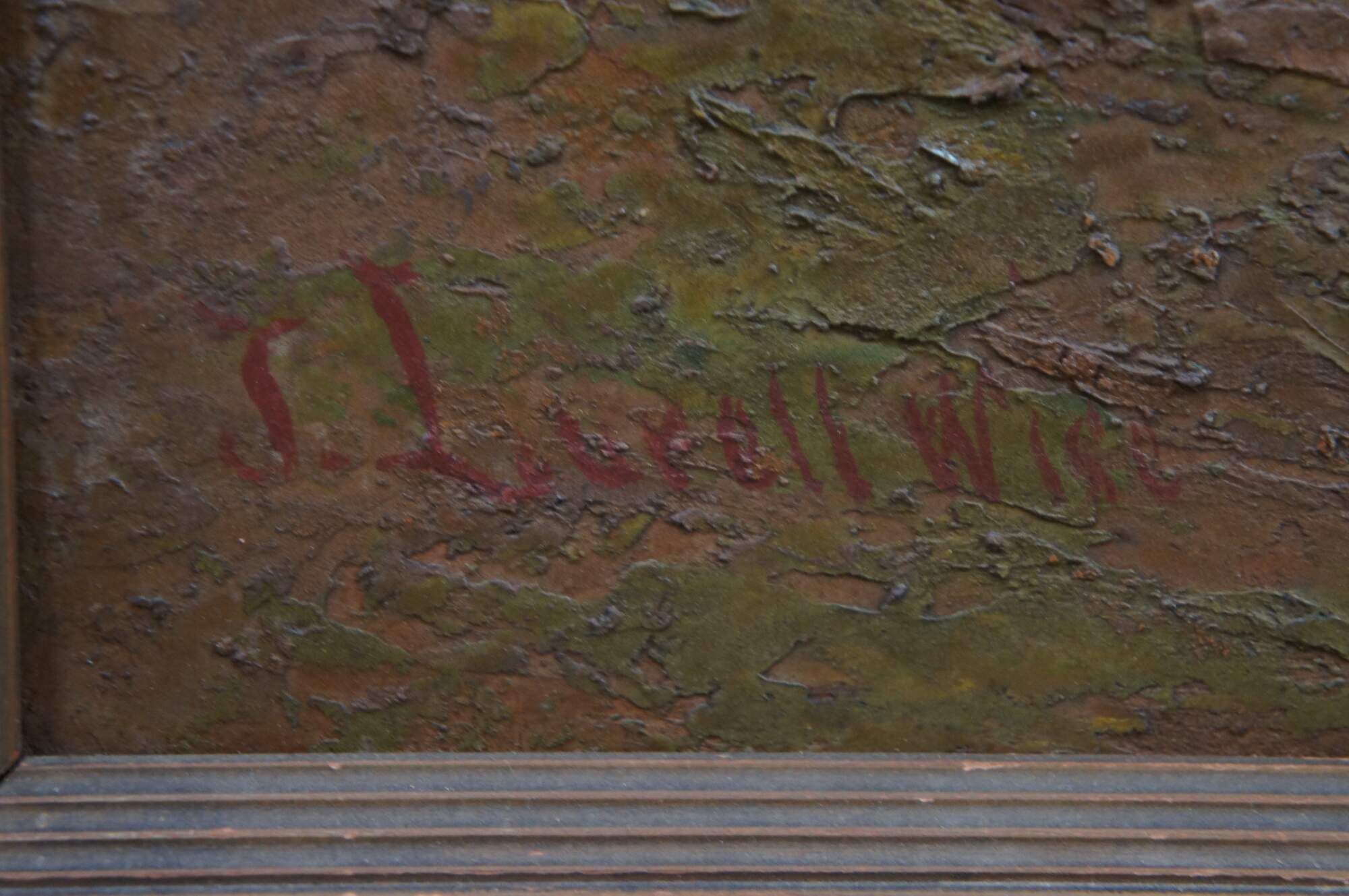 Early 20th century oil on canvas impressionist landscape painting of autumn trees along a river, titled "Indian Summer" by J. Lurell Wise. Signed in lower left corner. Framed in beveled frame with carved detail edge and brass plaque.