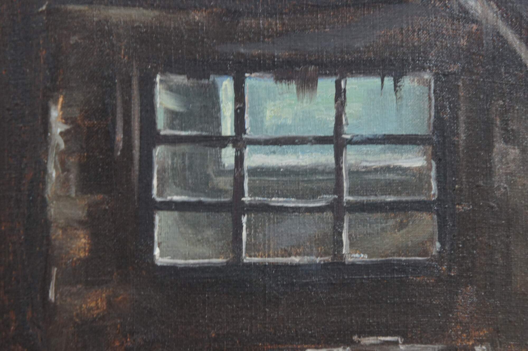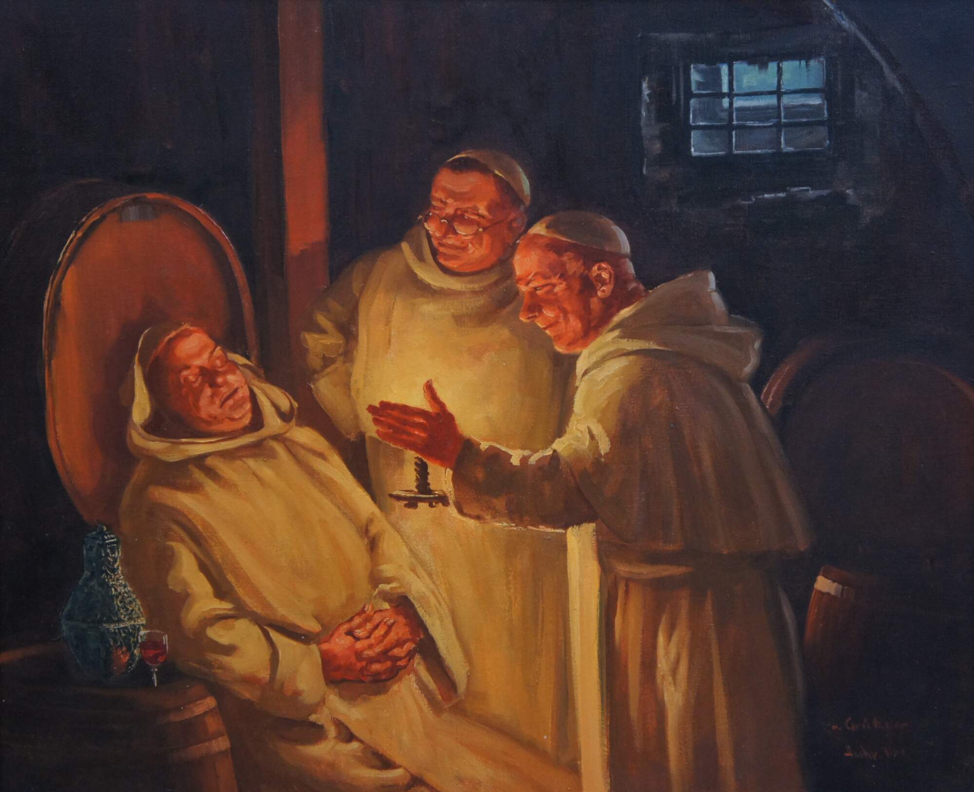 Late 19th century oil on canvas painting titled "Monks with Spirits," showing a pair of monks with a candle, peering at another monk, sleeping against a barrel, next to a drink pitcher and goblet of wine. Attributed to Adolf Metzner, after the work of Eduard von Grutzner.