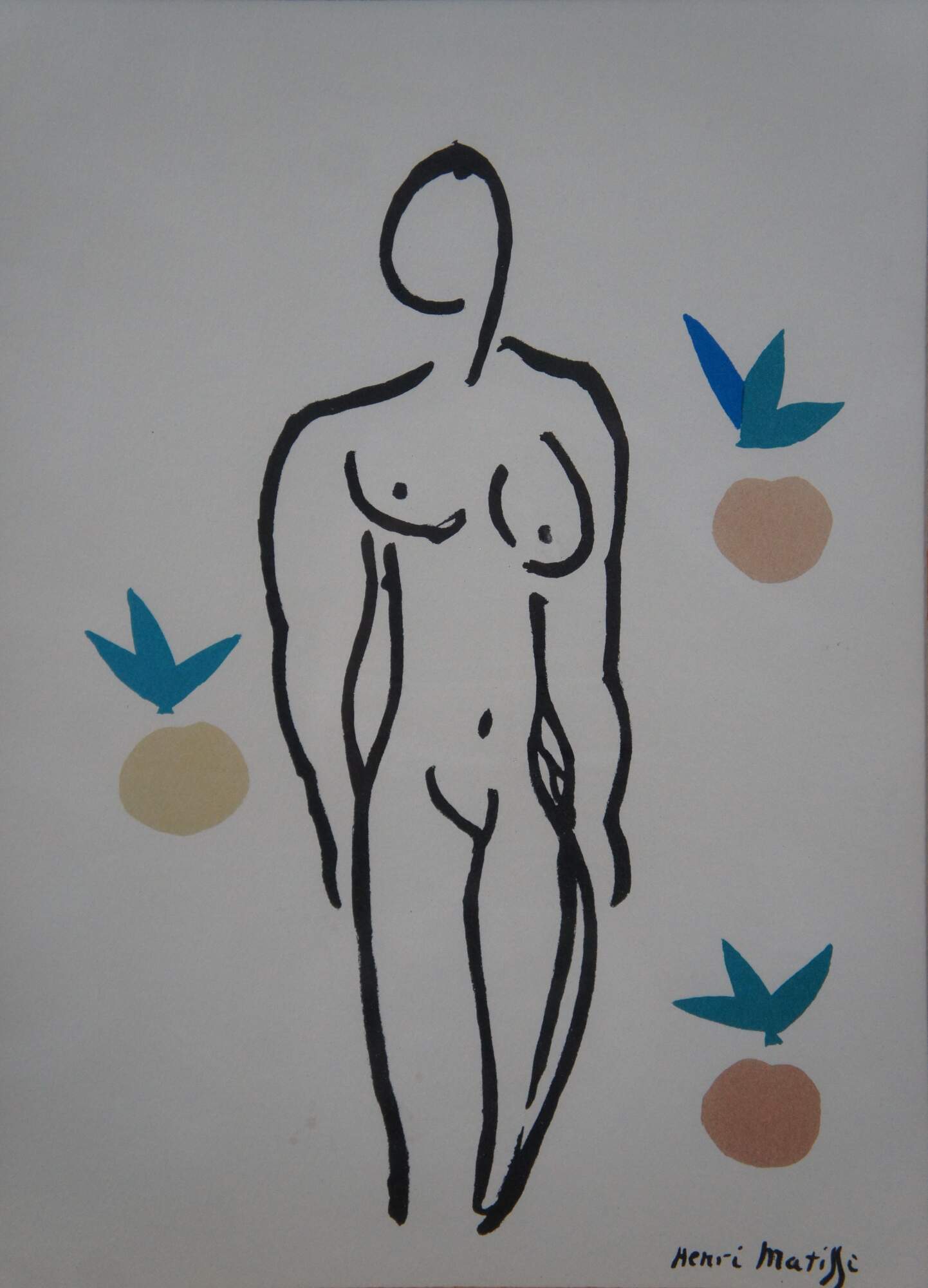 Vintage print of Nu Aux Oranges (Nude with Oranges) by Henri Matisse, showing a simple line drawing study of a nude figure surrounded by a handful of scattered oranges with leaves. Framed in simple silver metal frame.