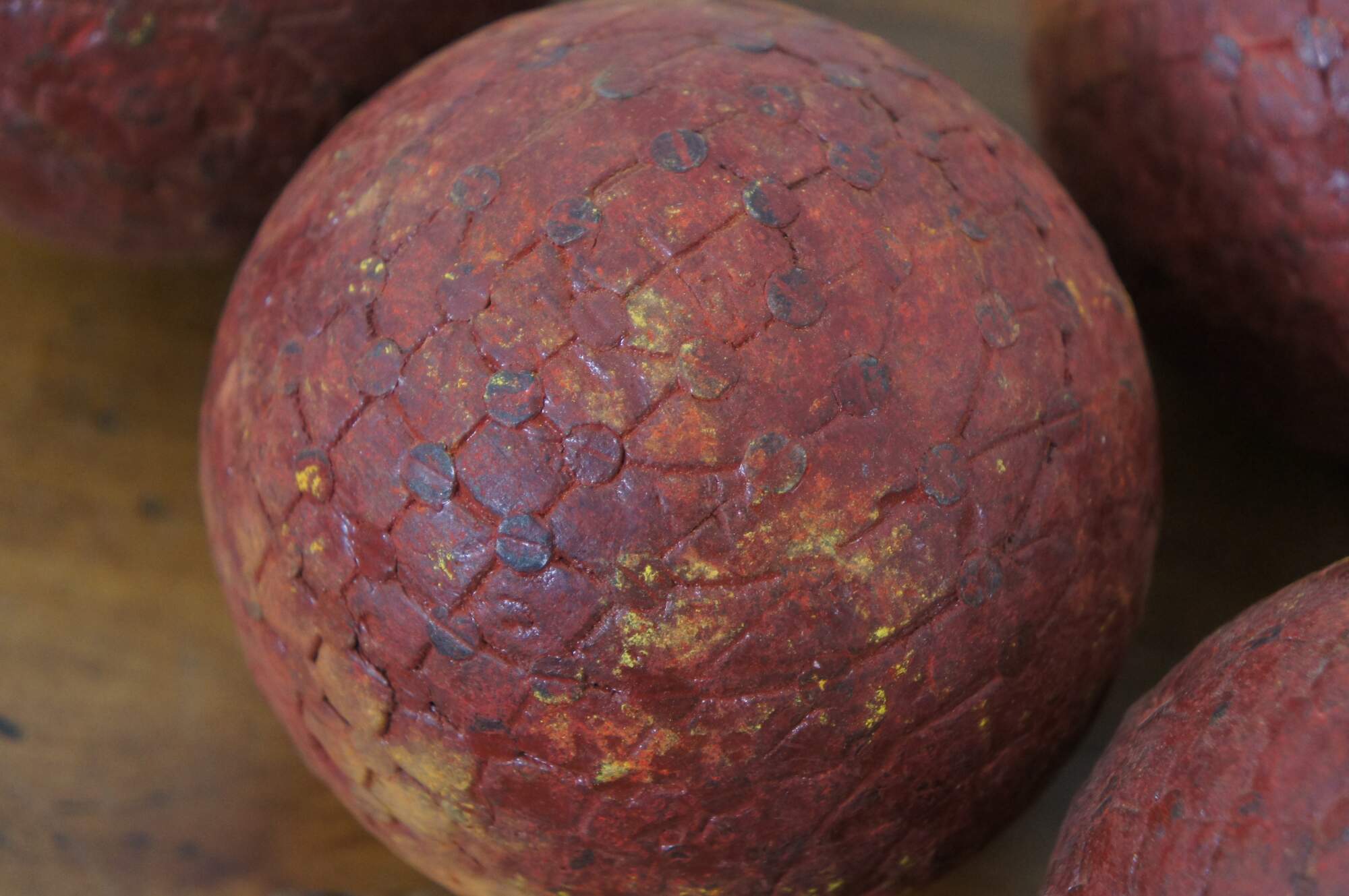 Antique 17 piece Jeu de Boules / lawn bowling / bocce set including original storage crate with instructions and point counter / abicus,12 nail studded playing balls (6 yellow and 6 red), one macrame net bag, and 3 assorted smaller balls for use as target. Crate is lined with a newspaper from 1949. Made in Paris France.