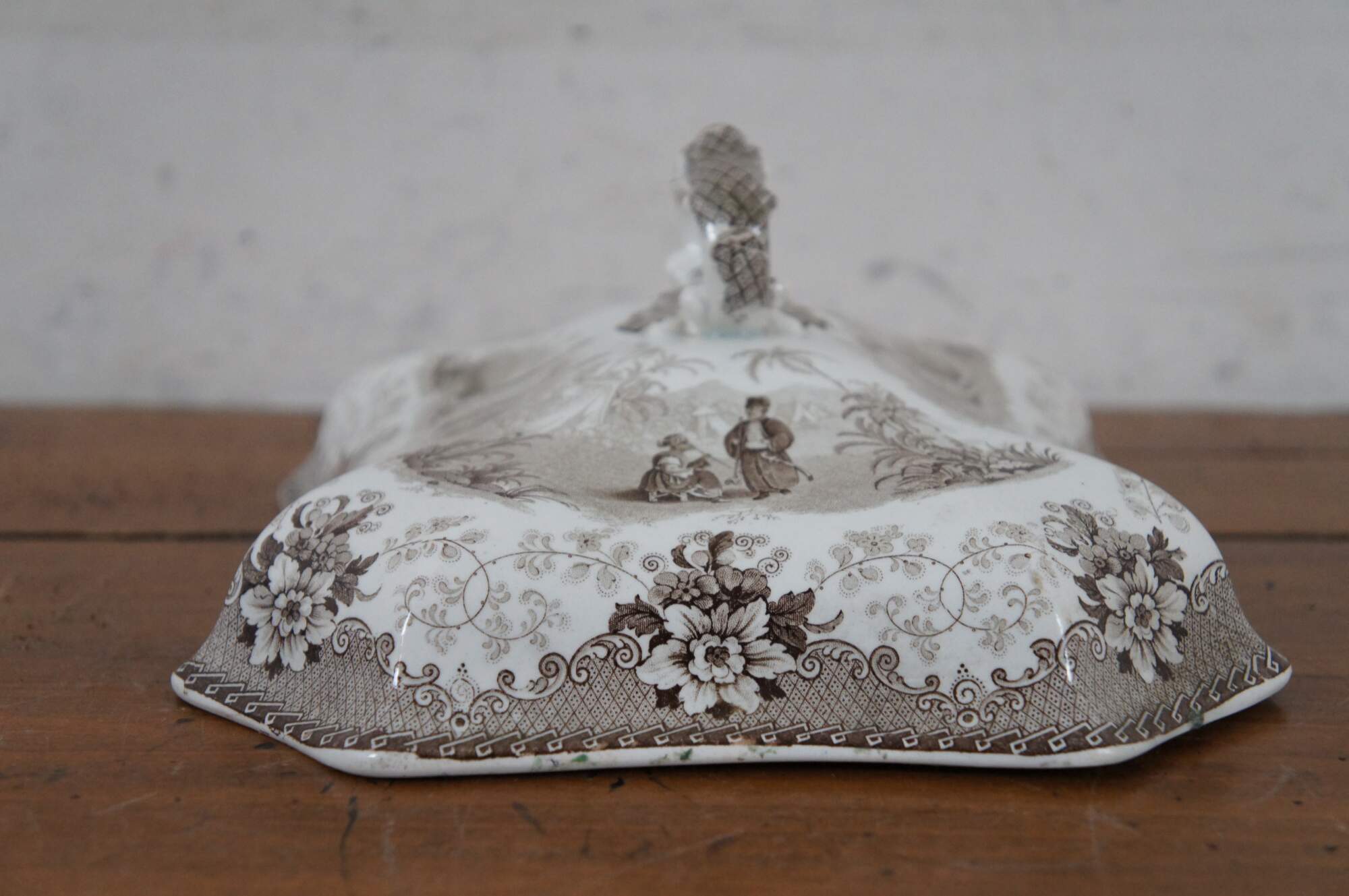 Late 19th century brown transferware lid for a rectangular casserole or vegetable dish, featuring a British colonial design of giraffes and Arab handlers, bordered by Chinoiserie inspired flowers and geometric patterns. Attributed to Ridgway. 24.