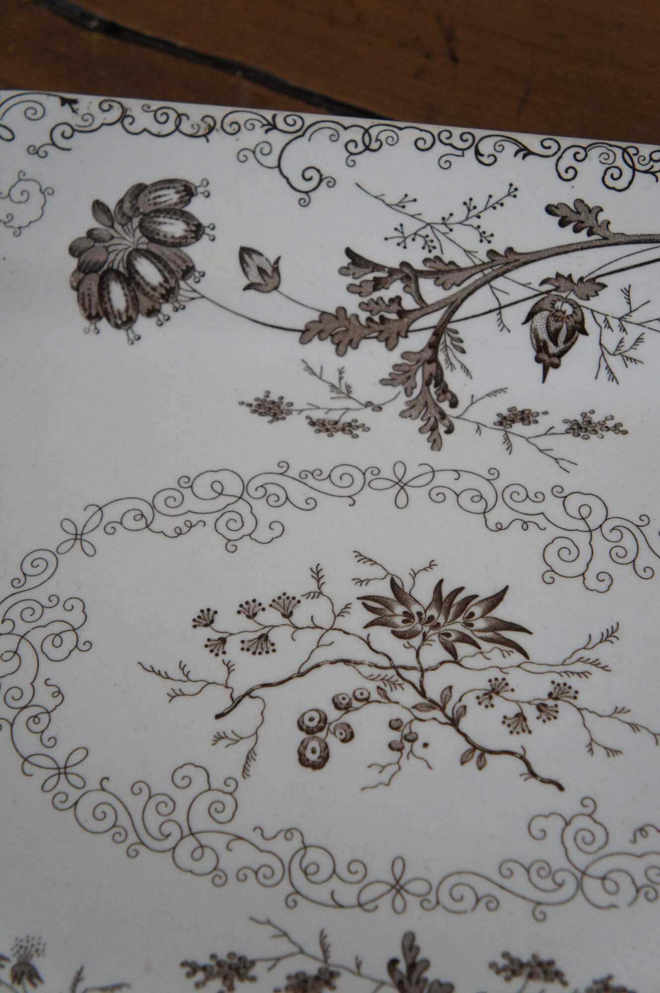Pair of late 19th century brown transferware serving platters. The oval platter by T&R Boote in the Lahore pattern, design registered 7 January 1880, showing a radial floral design and border. The rectangular platter is by Powell, Bishop and Stonier in the Chelsea pattern, registry number 2665, showing a delicate pattern of scattered flowering stems and vines.