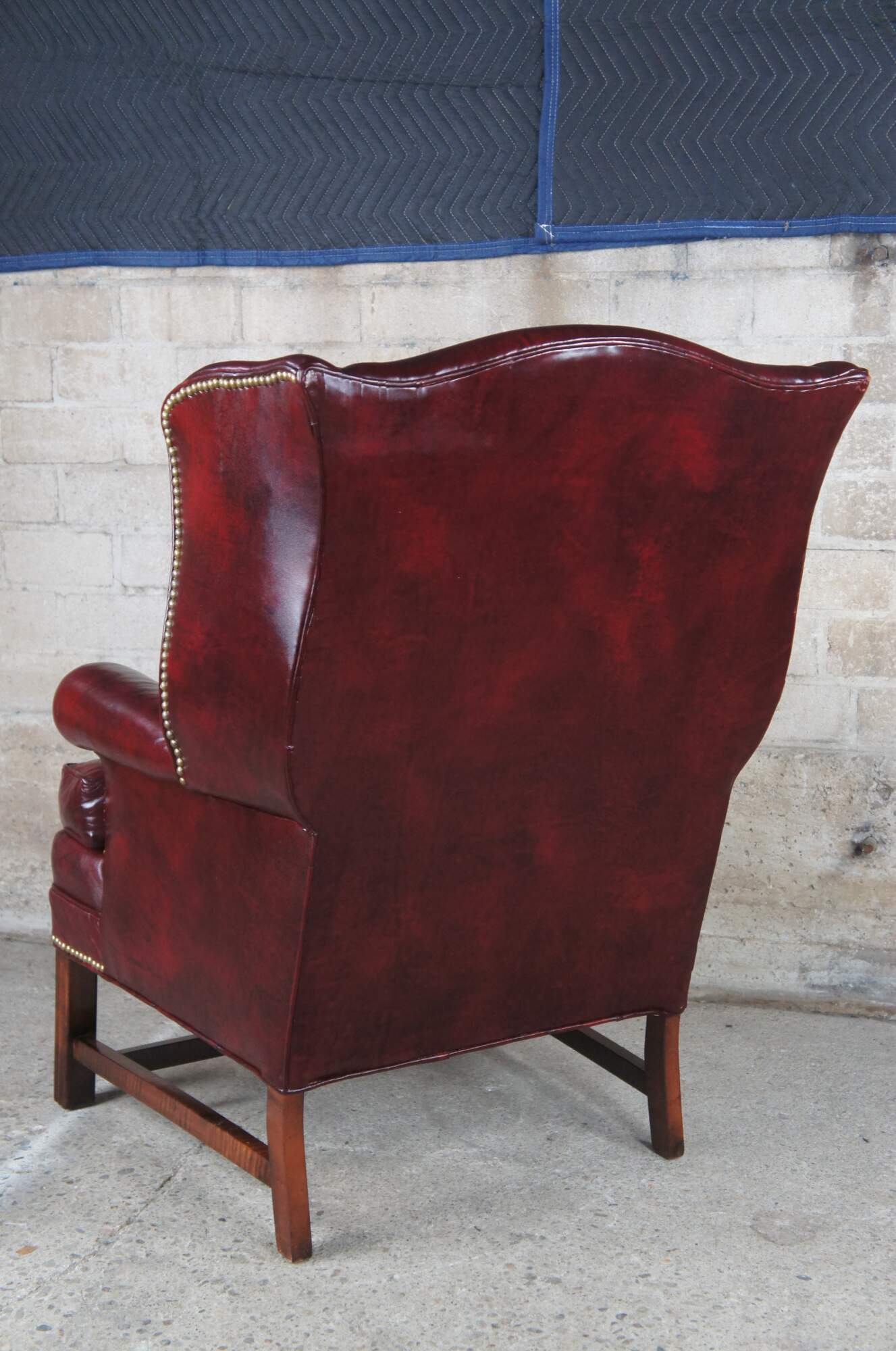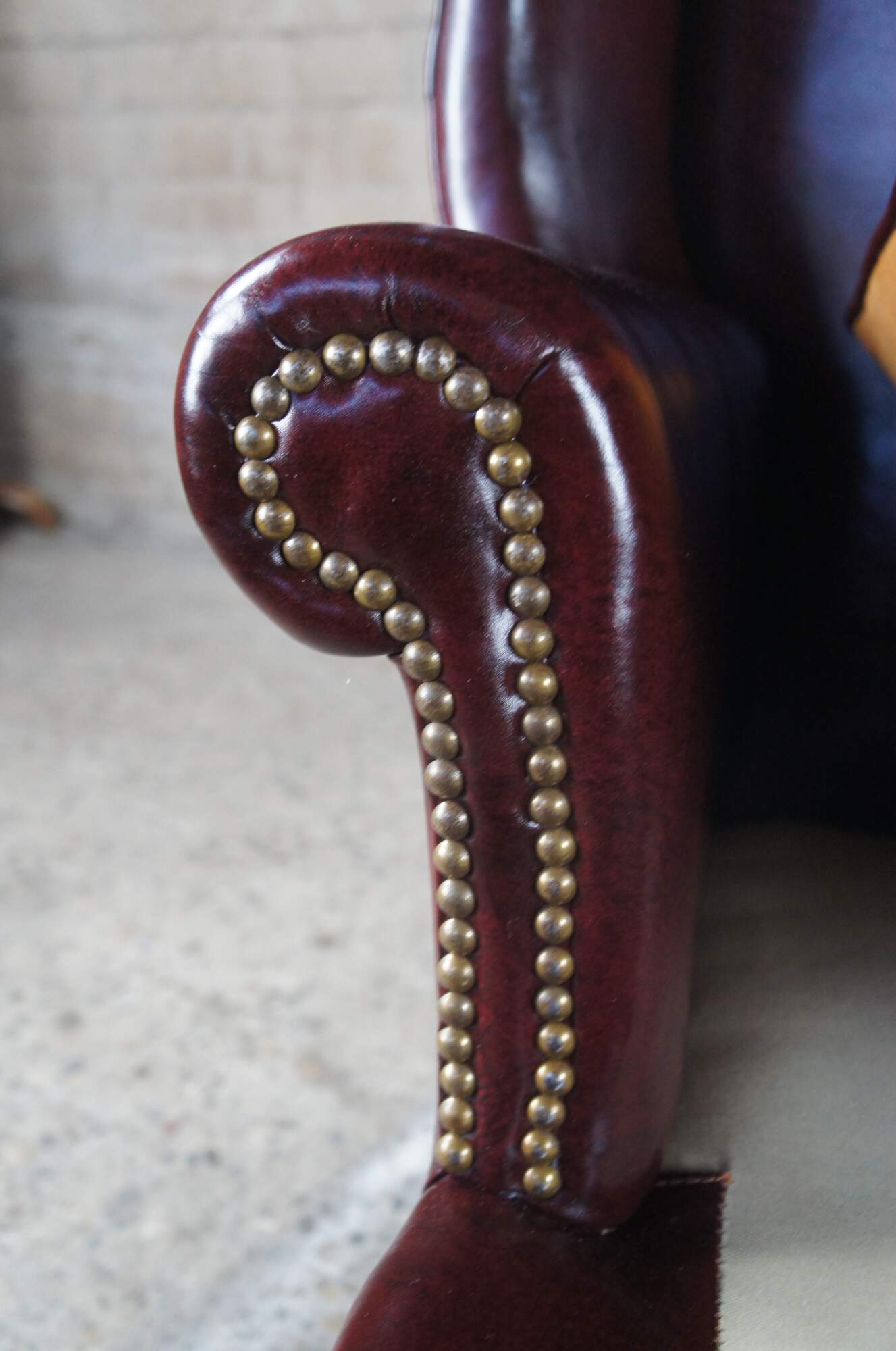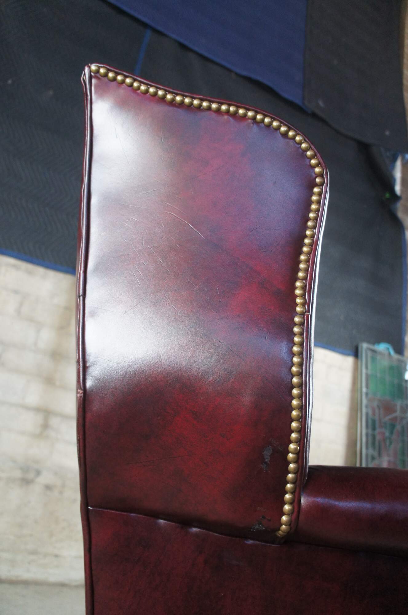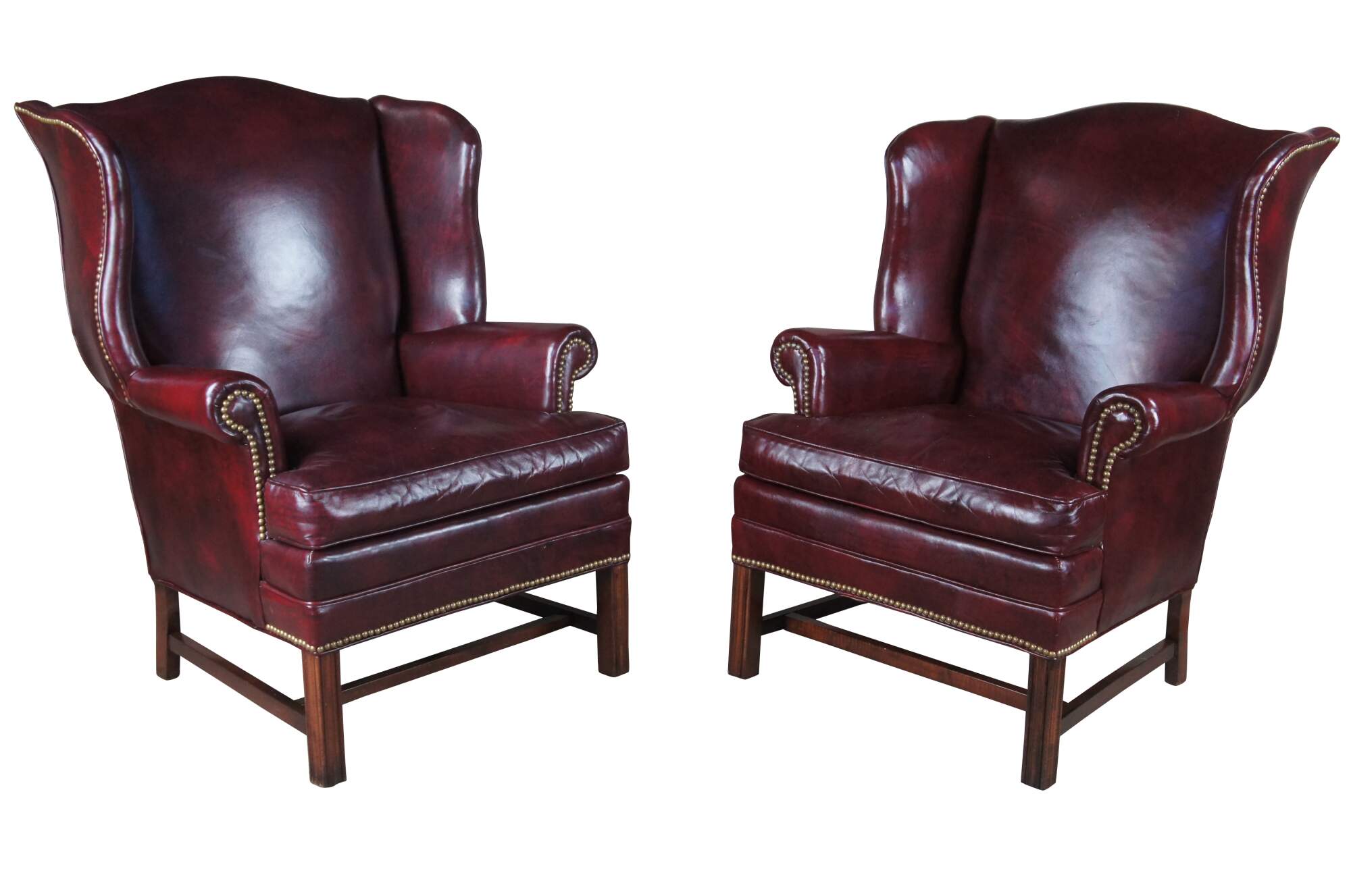 Vintage Bracewell Furniture Co leather wingback armchairs featuring serpentine Chippendale styling with dark red / burgundy leather, nailhead trim, rolled arms and mahogany legs. Conover North Carolina. Lackawanna Leather Co.
