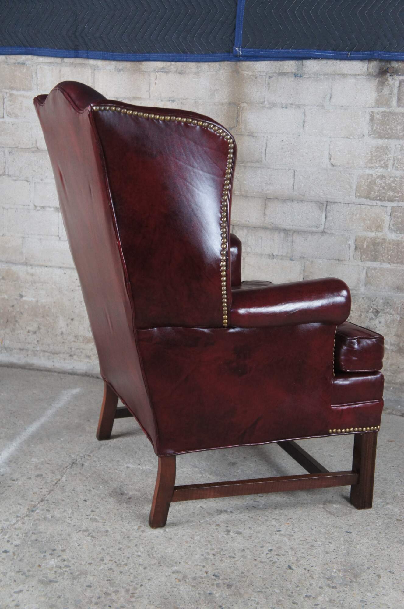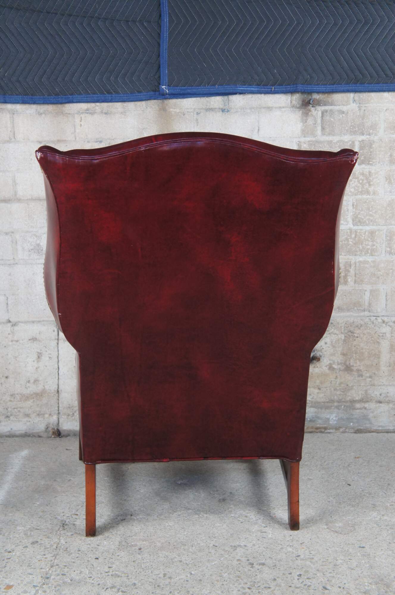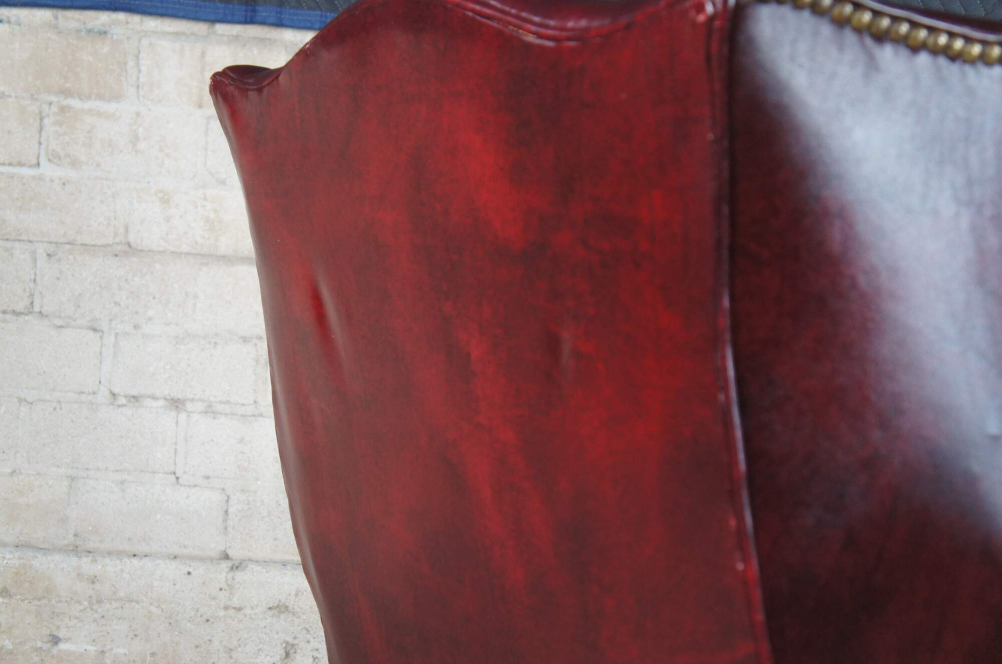 Vintage Bracewell Furniture Co leather wingback armchairs featuring serpentine Chippendale styling with dark red / burgundy leather, nailhead trim, rolled arms and mahogany legs. Conover North Carolina. Lackawanna Leather Co.