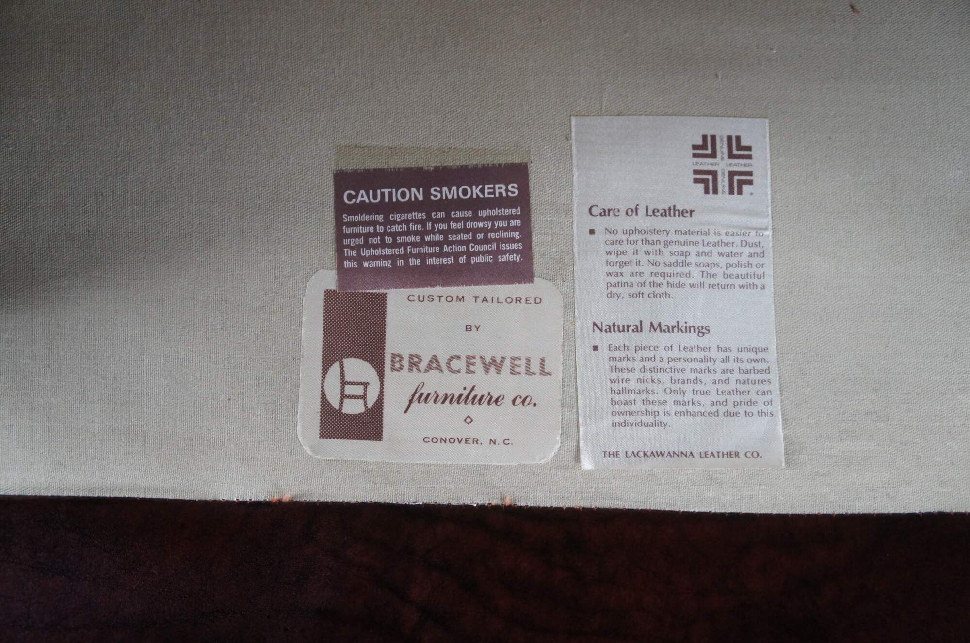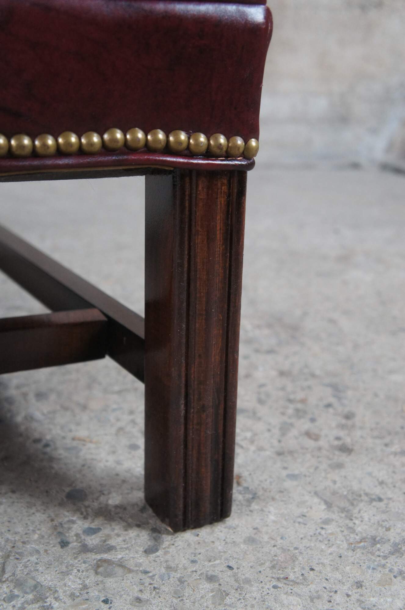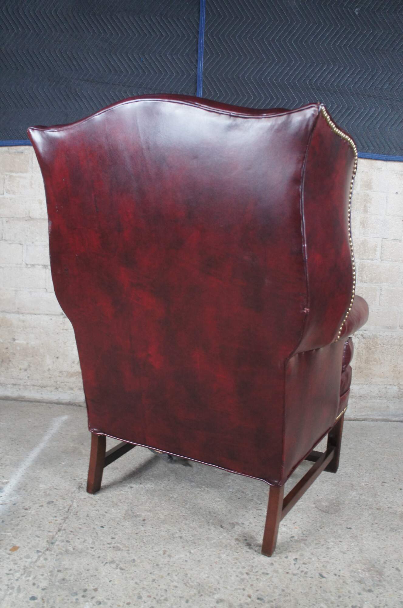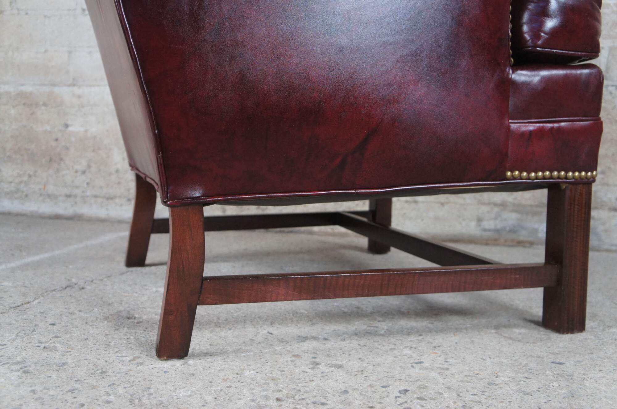 Vintage Bracewell Furniture Co leather wingback armchairs featuring serpentine Chippendale styling with dark red / burgundy leather, nailhead trim, rolled arms and mahogany legs. Conover North Carolina. Lackawanna Leather Co.