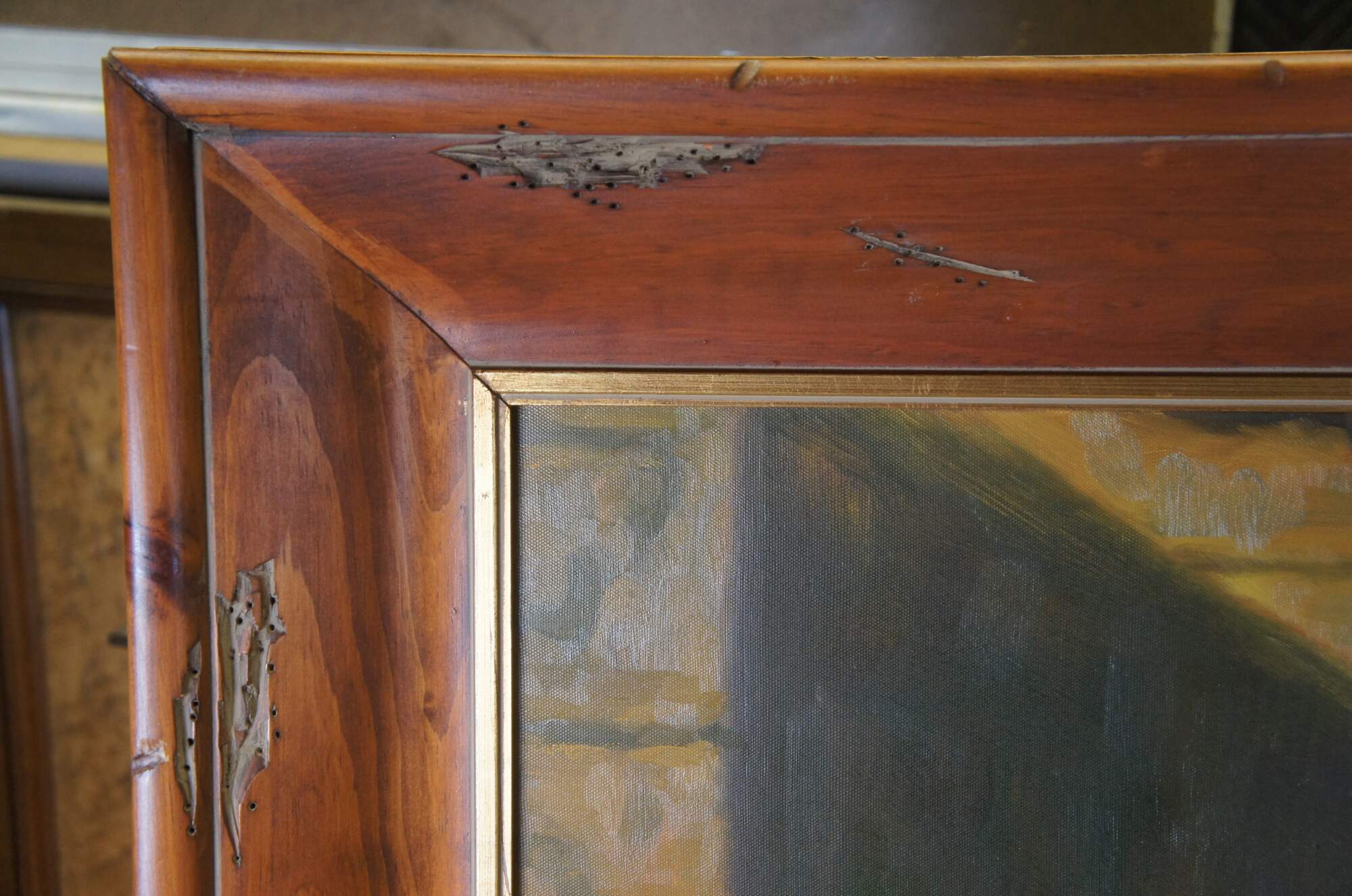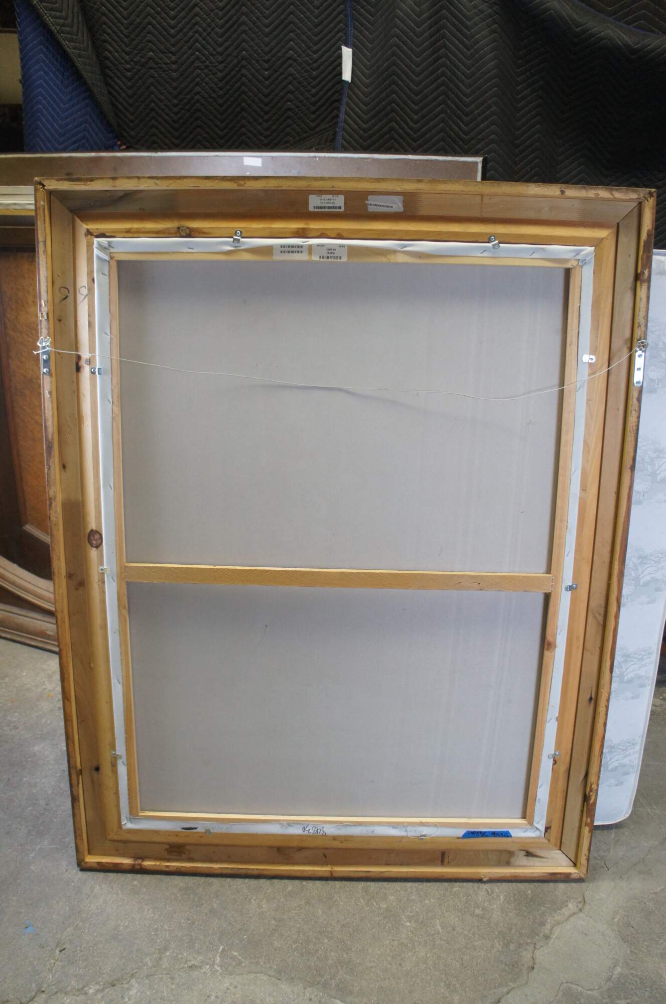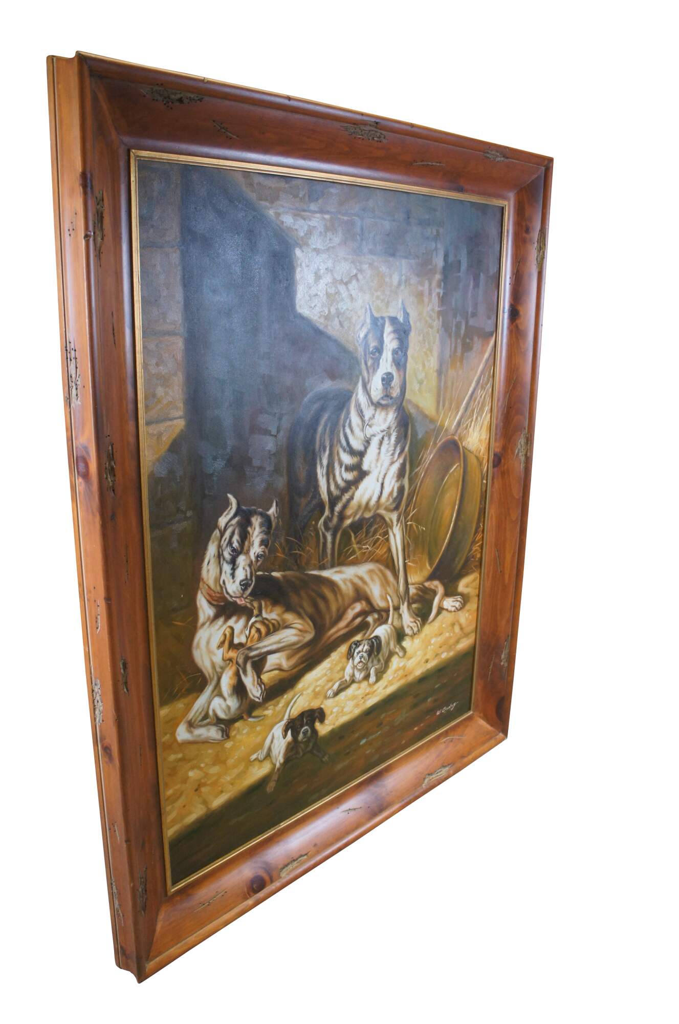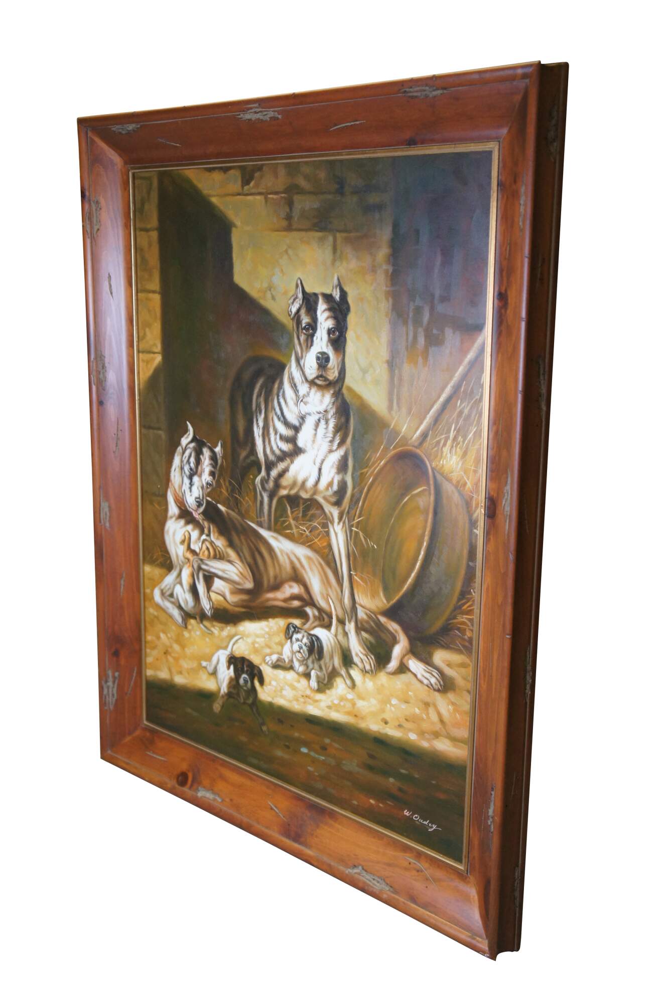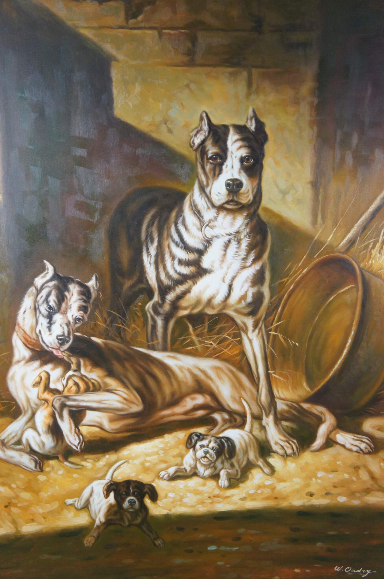 Large vintage W Oudry oil painting on canvas featuring an anthropomorphic Bulldog couple with thier young puppies. This piece was privately commissioned circa late 20th century. Framed in cherry pine frame with gold accents. W. Oudry (20th century) was active/lived in England. W Oudry is known for Sporting.