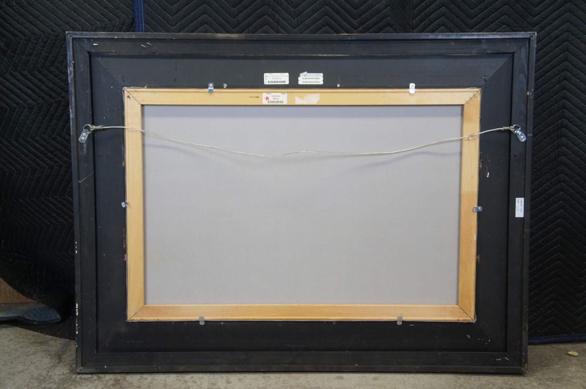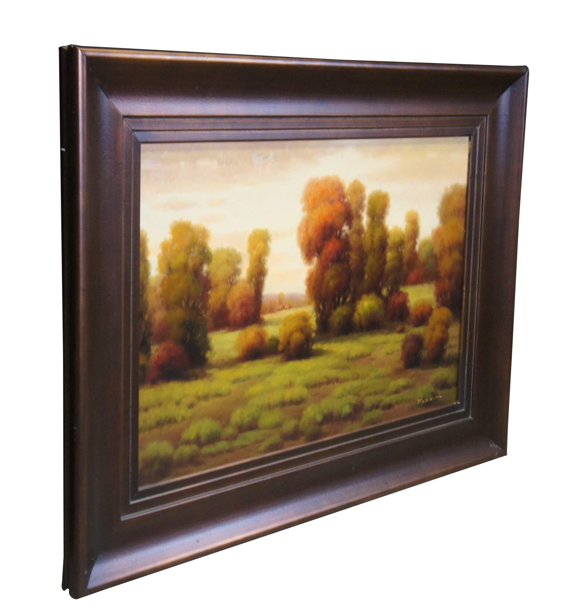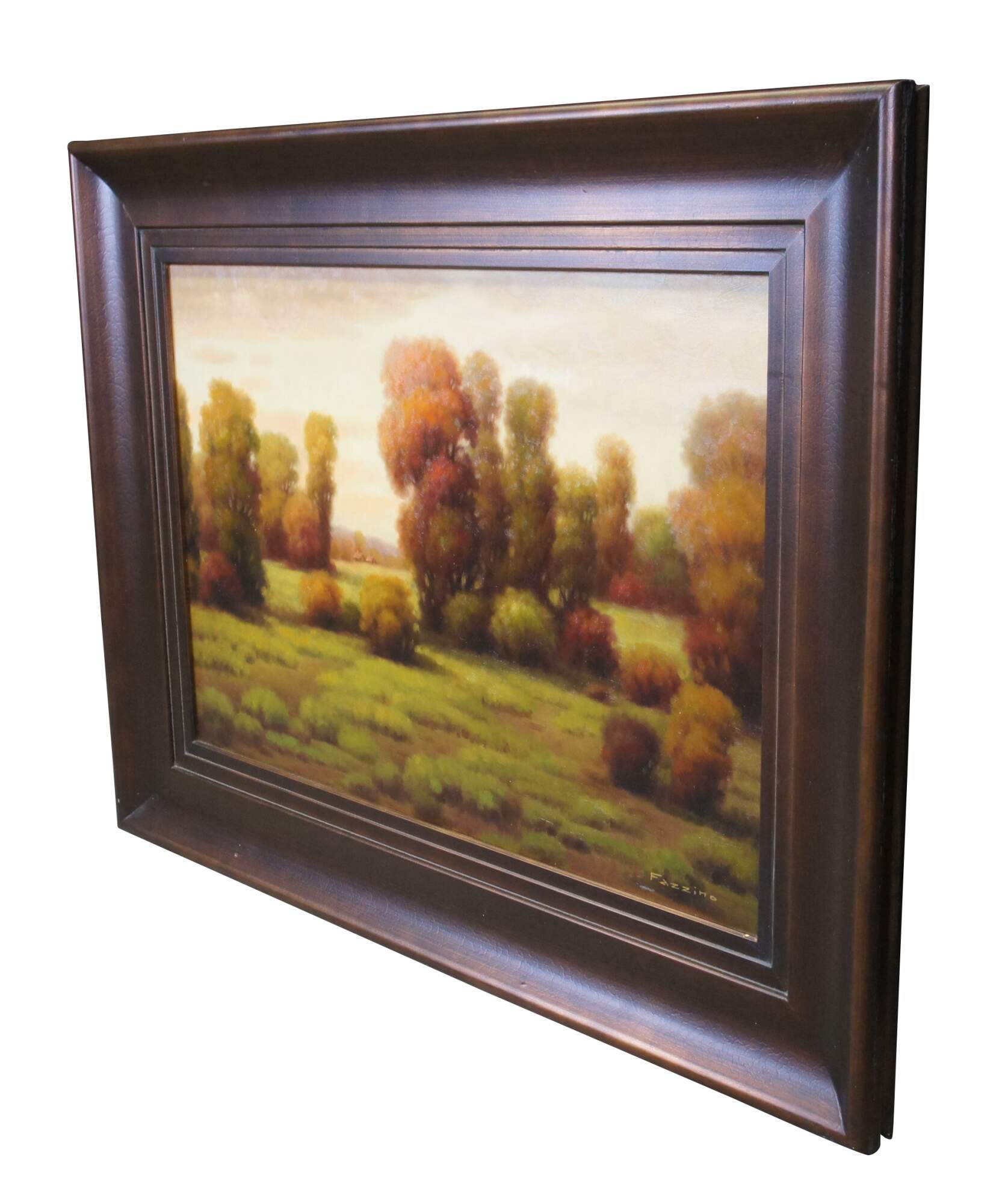 Large vintage oil painting on canvas featuring an impressionist countryside Autumn pastoral landscape. Framed in gold.