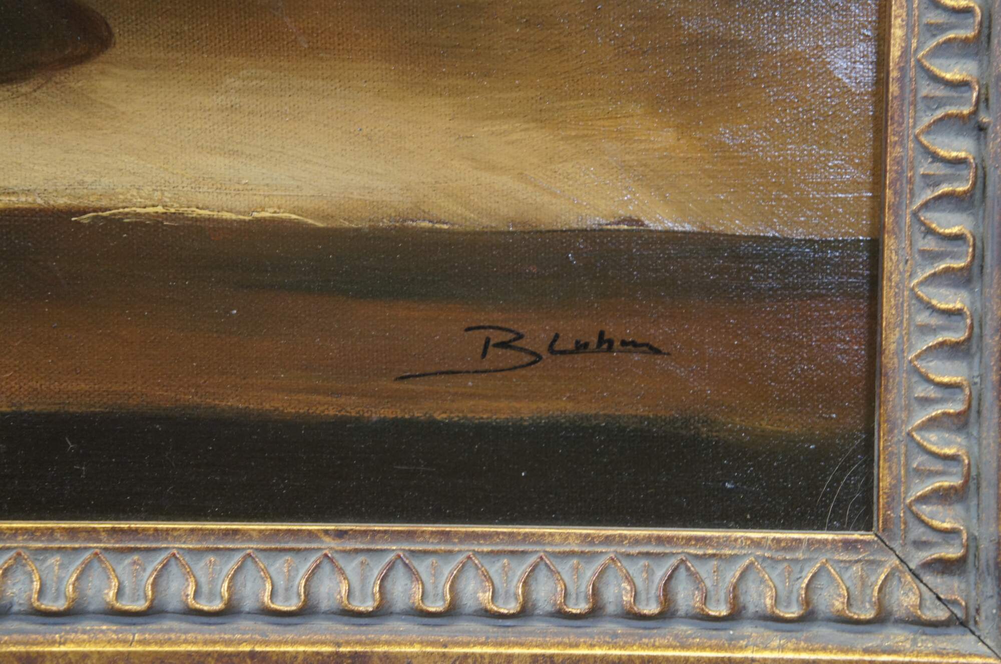 Vintage Bluhm still life oil painting on canvas featuring a bunny / rabbit next to a spread of lettuce, pears, peaches, gords / pumpkin, wine and grapevines on an old farmhouse table. Signed lower right. Framed in gold frame with leaves and floral motif.