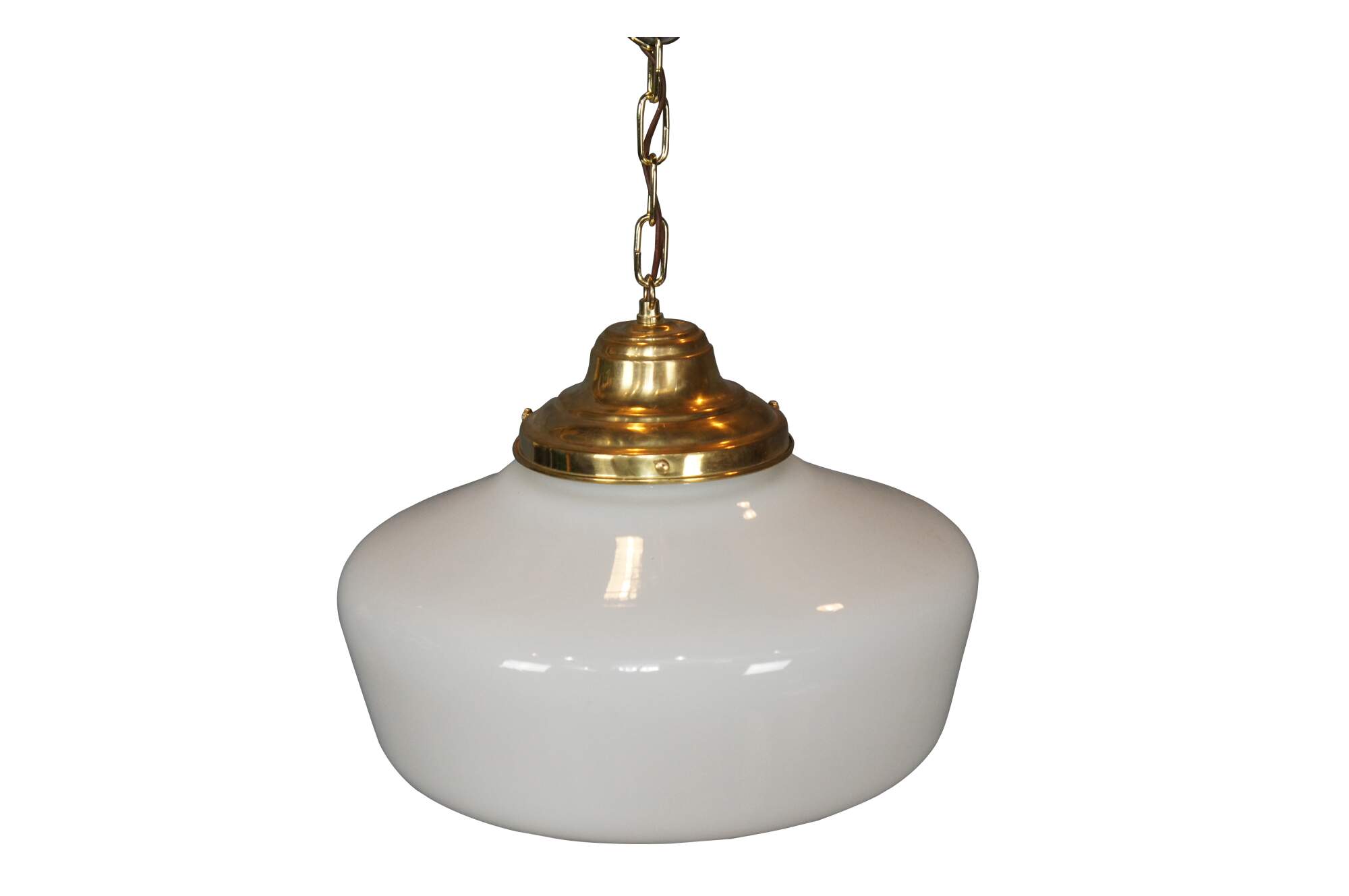 2 Available - vintage art deco style schoolhouse pendant light with brass caps and milk glass globe. Wired with plug.